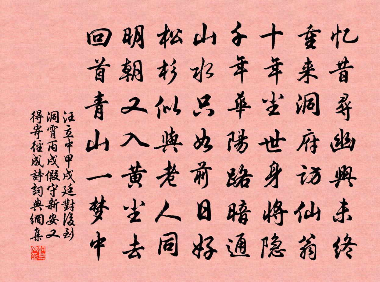 詩詞名句歷史字典書法欣賞書法字典國語詞典說文解字康熙字典古漢語字典標 題 作 者 詩 句 甲戌廷對後到洞霄丙戌假守新安又得寄徑成詩作者:汪立中 朝代:宋代原文憶昔尋幽興未終,重來洞府訪仙翁。十年塵世身將隱,千年華陽路暗通。山水只如前日好,松杉似與老人同。明朝又入黃塵去,回首青山一夢中。詩詞問答問:《甲戌廷對後到洞霄丙戌假守新安又得寄徑成詩》的作者是誰?答:汪立中問:該詩寫於哪個朝代?答:宋代書法欣賞甲戌廷對後到洞霄丙戌假守新安又得寄徑成詩書法作品詩文賞析【原題】:甲戌廷對後到洞霄丙戌假守新安又得寄徑成詩紀游詩詞推薦挽李尚書母太淑人黃榦〔宋代〕枌社傳家范,階庭著義方。能令鏘劍履,爭欲倚門牆。么麽真無用,提撕獨異常。登堂今已尖,收淚轉淋浪。張平叔家絲糕晁說之〔宋代〕君家絲糕何處絲,三月晴天蕩漾時。繭頭越女繰不得,卻煩素手與晨炊。客子千頭萬緒苦,方寸五紽誰得知。宮詞楊皇后〔宋代〕缺月流光入綺疏,金壺傅箭夢回初。秦台彩鳳無訊息,桂影空閒十二除。白雁李建勛〔唐代〕東溪一白雁,毛羽何皎潔。薄暮浴清波,斜陽共明滅。差池失群久,幽獨依人切。旅食賴菰蒲,單棲怯霜雪。邊風宴桃源·頻日雅歡幽會白居易〔唐代〕頻日雅歡幽會,打得來來越殺。說著暫分飛,蹙損一雙眉黛。無奈,無奈,兩個心兒總待。再呈趙倅王邁〔宋代〕委齋坐我以春風,不事拘攣邊幅中。俗子語言藏攫罕,丈夫胸腹等崆峒。虛舟相觸何心在,怒火雖炎一餓空。到底謁扶胥南海廟曾豐〔宋代〕南海大都會,扶胥拱聖王。卜靈終自顯,兩廟屹相望。香火夤緣在,河沙劫數長。昌黎韓子記,相與作存亡。喜遷鶯(春宴)趙善扛〔宋代〕韶華駘蕩。看化工盡力,安排春仗。薄霧霏煙,軟風輕日,物態與人交暢。鳥生弄巧千調,樓影垂空十丈。亂花柳五郊樂章舒和魏徵〔唐代〕千里溫風飄降羽,十枝炎景媵朱乾。陳觴薦俎歌三獻,拊石扌從金會七盤。雲露堂前杏花范成大〔宋代〕蠟紅枝上粉紅雲,日麗煙濃看不真。浩蕩光風無畔岸,如何鎖得杏園春。次韻王彥聲題梅氏草堂李彌遜〔宋代〕丘壑胸中自廣居,數椽茅屋小蝸廬。門羅莫謾驚烏鵲,戶外曾來長者車。杏花天高觀國〔宋代〕霽煙消處寒猶嫩。乍門巷、愔愔晝永。池塘芳草魂初醒。秀句吟春未穩。仙源阻、春風瘦損。又燕子、來無芳信。賢良馬叔度和周內翰送予粹越詩見貽次韻奉酬喻良能〔宋代〕一鳴一息幾千秋,風翼端宜汗漫遊。筆底珠璣誰得似,胸中雲夢復何求。談餘正始人加勝,詩比黃初語更遒。西笑秋思陸游〔宋代〕秋來情味更堪論,身寄城南五畝園。委轡看山無鐵獺,拾樵煎茗有青猿。陂塘夜雨添新漲,原野煙蕪減舊痕。豈是米元章賞心詩帖贊岳珂〔宋代〕金陵之賞心,天下之奇觀,真足以當南宮之詩翰。予之持節登覽大一旦,而得此詩八年之泮奐。吁嗟公兮,豈料百行香子(雲岩道中)辛棄疾〔宋代〕雲岫如簪。野漲挼藍。向春闌、綠醒紅酣。青裙縞袂,兩兩三三。把曲生禪,玉版句,一時參。拄杖彎環。過眼嵌達本王安石〔宋代〕未能達本且歸根,真照無知豈待言。枯木岩前猶失路,那堪春入武陵原。夢神人曰公當以是字名庵覺來賦是庵詩徐元傑〔宋代〕審是須防自是偏,四通八達路平平。伊周孔孟是心一,堯舜湯文是道傳。善惡正邪書里月,行藏用舍性中天。聖賢章釣仙吹鐵笛善醫眼與齒相說法尤高姚勉〔宋代〕嚴於治齒要如軍,治眼當如愛護民。此術盡堪為世用,釣魚船上豈無人。初秋暮雨楊萬里〔宋代〕禾穟輕黃尚淺青,村舂已報隔林聲。忽驚暮色翻成曉,仰見雙虹雨外明。名句推薦不 愛其親,豈能及物?姚思廉《陳書·列傳·卷十三》 翠蛾輕斂意沉吟,沾襟,無人知此心。孫光憲《河傳·花落》 從此信音稀,嶺南無雁飛。李師中《菩薩蠻·子規啼破城樓月》 銅鑄金鏞振紀綱,聲傳海外播戎羌。曹雪芹《交趾懷古》 羨青山有思,白鶴忘機。湯恢《八聲甘州·摘青梅薦酒》 交河城邊鳥飛絕,輪台路上馬蹄滑。岑參《天山雪歌送蕭治歸京》 太高人愈妒,過潔世同嫌。曹雪芹《紅樓夢·第五回》 起來搔首,梅影橫窗瘦。汪藻《點絳唇·新月娟娟》 凡是人,皆須愛。天同覆,地同載。李毓秀《弟子規·泛愛眾》 青山一道同雲雨,明月何曾是兩鄉。王昌齡《送柴侍御》