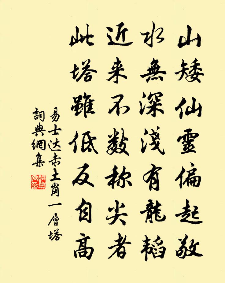 詩詞名句歷史字典書法欣賞書法字典國語詞典說文解字康熙字典古漢語字典標 題 作 者 詩 句 赤土崗一層塔作者:易士達 朝代:宋代赤土崗一層塔原文山矮仙靈偏起敬,水無深淺有龍韜。近來不數稱尖者,此塔雖低反自高。詩詞問答問:赤土崗一層塔的作者是誰?答:易士達問:赤土崗一層塔寫於哪個朝代?答:宋代易士達赤土崗一層塔書法欣賞赤土崗一層塔書法作品詩詞推薦別房太尉墓杜甫〔唐代〕他鄉復行役,駐馬別孤墳。近淚無乾土,低空有斷雲。對棋陪謝傅,把劍覓徐君。唯見林花落,鶯啼送客聞。送張如京知安肅軍歐陽修〔宋代〕相逢舊從事,新命忽臨戎。界上山河壯,軍中鼓角雄。朔風馳駿馬,寒雪射驚鴻。試取封侯印,何如筆硯功。欸乃詞蒲壽宬〔宋代〕白頭翁,白頭翁,江海為田魚作糧。相逢只可喚劉四,不受人呼劉四郎。上袁文昌知平江五首劉過〔宋代〕骨秀如仙孕武夷,故教手筆世宗師。隸分唐漢諸家字,句壓陳黃二子詩。茂苑雨晴花發處,洞庭霜重橘黃時。塵埃雄楚亭袁說友〔宋代〕江山萬里接西東,吳蜀咽喉此地中。奄宅荊州夸楚勢,此亭所以得稱雄。寄題胡基仲故居陸游〔宋代〕憶昔公來一束書,蕭然不復畜僮奴。浮雲每嘆成蒼狗,空谷誰能縶白駒?才氣沙麈埋巨闕,文章林壑吼於菟。旅墳慧日寺孔武仲〔宋代〕山外歸來酒半酣,衣襟翠色貯煙嵐。泉聲自是小三峽,林色可名東萬杉。江面深沉帶地流,清風爽氣入層樓。倚欄江月圖林之奇〔宋代〕冥冥一月輕,不知水與天。獨於顥氣中,仰見素璧圓。超然狂道士,起視清夜闌。自拈白玉笛,吹此江月寒。想當到三山陳宓〔宋代〕違鄉數驛肆馳驅,正是年華欲換時。山色萬家開戶牖,水錦十里列旌旗。物情欣泰隨方見,世態暄涼只自知。一別題寶林寺禪者壁(山名飛來峰)方乾〔唐代〕邃岩喬木夏藏寒,床下雲溪枕上看。台殿漸多山更重,卻令飛去即應難。同李十一醉憶元九白居易〔唐代〕花時同醉破春愁,醉折花枝作酒籌。忽憶故人天際去,計程今日到梁州。還靖師草屨王珉〔宋代〕跣足山行踐綠蕪,道人應念我崎嶇。還將達磨西歸履,暫作王喬羽化鳧。為愛輕鬆宜踏石,更憐蕭灑勝聯珠。還君喜雨呈安國張栻〔宋代〕向來惻怛哀矜意,便覺雨滿乾坤間。城東大士寧關汝,民倚邦侯如泰山。老景釋文珦〔宋代〕日月如飛梭,為我織老景。蒼艾浸成色,素絲颯垂領。短長任所裁,厚薄焉足省。善賈亦徒施,終然付泡影。示淳謙首座持缽釋原妙〔宋代〕千家萬家,總是維摩丈室。十斛百斛,無非達磨眼睛。若向遮里會得,何勞向外經營。其或未然,咄,酒肆淫坊休登楚野亭見張舍人題字張栻〔宋代〕英豪自昔多遺恨,人物於今正渺然。來訪舍人題字處,淡煙莎草滿平川。次漢英教授示和尹少稷韻四首汪應辰〔宋代〕頖宮夫子日扃門,厭聽兒曹說怨恩。猶念貧交無與樂,時流妙語到荒村。太府李萃卿輓詞張耒〔宋代〕妙譽馳場屋,家風在搢紳使華推厚德,卿月上通津。齒德時方重,山丘跡已陳。長年先友淚,懷感獨沾巾。杭州雜詩和林石田汪元量〔宋代〕吟身春共瘦,獨立望江亭。越水荒荒白,吳山了了青。軍降欣解甲,民喜罷抽丁。拍碎闌乾曲,吞聲血淚零。台中聽雪洪咨夔〔宋代〕淅瀝松廳夜,空山一樣聲。冰霜元自勁,水月更添清。衾薄難留夢,窗虛易得明。庭烏催奏墨,未曉已先鳴。名句推薦樓倚霜樹外,鏡天無一毫。杜牧《長安秋望》 感時花濺淚,恨別鳥驚心。杜甫《春望》 海風吹不斷,江月照還空。李白《望廬山瀑布水二首》 易求無價寶,難得有心郎。魚玄機《贈鄰女 / 寄李億員外》 初驚河漢落,半灑雲天裡。李白《望廬山瀑布水二首》 東風有信無人見,露微意、柳際花邊。蘇軾《一叢花·今年春淺侵年》 法莫如顯,而術不欲見韓非及後人《韓非子·難三》 清明又近也,卻天涯為客。曹組《憶少年·年時酒伴》 手種黃柑二百株,春來新葉遍城隅。柳宗元《柳州城西北隅種柑樹》 欲知方寸,共有幾許清愁,芭蕉不展丁香結。賀鑄《石州引·薄雨初寒》