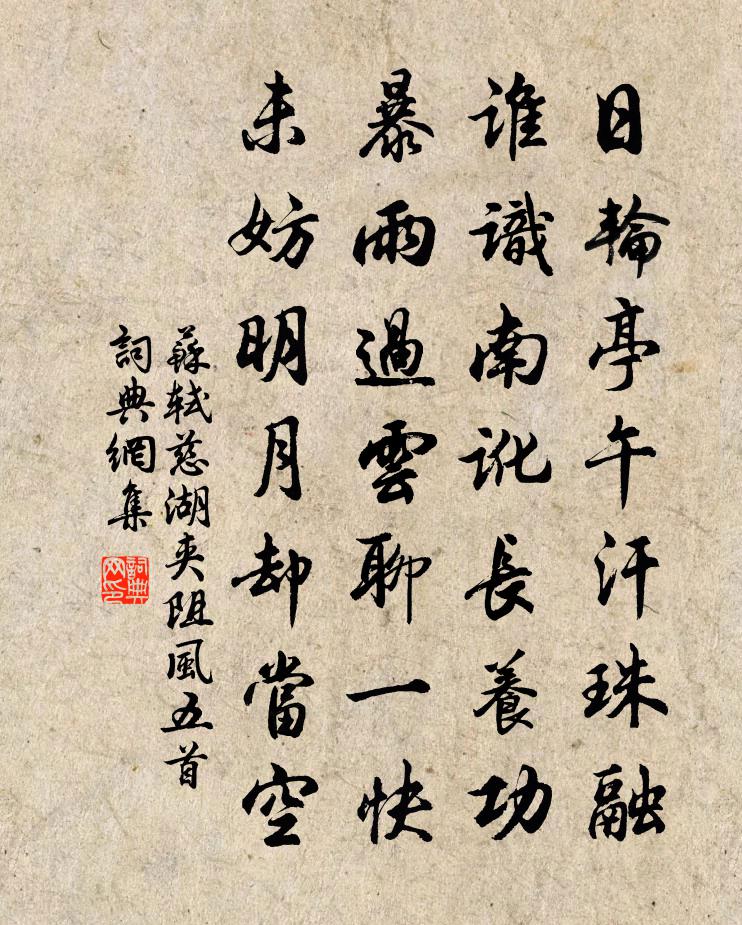 詩詞名句歷史字典書法欣賞書法字典國語詞典說文解字康熙字典古漢語字典標 題 作 者 詩 句 慈湖夾阻風五首作者:蘇軾 朝代:宋代慈湖夾阻風五首原文日輪亭午汗珠融,誰識南訛長養功。暴雨過雲聊一快,未妨明月卻當空。詩詞問答問:慈湖夾阻風五首的作者是誰?答:蘇軾問:慈湖夾阻風五首寫於哪個朝代?答:宋代問:蘇軾的名句有哪些?答:蘇軾名句大全蘇軾慈湖夾阻風五首書法欣賞慈湖夾阻風五首書法作品詩詞推薦寄周吉卿仇遠〔宋代〕四壁寒蛩已可憐,一庭風露轉悽然。杜陵便是歸來早,也有荒閒負郭田。句趙企〔宋代〕幾夜已生蝴蝶夢,三年辜負鷓鴣班。上運管張平國華岳〔宋代〕雙峰十月客辭家,廷老相期下九華。檢早不逢陶靖節,喚船同過鯉魚沙。落成王朝奉廟以薄恙不獲預謝謝劉宰並諸鄉丈陳傅良〔宋代〕卻向平時念後艱,榱題百尺忽如山。誰將西上逢人問,令尹何如此一班。晚坐和韻仲並〔宋代〕篇篇振玉妙玲瓏,字字春風和氣中。安得居家無一事,搜吟日日與君同。夢豐宅之二首劉克莊〔宋代〕一別茫茫隔九京,夢中慷慨語如生。老猶奮筆排和議,病尚登陴募捄兵。天奪偉人關氣數,時無好漢共功名。殘胡薛子舒墓葉適〔宋代〕悒悒西門路,樵歌占晚雲。燐迷王弼宅,蒿長孟郊墳。少病憐醫錯,題書與父分。又言重把筆,兼欲使余聞。初歸筠莊蘇粹之以詩見貽次韻答之二首李彌遜〔宋代〕它年同上楚江樓,花繞春城小謝州。翻手雨雲人事改,跳丸日月歲光流。霜空暮落能鳴雁,秋水風移不擊舟。偶築頌古三十二首釋明辯〔宋代〕獵涉榮枯未是奇,到頭誰是出家兒。故鄉漠漠無訊息,時有孤雲嶺外歸。水調歌頭(處州煙雨樓落成,欲就中秋,後值雨)李處全〔宋代〕樓觀數南國,煙雨壓東州。溪山雄勝,天開圖畫肖瀛洲。我破瀛洲客夢,來剖仙洲符竹,樂歲又雲秋。聊作幻師戲送趙紫芝入金陵幕薛師石〔宋代〕為官亦僦居,官況定何如。昨夜交遊散,滿湖秋雨疎。此邦佳麗久,舊事拜參初。喜是賢侯幕,新年有薦書。頌四賓主釋印肅〔宋代〕賓中賓,借錢沽酒設狂人。常常負債無依倚,謗教虛招地獄因。摸魚兒吳潛〔宋代〕滿園林、瘦紅肥綠,休休春事無幾。杜鵑喚起三更夢,窗外露澄風細。渾不寐。但目看、一簾夜月移花未。推衾自採菊詩袁宏〔魏晉〕息足回阿。圓坐長林。披榛即澗。藉草依陰。寄國子楊巨源祭酒姚合〔唐代〕日日新詩出,城中寫不禁。清高疑對竹,閒雅勝聞琴。門戶饒秋景,兒童解冷吟。雲山今作主,還借外人尋。旅中有感復有前韻陳棣〔宋代〕擿埴憑誰為指南,囊空羞澀不容探。年光有限堂堂去,世事無心細細參。故舊白頭驚未識,比隣青眼喜相諳。此生偈三首釋道昌〔宋代〕道不屬知,不屬不知。知是妄覺,不知是無記。若真達不疑之道,礙他銅盤不打老鼠。所以抽身入,還從屋裡來。黃州上已和王子方雪堂韻李曾伯〔宋代〕五年安出處,斯道系污隆。血指笑餘子,頭顱老此公。屋樑懸落月,花卉帶香風。生氣鎮長在,大江流不窮。王誠之分惠臥龍新茶數語為謝虞儔〔宋代〕臥龍驤首奮輕雷,一一槍旗次第開。遽浼春風歸七碗,寧容卯酒困三杯。森嚴莫訝先嘗苦,雋永方知後味回。不羨雨後極涼料簡篋中舊書有感陸游〔宋代〕日昳小雨不至晡,雨雖未足涼有餘。細泉泠泠咽幽竇,清風策策驚高梧。笠澤老翁病甦醒,欣然起理西齋書。十年名句推薦夜中不能寐,起坐彈鳴琴。阮籍《詠懷八十二首·其一》 故聖人為法,必使之明白易知,名正,愚知遍能知之商鞅《商君書·定分》 茶有九難:一曰造,二曰別,三曰器,四曰火,五曰水,六曰炙,七曰末,八曰煮,九曰飲。陸羽《茶經·六之飲》 春陰垂野草青青,時有幽花一樹明。蘇舜欽《淮中晚泊犢頭》 寒氣先侵玉女扉,清光旋透省郎闈。李商隱《對雪二首》 人面不知何處去,桃花依舊笑春風。崔護《題都城南莊》 集中什九從軍樂,亘古男兒一放翁。梁啓超《讀陸放翁集》 若為化得身千億,散上峰頭望故鄉。柳宗元《與浩初上人同看山寄京華親故》 未知生,焉知死?孔子弟子《論語·先進篇》 漢甲連胡兵,沙塵暗雲海。李白《經亂離後天恩流夜郎憶舊遊書懷贈江夏韋太守良宰》