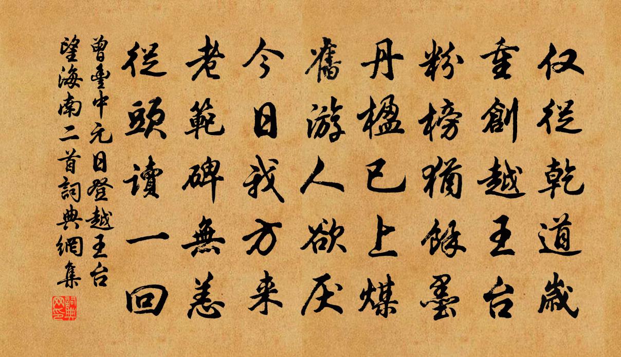 詩詞名句歷史字典書法欣賞書法字典國語詞典說文解字康熙字典古漢語字典標 題 作 者 詩 句 中元日登越王台望海南二首作者:曾豐 朝代:宋代中元日登越王台望海南二首原文僅從乾道歲,重創越王台。粉榜猶餘墨,丹楹已上煤。舊遊人慾厭。今日我方來。老范碑無恙,從頭讀一回。詩詞問答問:中元日登越王台望海南二首的作者是誰?答:曾豐問:中元日登越王台望海南二首寫於哪個朝代?答:宋代曾豐中元日登越王台望海南二首書法欣賞中元日登越王台望海南二首書法作品詩詞推薦過臨平蓮盪四首楊萬里〔宋代〕蓮盪中央劣露沙,上頭便著野人家。籬邊隨處插垂柳,檐下小船縈釣車。賀天童滅公和尚釋紹曇〔宋代〕老饕八十再生牙,爛嚼虛空吐出滓。點綴玲瓏岩下草,枝枝葉葉是曇花。謹次府判朝議江公之韻游陽華陳邦慶〔宋代〕斷崖藏勝境,別是一壺天。怪石垂雲乳,飛虹跨玉泉。丹青難下筆,造化不知年。文字工題品,漫郎優史遷。漁家傲梵琦〔元代〕聽說娑婆無量苦。風前陡覺雙眉豎。貪慾如狼嗔猛虎。魔軍主。張弓架箭痴男女。日月往來寒又暑。乾坤開合晴還贈別饒雲叟赴萬州教官鄧深〔宋代〕話別喔詩當酒甌,竹萌成筍麥方秋。數聲春後呼風鳥,百丈朝來送浪舟。已得通津好訊息,何妨舊物小淹留。到官七十翁吟七言十首方回〔宋代〕神奇臭腐變窮通,宇宙紛紜醉眼中。鄧禹第堪文學掾,劉歆早作國師公。干戈世故千岐異,禮樂民彝萬古同。造化石菊史鑄〔宋代〕花美雖堪寫團扇,艷妖未必入東籬。紀名何取它山物,偏問園官總不知。留題積善院許將〔宋代〕為愛山居樂,居山又憶家。菊黃來日蕊,梅白去時花。水闊離情遠,霜晴別恨賒。前程回首望,空指暮天霞。更漏子晏幾道〔宋代〕露華高,鳳信遠。宿醉畫簾低卷。梳洗倦,冶遊慵。綠窗春睡濃。彩條輕,金縷重,昨日小橋相送。芳草恨,落花偈頌十八首釋如淨〔宋代〕萬派朝宗一派收,揚清激濁幾經秋。忽然到底都乾卻,露柱燈籠笑不休。月下作陸游〔宋代〕畏暑不巾襪,步月榰短筇,瘦身發鬅鬙,顧影如孤松。徑幽螢闔開,池漲魚噞喁。飛泉穿北垣,珠玉相撞舂。東湖醉歌汪元量〔宋代〕伯顏丞相呂將軍,收了江南不 * 。昨日太皇請茶飯,滿朝朱紫盡降臣。弟觀為眾奉里神于丹山僧舍有五絕因趁韻陳著〔宋代〕一卷新吟水石香,頓教塵濁變清涼。喚醒心下十年夢,拜舞薰風面舜廊。晨謁書所見宋庠〔宋代〕紺幰鳴珂萬蓋翔,九門冠劍擁晨光。城連南北長安斗,殿倚東西太極堂。雲里銅烏風作籟,天邊金掌露成霜。微生賦梅堂閒吟陳宓〔宋代〕金掌何人吸露華,爭如瓦盞泛霜花。移床來傍花邊坐,底用雲嵐頂上家。句來鵠〔唐代〕回眸綠水波初起,合掌白蓮花未開。踏青游佚名〔宋代〕竹外溪邊,一枝破寒衛臘。瑩素肌、玉雕冰刻。賦閒標,足餘韻,豈同常格。最風流,生來處處盡好,別得造化工海上作陸游〔宋代〕厭逐紛紛兒女曹,掛帆江海寄吾豪。鯨吞鼉作渾閒事,要看秋濤天際高。踏莎行秦觀〔宋代〕曉樹啼鶯,晴洲落雁。酒旗風颭村煙淡。山田過雨正宜耕,畦塍處處春泉漫。踏翠郊原,尋芳野澗。風流舊事嗟雲圩丁詞十解楊萬里〔宋代〕岸頭石板紫縰橫,不是修圩是築城。傅語赫連莫烝士,霸圖未必賽春耕。名句推薦亂山殘雪夜,孤燭異鄉人。崔塗《除夜 / 巴山道中除夜書懷 / 除夜有懷》 佳人獨立相思苦。薄袖欺寒脩竹暮。劉鎮《玉樓春·東山探梅》 帆影依依楓葉外,灘聲汩汩碓床間查慎行《雨過桐廬》 舍南舍北皆春水,但見群鷗日日來。杜甫《客至》 心者修裔之根,未有根不植而枝葉榮茂者。洪應明《菜根譚·概論》 動失之繁,靜失之寡。王通《中說·卷十·關朗篇》 秋風蕭瑟,洪波湧起。曹操《觀滄海 / 碣石篇》 因風吹火,用力不多。佚名《增廣賢文·上集》 黃鶯不語東風起,深閉朱門伴舞腰。溫庭筠《楊柳八首·其三》 老去逢春如病酒,唯有,茶甌香篆小簾櫳。辛棄疾《定風波·暮春漫興》