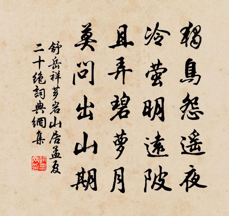 詩詞名句歷史字典書法欣賞書法字典國語詞典說文解字康熙字典古漢語字典標 題 作 者 詩 句 薌岩山居孟夏二十絕作者:舒岳祥 朝代:宋代薌岩山居孟夏二十絕原文獨鳥怨遙夜,冷螢明遠陂。且弄碧蘿月,莫問出山期。詩詞問答問:薌岩山居孟夏二十絕的作者是誰?答:舒岳祥問:薌岩山居孟夏二十絕寫於哪個朝代?答:宋代舒岳祥薌岩山居孟夏二十絕書法欣賞薌岩山居孟夏二十絕書法作品詩詞推薦泛江玩月十二韻元稹〔唐代〕楚塞分形勢,羊公壓大邦。因依多士子,參畫盡敦厖。岳璧閒相對,荀龍自有雙。共將船載酒,同泛月臨江。遠樹和承旨學士喜資政侍郎休退五絕宋祁〔宋代〕南闕騰章歸老初,安輪四馬照中都。不知誰在東門外,解道賢哉此丈夫。木蘭花慢 秦淮,次湯碧山教授韻許有壬〔元代〕問東來何處,控吳越,壯江淮。愛十里縈紆,水雲圖畫,鼓吹風雷。回頭下臨無地,盡朱樓迢隔倚天開。酒旆高懸寄鄉中親舊陳造〔宋代〕攜書憶上上江船,捻指官曹欲二年。白傅病多空自嘆,老坡仙去卻虛傳。人生修短庸非命,我判浮休不問天。來歲題山寺扉王安石〔宋代〕口銜天憲手持鈞,已是龍墀第一人。回首三千大千界,此身猶是一微塵。隱靜山二首韓元吉〔宋代〕山鎖松行一逕遙,峰迴樓殿更岧嶢。飛來雙鶴知何處,只有泉聲下碧霄。八十吟十絕劉克莊〔宋代〕逃秦博士浮丘伯,傳說今猶在海中。自古仙多儒者做,安知吾不躡高風。喜雪吳芾〔宋代〕雪意初疑作不成,才飛數片又還晴。正思潤澤沾千里,忽見繽紛滿一城。凋郡共欣消沴氣,老農相慶沸歡聲。我將求志書院詩四首陳師道履常之所居也李廌〔宋代〕君氣久已浩,君志復何求。同聲久絕和,一見忘百憂。藜藿鄙膏粱,絺綌傲孤裘。德輝下可覽,安用翔九州。題方乾詩羅隱〔唐代〕中間李建州,夏汭偶同游。顧我論佳句,推君最上流。九霄無鶴板,雙鬢老漁舟。世難方如此,何當浣旅愁。十月九日與客飲忽記去年此時自錦屏歸山南道陸游〔宋代〕去年縱獵韓壇側,玉鞭自探南山雪。今年痛飲蜀江邊,金杯卻吸峨眉月。竹枝歌舞新教成,悽怨傳得三巴聲。城頭東坡在惠州窘於衣食以重九近有樽俎蕭然之嘆趙蕃〔宋代〕四皓逃商山,下視衣褐婁。不知建成客,孰與封君酬。夷齊古逸民,食粟猶恥周。何曾墮人計,圖安卒成憂。不然龍尾硯歌(並引)蘇軾〔宋代〕余舊作《鳳咮石硯銘》,其略云:蘇子一見名鳳咮,坐令龍尾羞牛後。已而求硯於歙,歙人云:子自有鳳咮,何以筠州曾使君寄貺中州新芽賦此以謝張栻〔宋代〕日長燕寢無公事,忽憶故人云水邊。包裹甘芳慰幽獨,使君風味故依然。絕句楊冠卿〔宋代〕東閣官梅已退妝,遠村沙柳發新黃。遙知歸去西江路,定有飛花觸地香。送杭州使君蘇內相先生某用先生舊詩方丈仙人李廌〔宋代〕吳越控島夷,東南一都會。淫風舊倡靡,懦俗無慷慨。除弊在躬行,報政可立待。類非俗吏能,千齡樹遺愛。驀山溪朱敦儒〔宋代〕夜來雨過,桃李將開遍。策杖引兒童,也學人、隨鶯趁燕。青天許大,多少好風光,一歲去,一春來,只恁空擾亂滿庭芳 寄段錄事孫助教道友等馬鈺〔元代〕諸公學道,略聽予言。如同乾句家緣。試看登桿踏索,走馬行船。何曾說辛道苦,遇艱難、轉轉心堅。忘危險,更送朱郎中得謝歸淮南二首強至〔宋代〕一束衣冠四十春,公今收得自由身。朱顏出仕看同輩,白髮歸榮有幾人。何處覓金分素里,只聞行路羨清塵。扁舟次韻唐彥猷華亭十其四始皇馳道王安石〔宋代〕穆王得八駿,萬事得期修。茫茫萬載間,復此好遠遊。車輪與馬跡,此地亦嘗留。想當治道時,勞者屍如丘。名句推薦春愁凝思結眉心,綠綺懶調紅錦薦。顧敻《玉樓春·拂水雙飛來去燕》 兵強勝人,人強勝天佚名《逸周書·卷三·文傳解》 漢將歸來虜塞空,旌旗初下玉關東。戎昱《塞下曲》 何時詔此金錢會,暫醉佳人錦瑟旁。杜甫《曲江對雨》 喧鳥覆春洲,雜英滿芳甸。謝朓《晚登三山還望京邑》 當關不報侵晨客,新得佳人字莫愁。李商隱《富平少侯》 治大國,若烹小鮮。老子《老子·德經·第六十章》 操吳戈兮被犀甲,車錯轂兮短兵接。屈原《國殤》 想牧之、千載尚神遊,空山冷。吳潛《滿江紅·齊山繡春台》 此馬非凡馬,房星本是星。李賀《馬詩二十三首·其四》