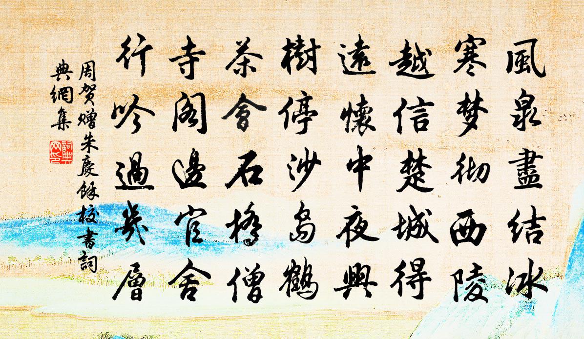詩詞名句歷史字典書法欣賞書法字典國語詞典說文解字康熙字典古漢語字典標 題 作 者 詩 句 贈朱慶餘校書作者:周賀 朝代:唐代贈朱慶餘校書原文風泉盡結冰,寒夢徹西陵。越信楚城得,遠懷中夜興。樹停沙島鶴,茶會石橋僧。寺閣邊官舍,行吟過幾層。詩詞問答問:贈朱慶餘校書的作者是誰?答:周賀問:贈朱慶餘校書寫於哪個朝代?答:唐代周賀贈朱慶餘校書書法欣賞贈朱慶餘校書書法作品注釋全唐詩:卷503-41詩詞推薦立之臨別連以佳篇見貺依韻和酬強至〔宋代〕建溪夫子惠新詩,雅道深慚未得知。曲享鶢鶋真過矣,吟成款段復何之。日斜留煮山家茗,煙重愁燃客舍萁。我系道中遇雨高斯得〔宋代〕車中書鑒書罷,書舉頭失青書山。五百書無纖雲,春晴固應慳。須臾驟雨過,忽已羅青鬟。天公自知我,所遇無不寄韓丈項安世〔宋代〕送別扁舟上,相望一水間。酒杯思共把,棋局定長閒。雅量容陂闊,私心豈石頑。夢隨漚鳥去,時過紫金山。南歌子万俟詠〔宋代〕梅夏暗絲雨,麥秋扇浪風。香蘆結黍趁天中。五日淒涼今古、與誰同。晚釋文珦〔宋代〕殘陽下西岑,暝色起平坂。林下一僧歸,鐘聲煙際遠。書法蟹方後陳造〔宋代〕放麑念號鳴,易牛憐觳觫。仁心誰獨無,天機或待觸。悠悠寄宇宙,往往狥口腹。君子一飽適,庖事不到目。寧知訪琳老題溪上小軒毛滂〔宋代〕小檻閒風物,高僧秀肺腸。隔溪通竹色,開戶納山光。撥雪晨蔬瘦,燒松午茗香。淵明歸賦急,聊復此徜徉。立春日山行汪莘〔宋代〕遠山殘雪獻年華,翠黛千層蹙浪花。天上畫屏描不得,懶移皮屐下鄰家。破冢二首王安石〔宋代〕殘槨穿來欲幾春,蕭蕭長草沒騏驎。墦間或有樵蘇客,未必他年醉飽人。湖南午坐雨作歸山堂共成四絕句張鎡〔宋代〕西山俄起一聲雷,不覺如拳雨點來。滴遍池中萬荷葉,又催檐蔔海榴開。酬陳齊民見奇种放〔宋代〕竹扉常晝掩,幽僻置身安。自委漁樵分,因思出處難。周庭方設燎,漢將尚封壇。莫問漁樵意,人寰事萬端。駐馬聽佚名〔宋代〕雕鞍成謾駐。望斷也不歸,院深天暮。倚遍舊日,曾共憑肩門戶。踏青何處所,想醉拍、春衫歌舞。征旆舉。一步題胡女騎周文璞〔宋代〕燕山雪花一尺飛,胡人胡女夜打圍。海東青過流沙西,黃頭郎主獨自歸。創殘狐兔懸氈車,疲憊鷹犬聞笳悲。君不梅花喜神譜爛熳二十八枝宋伯仁〔宋代〕紫陌暖風細,露房山更深。蜜甜不知味,萬花空損心。憶越州晏殊〔宋代〕鑑湖清澈秦望高,涵虛逗碧供吟毫。當日醉眼倚空闊,三江七澤才容舠。水調歌頭(己酉宿樟原驛得雨)李曾伯〔宋代〕之子問行役,火傘正當天。酷哉幾可炙手,流汗滿襟沾。僕僕長亭古道,人在竹輿何似,甑釜受蒸煎。帝憫蒼生熱滿庭芳(茅舍)史浩〔宋代〕柴作疏籬,茅編小屋,繞堤苦竹黃蘆。老翁蝸處,卻自樂清虛。理釣何妨鉤直,據琴又、不管弦無。逍遙處,都捐泉州貢院舉梁八詠真德秀〔宋代〕明年丹詔下楓宸,定有英材起海瀕。勉取梁公舊衣缽,從今人說兩庚辰。海棠劉望之〔宋代〕平山堂下花無數,看到海棠春好處。東君用意惱風光,遲日放開陰勒住。乙丑元日口號十首劉克莊〔宋代〕新擢鹹淳兩台端,可繼慶曆四諫官。安知千載無南董,異日求君諫草看。名句推薦腸已斷,淚難收。相思重上小紅樓。辛棄疾《鷓鴣天·晚日寒鴉一片愁》 竭澤而漁,豈不獲得?而明年無魚;焚藪而田,豈不獲得?而明年無獸。呂不韋《呂氏春秋·覽·孝行覽》 龍噓氣成雲,雲固弗靈於龍也。韓愈《雜說一·龍說》 攜來百侶曾游,憶往昔崢嶸歲月稠。 * 《沁園春·長沙》 中秋誰與共孤光。把盞悽然北望。蘇軾《西江月·世事一場大夢》 辭君向天姥,拂石臥秋霜。李白《別儲邕之剡中》 去年花里逢君別,今日花開已一年。韋應物《寄李儋元錫》 禮,經國家,定社稷,序民人,利後嗣左丘明《左傳·隱公·隱公十一年》 桂林風景異,秋似洛陽春。宋之問《始安秋日》 天之道,利而不害;聖人之道,為而不爭。老子《老子·德經·第八十一章》