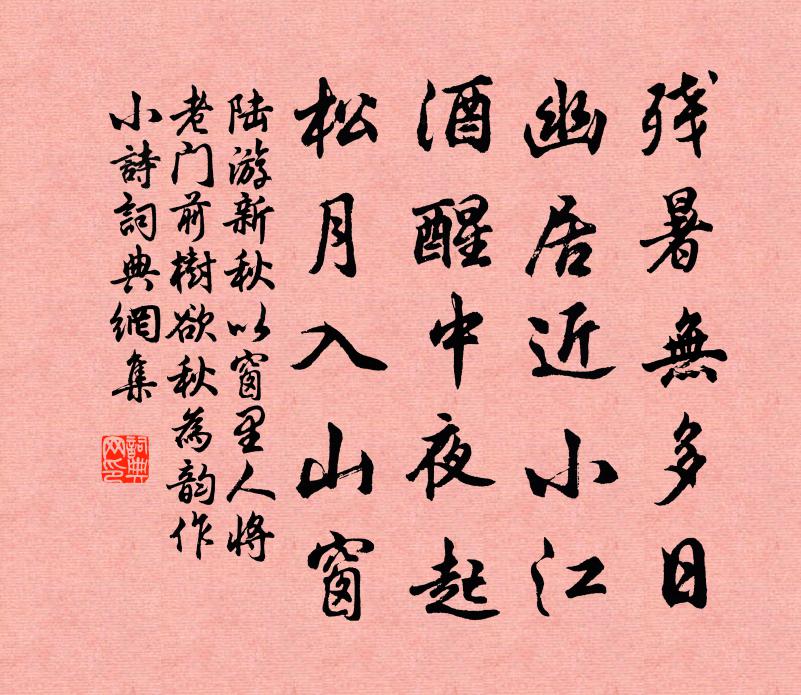 詩詞名句歷史字典書法欣賞書法字典國語詞典說文解字康熙字典古漢語字典標 題 作 者 詩 句 新秋以窗里人將老門前樹欲秋為韻作小詩作者:陸游 朝代:宋代原文殘暑無多日,幽居近小江。酒醒中夜起,松月入山窗。詩詞問答問:《新秋以窗里人將老門前樹欲秋為韻作小詩》的作者是誰?答:陸游問:該詩寫於哪個朝代?答:宋代問:陸游的名句有哪些?答:陸游名句大全書法欣賞新秋以窗里人將老門前樹欲秋為韻作小詩書法作品詩詞推薦偶題五言絕句五首方回〔宋代〕自古有治亂,誰家無是非。曉床聽鄰語,瑣瑣訴寒飢。頌古二十一首釋鼎需〔宋代〕全鋒敵勝鐵牛機,電掣雷奔已是遲。等閒活捉盧陂老,縱饒猛略若為施。君不見,寰中意氣,閫外威權,擬議沖前懷伊川賦李吉甫〔唐代〕龍門南嶽盡伊原,草樹人煙目所存。正是北州梨棗熟,夢魂秋日到郊園。荊山獨往姚系〔唐代〕宿昔山水上,抱琴聊躑躅。山遠去難窮,琴悲多斷續。岩重丹陽樹,泉咽聞陰谷。時下白雲中,淹留秋水曲。秋水送然上人南還林逋〔宋代〕囊攜琴譜與詩稿,寄臥船窗一榻深。莫向雲中認江樹,等閒驚起故園心。宮詞三十三首曹勛〔宋代〕元正不賀自清衷,壑札頻頒念兩宮。天相吉音來自北,便知孝悌與天通。吊柴道士馬廷鸞〔宋代〕老子猶龍不可親,莊周與蝶孰為真。補還石鼎吟邊句,飛作臨皋夢裡人。軟條蠟梅李石〔宋代〕南衙柔軟北縈紆,霜碧霜青各立株。但得東皇均一笑,黃梅吹蠟白軟酥。次韻楊信仲見貽郊居二首郭印〔宋代〕野老樵夫作比閭,儒宮一畝亦安居。澆愁剩買村前酒,引睡頻拈架上書。江近雲煙長到戶,人稀鳥鵲自馴除。不才宮詞張公庠〔宋代〕月澹中官放鑰回,倚雲宮殿掖門開。彩床百步黃羅帕,于闐名王進玉來。賢者之孝二百四十首丁儀子林同〔宋代〕尚自不與米,何堪大遺金。丁儀為有子,文略是誣親。小重山(茉莉)辛棄疾〔宋代〕倩得薰風染綠衣。國香收不起,透冰肌。略開些子未多時。窗兒外,卻早被人知。越惜越嬌痴。一枝雲鬢上,那人獨舫軒釋智愚〔宋代〕蹤跡渾如漾綠漪,畫橈曾不近漁磯。有時夢落秋江去,短笛橫吹戴月歸。□□□(古搗練子)賀鑄〔宋代〕樓上鼓,轉□□。□□□□□□□。思婦想無腸可斷,□□□□□□□。【雙調】新水令_閒爭奪鼎沸關漢卿〔元代〕閒爭奪鼎沸了麗春園,欠排場不堪久戀。時間相敬愛,端的怎團圓?白沒事教人笑,惹人怨。【駐馬聽】錦陣里爭南陽潤卿將歸雷平因而有贈皮日休〔唐代〕借問山中許道士,此回歸去復何如。竹屏風扇抄遺事,柘步輿竿系隱書。絳樹實多分紫鹿,丹沙泉淺種紅魚。東卿和顏長官百詠漁父朱繼芳〔宋代〕長作絲綸短短牽,一池漢上盡南天。誰知有客量江面,江是漁郎兩板船。訴衷情(次韻他伯紀桃花)李彌遜〔宋代〕小桃初破兩三花。深淺散餘霞。東君也解人意,次第到山家。臨水岸,一枝斜。照籠紗。可憐何事,苦愛施朱,減和范景仁王景彝殿中雜題三十八首並次韻其一梅堯臣〔宋代〕宮殿深沉處,鶯花爛漫時。關關哢清吭,蒨蒨發未蕤。天上春應早,人間日轉遲。得賢如漢盛,五字變周詩。相和歌辭。塘上行李賀〔唐代〕藕花涼露濕,花缺藕根澀。飛下雌鴛鴦,塘水聲溢溢。名句推薦此曲有意無人傳,願隨春風寄燕然,憶君迢迢隔青天。李白《長相思三首·其二》 人有逆天之時,天無絕人之路。馮夢龍《醒世恆言·卷三十二》 還卿一缽無情淚,恨不相逢未剃時。蘇曼殊《本事詩十首·選二》 曲屏先暖鴛衾慣,夜寒深、都是思量。吳文英《風入松·為友人放琴客賦》 傳屐朝尋藥,分燈夜讀書。於鵠《題鄰居》 新妝宜面下朱樓,深鎖春光一院愁。劉禹錫《和樂天春詞 / 春詞》 亦有白骨歸鹹陽,營家各與題本鄉。王建《渡遼水》 小扇引微涼,悠悠夏日長。顧太清《菩薩蠻·端午日詠盆中菊》 舒捲江山圖畫,應答龍魚悲嘯,不暇顧詩愁。楊炎正《水調歌頭·登多景樓》 綺席象床寒玉枕,美人何處醉黃花。汪元量《望江南·幽州九日》