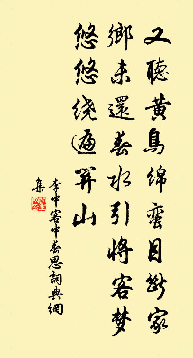 詩詞名句歷史字典書法欣賞書法字典國語詞典說文解字康熙字典古漢語字典標 題 作 者 詩 句 客中春思作者:李中 朝代:唐代客中春思原文又聽黃鳥綿蠻,目斷家鄉未還。春水引將客夢,悠悠繞遍關山。詩詞問答問:客中春思的作者是誰?答:李中問:客中春思寫於哪個朝代?答:唐代問:客中春思是什麼體裁?答:六古李中客中春思書法欣賞客中春思書法作品注釋全唐詩:卷748-6詩詞推薦送監丞家同年守簡池三十韻洪咨夔〔宋代〕去年為君來,朋廷峙鸞鵠。今年為親歸,蠶市苦思蜀。扶輿出修門,萬里宛在目。大江六月寒,風飽帆數幅。金山趙清叔輓詞葉適〔宋代〕昔我共筆硯,知君賢弟昆。門邀百客醉,囊諱一金存。忽與鐘聲盡,長悲磬色昏。多年趙家府,銷減惠王孫。贈劉伯翔相師陳淳〔宋代〕孔孟不說相,於人洞肺肝。由也行行如,不得其死然。括也未聞道,其軀難以全。賜億亦屢中,執玉俯仰間。經禮還京贈別盧照鄰〔唐代〕風月清江夜,山水白雲朝。萬里同為客,三秋契不調。戲鬼分斷岸,歸騎別高標。一去仙橋道,還皇錦域邁。淇上別劉少府子英高適〔唐代〕近來住淇上,蕭條惟空林。又非耕種時,閒散多自任。伊君獨知我,驅馬欲招尋。千里忽攜手,十年同苦心。求仁醉眠杜牧〔唐代〕秋醪雨中熟,寒齋落葉中。幽人本多睡,更酌一樽空。寄雪庭老子丘葵〔宋代〕問訊紫雲老,何時立雪參。生來將滿百,空界直超三。泡幻修千劫,佛應同一龕。曾師蒙印可,玄諦老方諳。橫吹曲辭。長安道薛能〔唐代〕汲汲復營營,東西連兩京。關繻古若在,山嶽累應成。各自有身事,不相知姓名。交馳喧眾類,分散入重城。此路魏總乾嘉父以果齋求詩為賦二章曹彥約〔宋代〕請言山下出泉蒙,蒙養從來有聖功。三德知仁非好勇,六爻險止要時中。申棖有欲剛安在,曾子地仁毅不洪。以果高渭南席上燭照牡丹趙孟堅〔宋代〕高燒燭照御黃衣,疑是沈香夜宴歸。固是不教化睡著,只愁驚起露蟬飛。泊船瓜洲王安石〔宋代〕京口瓜洲一水間,鍾山只隔數重山。春風自綠江南岸,明月何時照我還。重次林守韻並闌臞軒二首劉克莊〔宋代〕晨坐黃堂夕未歸,偶然閉閣句尤奇。頗知韋守臨蘇郡,不省山公到習池。燒尾且陪攀桂集,遨頭別有探梅期。自慚和九叔知縣昨游長句楊萬里〔宋代〕詩窮不但兩鬢霜,白髮緣愁千丈長。一年強半走道路,歸來又見橘柚黃。不知南鄰更北里,醉折梅花照溪水。扶藜晉七寶鞭孫元晏〔唐代〕天命須知豈偶然,亂臣徒欲用兵權。聖謨廟略還應別,渾不消他七寶鞭。題舊記顏劉克莊〔宋代〕憶攜束書來京師,洛下諸賢頗見推。當日難為元方弟,何處聞有蔡克兒。晚節免羞彥回面,後生願識李邕眉。五陵賀尤禮侍兼修史侍講直學士院四首張鎡〔宋代〕斯文未搖落,右序啟哲人。胸中悟復悟,筆底新又新。幻為九色絲,鑾坡演明綸。兵民總疲羸,夜直煩前陳。青玉案談元范〔宋代〕蝦須簾上銀鉤小。筵內輕寒繞。紅葉徵香侵語笑。金釵珠履,鳳蕭龜鼓,疑是蓬萊島。萱堂日日春生貌。嫩綠休然和毗陵尉曹昭用見寄李中〔唐代〕決獄多餘暇,冥搜萬象空。捲簾疏雨後,鎖印夕陽中。還往多名士,編題尚古風。宦途知此味,能有幾人同。題東洞陳宗臣〔宋代〕蔚藍勝概世應稀,中有高人隱翠微。那日徽書來古洞,恩光榮耀倍山輝。牧牛兒陸游〔宋代〕溪深不須憂,吳牛自能浮。童兒踏牛背,安穩如乘舟。寒雨山陂遠,參差煙樹晚。聞笛翁出迎,兒歸牛入圈。名句推薦願君多採擷,此物最相思。王維《相思》 別夢依稀咒逝川,故園三十二年前。 * 《七律·到韶山》 白兔搗藥秋復春,嫦娥孤棲與誰鄰?李白《把酒問月·故人賈淳令予問之》 去年五月黃梅雨,曾典袈裟糴米歸。與恭《思母》 濤瀾洶湧,風雲開闔。蘇轍《黃州快哉亭記》 廣陵城裡昔繁華,煬帝行宮接紫霞。曾棨《維揚懷古》 撥雪尋春,燒燈續晝。暗香院落梅開後。毛滂《踏莎行·元夕》 荷葉五寸荷花嬌,貼波不礙畫船搖;石濤《荷花》 飄飄何所似,天地一沙鷗。杜甫《旅夜書懷》 萋萋芳草小樓西,雲壓雁聲低。劉基《眼兒媚·秋思》
