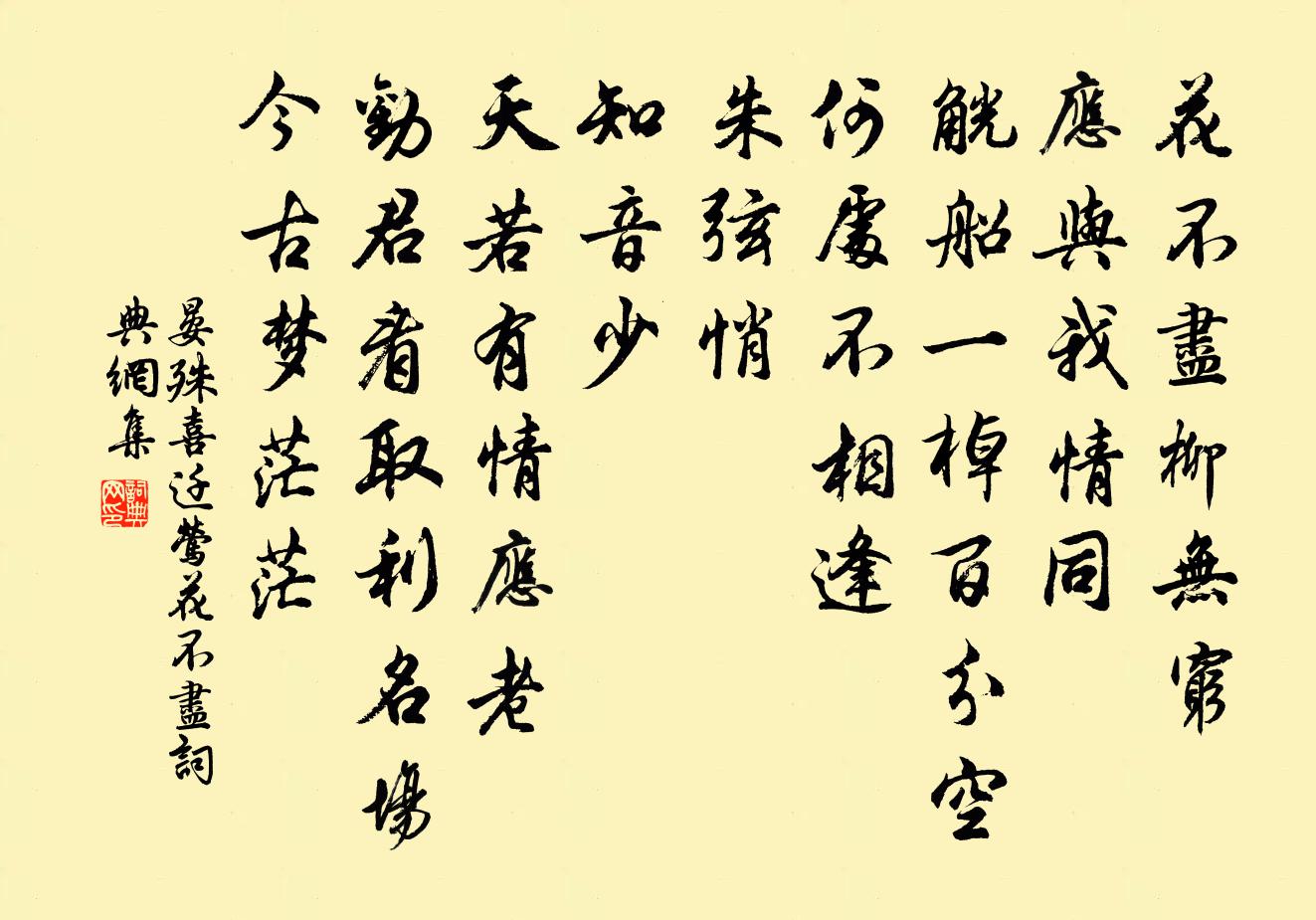起筆“花不盡,柳無窮”借花柳以襯離情。花、柳是常見之物,它們遍布海角天涯,其數無盡,其廣無邊;同時花、柳又與人一樣同是生命之物,它們的生長、繁茂、衰謝同人之生死、盛衰極其相似,離合聚散之際,也同樣顯露出明顯的苦樂悲歡。“應與我情同”是以花柳作比,襯寫自己離情的“不盡”和“無窮”,宛轉地表露了離別的痛苦之深。“觥船一棹百分空”,一句出自杜牧的《題禪院》詩。作者這裡強作曠達,故示灑脫,以一醉可以消百愁作為勸解之辭,而“何處不相逢”,則是以未來可能重聚相慰。對友人的溫言撫慰之中,也反映了作者儘量掙脫離別痛苦的複雜心態,他既無可奈何,又故示曠達。