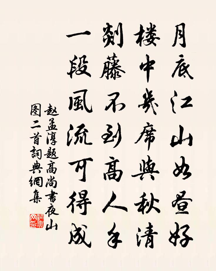 詩詞名句歷史字典書法欣賞書法字典國語詞典說文解字康熙字典古漢語字典標 題 作 者 詩 句 題高尚書夜山圖二首作者:趙孟淳 朝代:宋代題高尚書夜山圖二首原文月底江山如晝好,樓中幾席與秋清。剡藤不到高人手,一段風流可得成。詩詞問答問:題高尚書夜山圖二首的作者是誰?答:趙孟淳問:題高尚書夜山圖二首寫於哪個朝代?答:宋代趙孟淳題高尚書夜山圖二首書法欣賞題高尚書夜山圖二首書法作品詩詞推薦贈四明月岩永昌上人顧逢〔宋代〕杖錫遊方外,叢林歷幾春。息心修道者,鐵脊坐禪人。泉落岩千丈,天空月一輪。眼前清境界,不識世間塵。代書寄應之舅蘇泂〔宋代〕故人天一方,鴻雁已南翔。世亂各生死,年飢無稻粱。丁寧機上錦,愛惜橐中裝。莫作孤飛想,冥冥忌弋傷。已至都梁簡介然時介然欲至城北而食言吳則禮〔宋代〕擊舟落尾端復佳,獨恐幽人費招喚。老鼻行參宴坐香,晨炊飽吃連床飯。巾邊白髮已星星,霜底黃花猶粲粲。從事和蘇仲南柳湖會飲張耒〔宋代〕北風閣雪不到地,寒日自同雲外天,愁人得酒百不問,滿引聊作諸公先。少休歌舞進棋局,更放旌旗移樓船。我欲頌古二十一首釋心月〔宋代〕自家冷暖自家知,祖意西來更問誰。全體承當全體是,須彌頂上戴須彌。次滕彥真韻三首趙蕃〔宋代〕我欲湘西看,行須覓渡船。何如臨絕頂,得以盡長川。鷗鷺煙雲表,蚊虻埃壒前。隱寧分大小,那更別山鄽。萬安道中書事德三首楊萬里〔宋代〕桃花薄相點燕脂,輸與梨花雪作肌。只有垂楊不脂粉,縷金鋪翠襯腰支。贈葛天民翁卷〔宋代〕燕本昔如此,清名千載垂。誰將囊米施,自拾束薪炊。柳影連山閣,湖波浸竹籬。朝昏無別事,只是欲吟詩。頌古四十四首釋師範〔宋代〕鋪席宏開見也麽,買人何似看人多。十成好個吹毛劍,只作陶家壁上梭。箕子碑柳宗元〔唐代〕凡大人之道有三:一曰正蒙難,二曰法授聖,三曰化及民。殷有仁人曰箕子,實具茲道以立於世,故孔子述六經之偶成汪夢雷〔宋代〕晚望荒城重感嗟,十年行客倦思家。渚田稻薄無來雁,庭樹枝寒少宿鴉。書為在官長廢讀,酒因多病久停賒。何時曲江宴日呈諸同年徐夤〔唐代〕鷦鷯驚與鳳凰同,忽向中興遇至公。金榜連名升碧落,紫花封敕出瓊宮。天知惜日遲遲暮,春為催花旋旋紅。好是伊州歌王維〔唐代〕清風明月苦相思,盪子從戎十載餘。征人去日殷勤囑,歸雁來時數附書。次韻答少章聞雁聽雞二首黃庭堅〔宋代〕朝士聞雞常半途,朱門擁被不關渠。秦郎五起聽三唱,殘燭貪傳未見書。遣興戴叔倫〔唐代〕明月臨滄海,閒雲戀故山。詩名滿天下,終日掩柴關。訪僧不遇徐集孫〔宋代〕特地尋君先佛場,行行踏遍古苔荒。不因坐石貪搜句,何事抽單輟赴堂。空榻日移懸錫影,別寮風過煮茶香。忙中挽傅德芳主簿彭龜年〔宋代〕亭亭梁木遽然傾,吾里諸生失典型。已向東維次箕宿,定知南斗厭文星。書盈故篋墨猶濕,影掛虛堂燈自青。忍聽月下自三橋泛湖歸三山陸游〔宋代〕素璧初升禹廟東,天風為我送孤篷。山橫玉海蒼茫外,人在水壺縹緲中。茅舍燈青聞吠犬,蘋汀煙淡見驚鴻。白頭趙待制輓詞樓鑰〔宋代〕半世誰知己,登門意氣傾。交情忘父行,文會忝余盟。持論先忠厚,談經嘆老成。幽光誰為發,落筆淚縱橫。送胡季昭謫象州次王盧溪送澹庵眨新州韻李元實〔宋代〕知公不怕鬼門關,直氣橫乾清禁閒。雕嘴明知林甫毒,鯁言要與澹班。一身渠任黃茆里,千古名標青史間。非晚清名句推薦人有悲歡離合,月有陰晴圓缺,此事古難全。蘇軾《水調歌頭·丙辰中秋》 寄言燕雀莫相啅,自有雲霄萬里高。李白《觀放白鷹二首》 柳葉雙眉久不描,殘妝和淚污紅綃。江采萍《謝賜珍珠》 參橫斗轉欲三更,苦雨終風也解晴。蘇軾《六月二十日夜渡海》 相顧無相識,長歌懷採薇。王績《野望》 罪己宜苛,人憐不致大害。來俊臣《羅織經·保身卷第七》 出犯繁花露,歸穿弱柳風溫庭筠《清明日》 任賢勿貳,去邪勿疑。佚名《尚書·虞書·大禹謨》 知音少,弦斷有誰聽。岳飛《小重山·昨夜寒蛩不住鳴》 聞誅一夫紂矣,未聞弒君也。孟子《孟子·梁惠王章句下·第八節》