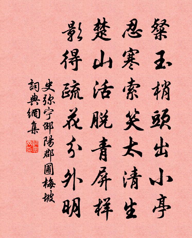 詩詞名句歷史字典書法欣賞書法字典國語詞典說文解字康熙字典古漢語字典標 題 作 者 詩 句 邵陽郡圃梅坡作者:史彌寧 朝代:宋代邵陽郡圃梅坡原文粲玉梢頭出小亭,忍寒索笑太清生。楚山活脫青屏樣,影得疏花分外明。詩詞問答問:邵陽郡圃梅坡的作者是誰?答:史彌寧問:邵陽郡圃梅坡寫於哪個朝代?答:宋代史彌寧邵陽郡圃梅坡書法欣賞邵陽郡圃梅坡書法作品詩詞推薦用韻戲簡叔孫應時〔宋代〕平生習主簿,經渭極分明。學道深忘味,能詩新有聲。弈寧論勝負,琴不計虧成。獨怕春宵雁,南來動別情。自扁門歸陸游〔宋代〕橘柚累累未著霜,陂塘渺渺度秋光。長橋虹臥當官道,重閣翬飛出女牆。煙際遠舟俄已隱,天邊驚雁不成行。歸來句徐似道〔宋代〕索醉寧傾問字酒,忍飢不取作碑錢。再用前韻李彌遜〔宋代〕努力避喧遭掣村,強顏追好得嗔拳。交情只有春風厚,千里隨人不用錢。粉蝶兒(詠圓子)史浩〔宋代〕玉屑輕盈,鮫綃霎時鋪遍。看仙娥、騁些神變。咄嗟間,如撒下、真珠一串。火方然,湯初滾、盡浮鍋面。歌樓酒次鼓腹謠元韻鄧肅〔宋代〕我心不轉本非石,世路爬沙任退尺。杯酒高懷獨未忘,只有三萬六千日。原憲雖貧亦非窮。石發溪毛放箸空。已遣人日驚蟄前數日大雪寄孫奇父韓叔夏胡寅〔宋代〕臘雪不溉旱,天公念嘉生。稚春乃祁寒,號令如冬行。栗烈鼓噫氣,碎訇動霆聲。初疑雨翻盆,旋覺霰灑甍。暫止東陂秋意寄元八白居易〔唐代〕寥落野陂畔,獨行思有餘。秋荷病葉上,白露大如珠。忽憶同賞地,曲江東北隅。秋池少遊客,唯我與君俱。啼蛩武后明堂樂章。皇嗣出入升降武則天〔唐代〕至人光俗,大孝通神。謙以表性,恭惟立身。洪規載啟,茂典方陳。譽隆三善,祥開萬春。冬至祀先有感趙仲修〔宋代〕井臼辛勤又一年,仗誰齎恨到重泉。離騷空紀高陽後,藍縷過如蚡冒前。終亦有人分鼠璞,只今無俸置豚肩。男兒蘇武慢凌雲翰〔元代〕君實園中,堯夫窩內,獨樂正同安樂。維水泱泱,予懷渺渺,西望每思伊洛。草色隨車,花香襲屨,風景至今猶昨宮詞王仲修〔宋代〕天子觀漁陋魯棠,涵曦亭下似滄浪。金鱗釣得龍顏喜,韶樂聲中進玉觴。送九兄僉書歸二首蔡戡〔宋代〕中年仍再別,歸意苦難留。風雨傷心夜,江山滿目秋。西堂詩入夢,東閣酒添愁。他日荊溪上,無違具一舟。秋思陸游〔宋代〕一徑苔侵四壁空,北窗支枕聽秋鍾。故人去後登樓怯,白髮多來覽鏡慵。狂憶射麋窮楚澤,閒思釣雪泛吳松。相如讀竹溪詩一首劉克莊〔宋代〕不敢匆匆看,晴窗幾絕編。參它少陵髓,饒得弈秋先。友願低頭拜,師曾枕膝傳。已將牌印子,牒過竹溪邊。歙州道中仆逃趙嘏〔唐代〕去跳風雨幾奔波,曾共辛勤奈若何。莫遣窮歸不知處,秋山重疊戍旗多。江城子陸漢廣〔宋代〕綠鶯庭院燕鶯啼。繡簾垂。瑞煙霏。一片笙簫,聲過彩雲低。疑是蕊宮仙子降,翻玉袖,舞瑤姬。冰姿玉質自清奇即事章甫〔宋代〕風急收殘雨,花輕點客衣。江山爭秀髮,燕雁不同飛。異縣交遊少,中原信息稀。王師戰甚苦,方解蔡州圍。送薛經李覯〔宋代〕多能未必有相知,況是東南義士稀。京洛路長何日到,風塵依書化人衣。山行羅與之〔宋代〕片雲輕度半岩陰,巾屨俄驚翠靄深。澗底寒泉知客懶,石根虢虢自長吟。名句推薦駐馬橋西,還系舊時芳樹。高觀國《玲瓏四犯·水外輕陰》 人間有味是清歡。蘇軾《浣溪沙·細雨斜風作曉寒》 脊令各有思歸恨,日月相催雪滿顛。黃庭堅《次元明韻寄子由》 吃不了兜著走曹雪芹《紅樓夢·第二十三回》 守分安命,順時聽天。朱柏廬《朱子家訓·全文》 蛇無頭而不行,鳥無翅而不飛。施耐庵《水滸傳·第六十回》 燕山雪花大如席,片片吹落軒轅台。李白《北風行》 萬帳穹廬人醉,星影搖搖欲墜。納蘭性德《如夢令·萬帳穹廬人醉》 雨濕花房,風斜燕子,池閣晝長春晚。呂渭老《選冠子·雨濕花房》 鵝鴨不知春去盡,爭隨流水趁桃花。晁沖之《春日·陰陰溪曲綠交加》
