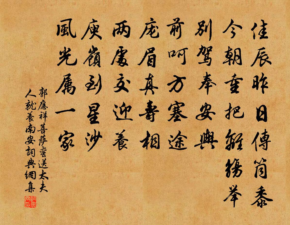 詩詞名句歷史字典書法欣賞書法字典國語詞典說文解字康熙字典古漢語字典標 題 作 者 詩 句 菩薩蠻(送太夫人就養南安)作者:郭應祥 朝代:宋代原文佳辰昨日傳筒黍。今朝重把離觴舉。別駕奉安輿。前呵方塞途。龐眉真壽相。兩處交迎養。庾嶺到星沙。風光屬一家。詩詞問答問:《菩薩蠻(送太夫人就養南安)》的作者是誰?答:郭應祥問:該詩寫於哪個朝代?答:宋代問:該詩是什麼體裁?答:詞書法欣賞菩薩蠻(送太夫人就養南安)書法作品詩詞推薦頌證道歌證道歌釋印肅〔宋代〕河沙諸佛體皆同,如今端坐大雄峰。森羅萬象無藏隱,元來只在一塵中。偈頌七十六首釋子益〔宋代〕冬前冬後,沙飛石走。時節到來,不容袖手。興化雖無驅風走電之謀,也要應個時候,一九二九。禮明招謙禪師塔釋智遇〔宋代〕藤深蔓短塔累累,以眼名龍恐是伊。放下泥盤叉手笑,阿師曾誤矮者梨。題劉景明百馬圖扇面楊萬里〔宋代〕霧鬣如無筆,霜蹄不帶埃。直言明眼著,若個是龍媒。蘭吳錫疇〔宋代〕石畔稜稜翠葉長,葳蕤紫蕊吐幽芳。靈均去後無人問,林密山深只自香。和劉後村雜興胡仲弓〔宋代〕當日曾彈貢禹冠,懸知出處獨今難。寧將退翮翔千仞,誰肯模稜持兩端。風雨筆頭猶老健,江湖吟鬢未凋殘。十篇獨游崇化寺題觀音院張耒〔宋代〕默默苦不展,駕言陟崇崗。人遠塵坌息,高門開寶坊。華檐敞虛殿,喬木護修廊。閒庭引幽步,偃息得茲堂。惟時定光南安岩鄭弼〔宋代〕香風影里迎新魄,梵唄聲中見落暉。自恨勞生名利役,不能來此共忘機。魚籪金嘉謨〔宋代〕芒葦織簾箔,橫當湖水秋。寄言魚興蟹,機穽在中流。滿江紅 別大名親舊 元草堂詩餘許衡〔元代〕河上徘徊,未分袂、孤懷先怯。中年後、此般憔悴,怎禁離別。淚苦滴成襟畔濕 ,愁多擁就心頭結。倚東風、搔送別嚴希孟史聲〔宋代〕歲暮送行舟,寒煙古渡頭。渚禽沖客起,野水帶冰流。經史探深趣,江山屬壯遊。莫將和氏璧,輕向暗中投。張端義應詔上書謫曲江正月一日贛州相遇戴復古〔宋代〕憂世心何切,謀身計甚疏。樽前話不盡,天下事何如。漢武求言詔,賈生流涕書。龍顏那可犯,謫向曲江居。城上郭印〔宋代〕晚目層城上,山川自吐吞。斷雲孤嶺秀,漲潦一溪渾。煙起誰家樹,人歸何處村。不堪東北望,回首又黃昏。憶弟二首(時歸在南陸渾莊)杜甫〔唐代〕喪亂聞吾弟,饑寒傍濟州。人稀吾不到,兵在見何由。憶昨狂催走,無時病去憂。即今千種恨,惟共水東流。且喜新竹俞桂〔宋代〕傍牆穿過鄰家竹,愛護新篁數十竿。剪伐莫令童僕輩,老夫日日要來看。次韻潘都乾水晶菊二首項安世〔宋代〕幕中安得野人園,種此晶熒白玉丹。冷淡雖無九春分,風流還得一冬看。銀杯共色深宜酒,紙帳圍香木怕寒。只向賞雪吟邵雍〔宋代〕一片兩片雪紛紛,三杯五杯酒醺醺。此時情狀不可論,直疑天在才絪紜。減字木蘭花李之儀〔宋代〕莫非魔境。強向中間談獨醒。一葉才飛。便覺年華太半歸。醉雲可矣。認著依前還不是。虛過今春。有愧斜川得意皇后廟十五首真宗〔宋代〕祀事孔明,廟室惟肅。鉶登籩豆,金石絲竹。既灌既下,允恭允穆。奉神如在,以介景福。送施州單員外徐鉉〔唐代〕精金百鍊始知難,何似仙枝兩度攀。名逐鳳書歸故里,身從鳥道入巴山。詔宣遠俗皇恩厚,惠洽齊民利刃閒。珍重名句推薦留連光景惜朱顏,黃昏獨倚闌。李煜《阮郎歸·呈鄭王十二弟》 舒捲江山圖畫,應答龍魚悲嘯,不暇顧詩愁。楊炎正《水調歌頭·登多景樓》 何日歸家洗客袍?銀字笙調,心字香燒。蔣捷《一剪梅·舟過吳江》 勸君頻入醉鄉來,此是無愁無恨處。晏幾道《玉樓春·雕鞍好為鶯花住》 三極彝訓,訓深稽古。致化歸一,分教斯五。劉勰《文心雕龍·宗經》 半壁見海日,空中聞天雞。李白《夢遊天姥吟留別 / 別東魯諸公》 三萬里河東入海,五千仞岳上摩天。陸游《秋夜將曉出籬門迎涼有感》 機關算盡太聰明,反算了卿卿性命。曹雪芹《紅樓夢·第五回》 有美一人,清揚婉兮。佚名《野有蔓草》 修竹畔,疏簾里。歌余塵拂扇,舞罷風掀袂。謝逸《千秋歲·詠夏景》