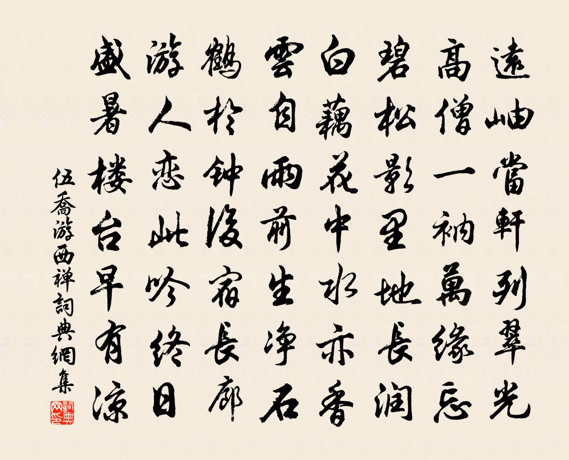 詩詞名句歷史字典書法欣賞書法字典國語詞典說文解字康熙字典古漢語字典標 題 作 者 詩 句 游西禪作者:伍喬 朝代:唐代游西禪原文遠岫當軒列翠光,高僧一衲萬緣忘。碧松影里地長潤,白藕花中水亦香。雲自雨前生淨石,鶴於鍾後宿長廊。遊人戀此吟終日,盛暑樓台早有涼。詩詞問答問:游西禪的作者是誰?答:伍喬問:游西禪寫於哪個朝代?答:唐代問:游西禪是什麼體裁?答:七律伍喬游西禪書法欣賞游西禪書法作品注釋全唐詩:卷744-6詩詞推薦九折岩張聲道〔宋代〕池繞九岩邊,鴛鴦自在眠。圓荷浮簇簇,翠葆靜涓涓。沾足三春雨,清和四月天。庭空無一事,真樂付詩篇。懷范光伯再用韻裘萬頃〔宋代〕梅邊流水碧洄洄,都把相思付折梅。十載不禁雙淚落,一尊期慰九腸回。驚殘蝶夢鵲空喜,望斷馬蹄人不來。咫尺頌古三首釋寶印〔宋代〕千尺絲綸直下垂,錦鱗撥刺上鉤時。斜風細雨歌歸去,醉倒蓬窗百不知。猶子松字茂之者慶長兄之子也有志於學樂從余曾豐〔宋代〕乃翁窮古學,之子廣家聲。頭不容高枕,心無外短檠。床頭周易熟,角上漢書精。更得賢師友,終當大有成。書葛氏詩卷樓鑰〔宋代〕未年六十蚤休官,海角投閒儘自安。一紀時容奉香火,七旬遂許掛衣冠。重來深愧妨賢路,此去終期保歲寒。三上續長恨歌范成大〔宋代〕聞道蓬壺重見時,瘦來全不耐風吹。無端郤作塵間念,已被仙官聖得知。擬西北有高樓吳泳〔宋代〕高樓可岧嶢,一柱西北隅。橫當子午道,峻直參井墟。曲瓊卷飛霞,儼儼仙人居。上通三重階,下蔭十二衢。傍樓奉和送金城公主適西蕃應制蘇頲〔唐代〕帝女出天津,和戎轉罽輪。川經斷腸望,地與析支鄰。奏曲風嘶馬,銜悲月伴人。旋知偃兵革,長是漢家親。浣溪沙(人日過靈泉寺次韻少壯)李壁〔宋代〕祗記梅花破臘前。惱人春色又薰然。山頭井似陸公泉。上客長謠追楚些,嬌娃短舞看胡旋。崇桃積李自年年。送周使君罷渝州歸郢州別墅劉禹錫〔唐代〕君思郢上吟歸去,故自渝南擲郡章。野戍岸邊留畫舸,綠蘿陰下到山莊。池荷雨後衣香起,庭草春深綬帶長。只恐送常清上人還舒州皎然〔唐代〕灊人思爾法,楚信有回船。估客親宵語,閒鷗偶晝禪。經聲含石瀲,麈尾拂江煙。常說歸山意,誅茅廬霍前。胡樞密生辰仲並〔宋代〕借箸從容漢子房,平生書奏幾封囊。少辭天上風雲會,便覺壺中歲月長。調鼎望公非一日,草玄與我見諸郎。云何送黟縣學官江歸上饒石湖精舍方回〔宋代〕小桃源住飯不足,夜鶴傳聲趣駕還。細嚼紫陽山色飽,饞涎猶睨應天山。塞外雜詠林則徐〔清代〕天山萬笏聳瓊瑤,導我西行伴寂寥。我與山靈相對笑,滿天晴雪共難消。神君歌十首劉克莊〔宋代〕樵蘇出林看,士女擁途迎。要識神通趣,年年此際晴。不寐十首方回〔宋代〕細字昏難讀,孤燈冷獨挑。黃虀余口味,白豆驗心苗。玉枕方春夢,金門正早期。先生唯默坐,窗外雨蕭蕭。次韻耿時舉、王直之夜坐范成大〔宋代〕庭葉翻翻鬧,燈花粟粟穠。關山千里鴈,風雨滿城鍾。隴上新登谷,江頭舊熄烽。今年吾計得,安穩讀三冬。次韻子瞻過海蘇轍〔宋代〕我遷海康郡,猶在寰海中。送君渡海南,風帆若張弓。笑揖彼岸人,回首平生空。平生定何有,此去未可窮。惜無偈頌二十五首釋如淨〔宋代〕天童鐵臭老拳頭,打殺江湖水牯牛。夜深忽然生個卵,天明推出大日頭。曬{左日右良}諸人烝濕處,免教行步滑夢中得蕎粥覺而記其景聯洪咨夔〔宋代〕墨雲吹雨落霜空,滿地珊瑚樹樹紅。老磨踏煙霏淅蔌,鈍鐺奏火沸蒙茸。寒江浪起雪飛外,古嶂風鳴雲攪中。識破名句推薦小舟從此逝,江海寄餘生。蘇軾《臨江仙·夜飲東坡醒復醉》 天下有道則見,無道則隱。孔子弟子《論語·泰伯篇》 國亡身殞今何有,只留離騷在世間。張耒《和端午》 江南自是離愁苦,況游驄古道,歸雁平沙。王沂孫《高陽台·和周草窗寄越中諸友韻》 明朝望鄉處,應見隴頭梅。宋之問《題大庾嶺北驛》 已忍伶俜十年事,強移棲息一枝安。杜甫《宿府》 口言之,身必行之。墨子《墨子·48章 公孟》 逍遙以針勞,談笑以藥倦劉勰《文心雕龍·養氣》 農夫無草萊之事則不比;商賈無市井之事則不比莊子《莊子·雜篇·徐無鬼》 居高位者易驕,處佚樂者易侈。張廷玉《明史·列傳·卷二十四》