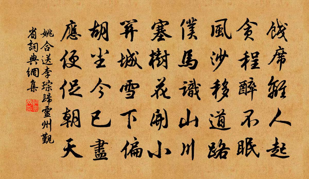 詩詞名句歷史字典書法欣賞書法字典國語詞典說文解字康熙字典古漢語字典標 題 作 者 詩 句 送李琮歸靈州覲省作者:姚合 朝代:唐代送李琮歸靈州覲省原文餞席離人起,貪程醉不眠。風沙移道路,仆馬識山川。塞樹花開小,關城雪下偏。胡塵今已盡,應便促朝天。詩詞問答問:送李琮歸靈州覲省的作者是誰?答:姚合問:送李琮歸靈州覲省寫於哪個朝代?答:唐代問:送李琮歸靈州覲省是什麼體裁?答:五律姚合送李琮歸靈州覲省書法欣賞送李琮歸靈州覲省書法作品注釋全唐詩:卷496-50詩詞推薦送張君玉赴寧江幕府七首晁公溯〔宋代〕眾水爭流赴硤中,輕舟東下疾飛鴻。流金不信人間熱,知有長江萬里風。失調名仲殊〔宋代〕疏雨洗雲軺,望極銀河影里。浣溪沙周密〔宋代〕波影搖花碎錦鋪。竹風清泛玉扶疏。畫屏紋枕小紗幮。合色麝囊分翠繡,夾羅螢扇縷金書。十分涼意淡妝梳。駕部郎中畢公輓辭二首蘇頌〔宋代〕世德公高裔,家聲相國孫。飾儒成吏事,訓子服忠言。道直躬難進,流長慶有源。椎牛方返葬,納駟已高門。如夢令譚處端〔元代〕大道無名無說。休恁謾生分別。火滅與煙消,便是良辰佳節。宜拙。宜拙。認取春花秋月。嵩少孟郊〔唐代〕沙彌舞袈裟,走向躑躅飛。閒步亦惺惺,芳援相依依。噎塞春咽喉,蜂蝶事光輝。群嬉且已晚,孤引將何歸。流艷玉京軒黃庭堅〔宋代〕蒼山其下白玉京,五城十二樓,郁儀結鄰常杲杲。紫雲黃霧鏁玄關,雷驅不祥電揮掃。上有千年來歸之白鶴,下有靜女佚名〔先秦〕靜女其姝,俟我於城隅。愛而不見,搔首踟躕。靜女其孌,貽我彤管。彤管有煒,說懌女美。自牧歸荑,洵美且異代賀郊祀慶成二首楊萬里〔宋代〕聖主勤民歲自豐,德威懷遠塞塵空。鬱金祼鬯周茅屋,瑄玉親郊漢竹宮。已剌六經新作制,卻追三代與同風。雞竿宴曹王宅錢起〔唐代〕賢王駟馬退朝初,小苑三春帶雨餘。林沼蔥蘢多貴氣,樓台隱映接天居。仙雞引敵穿紅藥,宮燕銜泥落綺疏。自嘆龍洞鄭國輔〔宋代〕泥蟠蟄臥久潛蹤,一旦青雲得路通。利物濟人功已了,卻遺凡骨返仙宮。泛小舟入蓮盪微雨即事汪莘〔宋代〕水光如錦葉如煙,微雨相從到洞天。翠蓋紅妝無處避,一時挨入木蘭船。新制綾襖成感而有詠白居易〔唐代〕水波文襖造新成,綾軟綿勻溫復輕。晨興好擁向陽坐,晚出宜披蹋雪行。鶴氅毳疏無實事,木棉花冷得虛名。宴安西江月高道寬〔元代〕九轉靈丹妙藥,從來一點元真。仙家收得做天人。普度人人有分。本來硃砂一味,還元黑錫白銀。河車搬運與心君挽鬍子瑞孫應時〔宋代〕耆舊長庚月,斯人馬少游。平生自繩尺,方寸不戈矛。細細巾箱字,琅琅燈火秋。子孫森滿眼,齎志可無酬。夜會鄭氏昆季林亭方乾〔唐代〕捲簾圓月照方塘,坐久尊空竹有霜。白犬吠風驚雁起,猶能一一旋成行。長孫十一東山春夜見贈楊諫〔唐代〕故人謝城闕,揮手碧雲期。溪月照隱處,松風生興時。舊林日雲暮,芳草歲空滋。甘與子成夢,請君同所思。懷伊亭張嵲〔宋代〕迴環擁岡巒,澶漫分林塢。縱目以怡情,信美疑吾土。雙韻子張先〔宋代〕鳴鞘電過曉闈靜。斂龍旗風定。鳳樓遠出霏煙,聞笑語、中天迥。清光近。歡聲竟。鴛鴦集、仙花斗影。更聞度曲別友釋文珦〔宋代〕故人別我江東去,不堪回首城邊路。明日思君不見君,惟有春雲滿江樹。名句推薦聚斂者,召寇、肥敵、亡國、危身之道也荀子《荀子·王制》 罩向金籠好羽儀,分明喉舌似君稀僧定渚《詠鸚鵡》 對瀟瀟暮雨灑江天,一番洗清秋。柳永《八聲甘州·對瀟瀟暮雨灑江天》 昔日芙蓉花,今成斷根草。李白《妾薄命》 杏花時節雨紛紛。山繞孤村。水繞孤村。劉仙倫《一剪梅·唱到陽關第四聲》 雙槳來時,有人似、舊曲桃根桃葉。姜夔《琵琶仙·雙槳來時》 只有天在上,更無山與齊寇準《詠華山》 隰桑有阿,其葉有幽。佚名《隰桑》 小憐初上琵琶,曉來思繞天涯。王安國《清平樂·春晚》 行人夜宿金陵渚,試聽沙邊有雁聲。李頎《送劉昱》