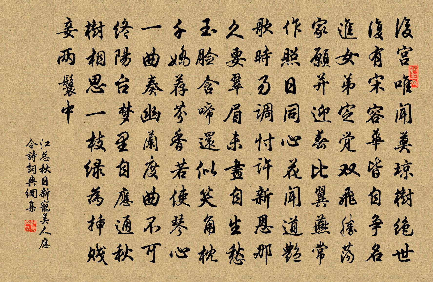 詩詞名句歷史字典書法欣賞書法字典國語詞典說文解字康熙字典古漢語字典標 題 作 者 詩 句 秋日新寵美人應令詩作者:江總 朝代:隋代秋日新寵美人應令詩原文後宮唯聞莫瓊樹。絕世復有宋容華。皆自爭名進女弟。定覺雙飛勝盪家。願並迎春比翼燕。常作照日同心花。聞道艷歌時易調。忖許新恩那久要。翠眉未畫自生愁。玉臉含啼還似笑。角枕千嬌薦芬香。若使琴心一曲奏。幽蘭度曲不可終。陽台夢裡自應通。秋樹相思一枝綠。為插賤妾兩鬟中。詩詞問答問:秋日新寵美人應令詩的作者是誰?答:江總問:秋日新寵美人應令詩寫於哪個朝代?答:隋代江總秋日新寵美人應令詩書法欣賞秋日新寵美人應令詩書法作品詩詞推薦挽朱師禹母二首黃公度〔宋代〕孝養空懷橘,嚴規想斷機。影留生日面,棺掩嫁時衣。萱室言猶在,蘭陔事已非。九原行楚挽,桃李慘春暉。道傍祠周翼之〔宋代〕荒祠古道邊,喬木翠森然。疊石為香案,攀藤掛紙錢。一時靈有跡,千載祀猶傳。草草陳牛酒,深期大有年。芝產之五日有雙蓮生於東池亟往視之出水已二郭印〔宋代〕七層芝草煌煌秀,一本荷花兩兩芳。無象太平人不識,天教卉木效珍祥。過湖偶題書於鄔子之津趙蕃〔宋代〕洞庭厥大九州間,此地吞瀦未覺慳。一抹遠青為四望,亦云仿佛似君山。題天開圖畫章甫〔宋代〕使君新筑北城隈,舉酒標名繡斧來。一覽江山因勝地,四時圖畫自天開。坐令宋史空盤礴,豈有並刀解翦裁。暇日送薛承矩秩滿北游劉長卿〔唐代〕匹馬向何處,北游殊未還。寒雲帶飛雪,日暮雁門關。一路傍汾水,數州看晉山。知君喜初服,只愛此身閒。丹房采蕨羅公升〔宋代〕神丹有餘光,入地茁紫玉。氣鍾仙掌清,味壓婦臂俗。東風一夜雨,登俎間紅綠。淡羹意自古,酸蘊香更酷。山人賦得歸雲送李山人歸華山錢起〔唐代〕秀色橫千里,歸雲積幾重。欲依毛女岫,初卷少姨峰。蓋影隨征馬,衣香拂臥龍。只應函谷上,真氣日溶溶。廣化遇雨張耒〔宋代〕浮雲蔽高峰,台殿延晚色。風聲轉谷豪,雨腳射山白。東樓瞰虛明,龍甲排松柏。蕭森異人境,坐視動神魄。撞鐘紹興祀皇地祗十五首佚名〔宋代〕於穆盛禮,肅肅在宮。幾事有初,直於東榮。條濯是謹,惟寅惟清。祗芳柔嘉,享茲我誠。和陳守喜雨詩陳元晉〔宋代〕垤鸛無聲口舌乾,誰驅雷雨遍千山。頓蘇赤地千里旱,特出黃堂一念間。澤物功深無德色,豐年願遂有歡顏。為霖偈頌一百一十七首釋紹曇〔宋代〕無辨古今眼,有辨古今舌。說得十分真,何如見得徹。見得徹,耿耿心燈奪夜寒。年年宴賞元宵節。燈花舒岳祥〔宋代〕眾花皆可喜,最好是燈花。好結無風屋,偏生有慶家。案頭生瑞菌,火里養丹妙。清夜開樽看,山人被詔加。病後游青龍寺李端〔唐代〕病來形貌穢,齋沐入東林。境靜聞神遠,身羸向道深。芭蕉高自折,荷葉大先沈。索筍長句寄傅隱君王冕〔元代〕春風吹起石底雲,豐隆喚出蒼龍孫。古苔初破土膏滑,露華淨洗龜筒痕。先生愛筍如愛玉,冷笑人間飫膏肉。我生擬九頌平舟程公許〔宋代〕滄海兮渺瀰,杳莫見兮津涯。愕風濤兮項洞,問靈皇兮何之。天蒼蒼兮天色,水混混相接。何人世間心兮過險,陡春日田園雜興俞自得〔宋代〕暄和春景好供詩,日暖風輕上胍肥。白鷺時窺秧剌剌,黃鶯頻說柳依依。幾回野水聞姑惡,數樹春英叫婦歸。物態六言章甫〔宋代〕飢腸有句欲吐,陋巷無人肯來。薄晚飄風驟雨,終年枯木寒灰。湖南雪中留別戎昱〔唐代〕草草還草草,湖東別離早。何處愁 * ,歸鞍雪中道。出門迷轍跡,雲水白浩浩。明日武陵西,相思鬢堪老。觀書有感·其二朱熹〔宋代〕昨夜江邊春水生,蒙沖巨艦一毛輕。向來枉費推移力,此日中流自在行。名句推薦天下皆知取之為取,而莫知與之為取。范曄《後漢書·列傳·桓譚馮衍列傳上》 巧偽不如拙誠顏之推《顏氏家訓·名實篇》 月上柳梢頭,人約黃昏後。歐陽修《生查子·元夕》 但使龍城飛將在,不教胡馬度陰山。王昌齡《出塞二首》 無端嫁得金龜婿,辜負香衾事早朝。李商隱《為有》 夜闌臥聽風吹雨,鐵馬冰河入夢來。陸游《十一月四日風雨大作》 冰合大河流,茫茫一片愁。納蘭性德《菩薩蠻·白日驚飈冬已半》 驚沙獵獵風成陣,白雁一聲霜有信。元好問《玉樓春·驚沙獵獵風成陣》 家貧出孝子,國亂顯忠臣!佚名《增廣賢文·下集》 夜月一簾幽夢,春風十里柔情。秦觀《八六子·倚危亭》
