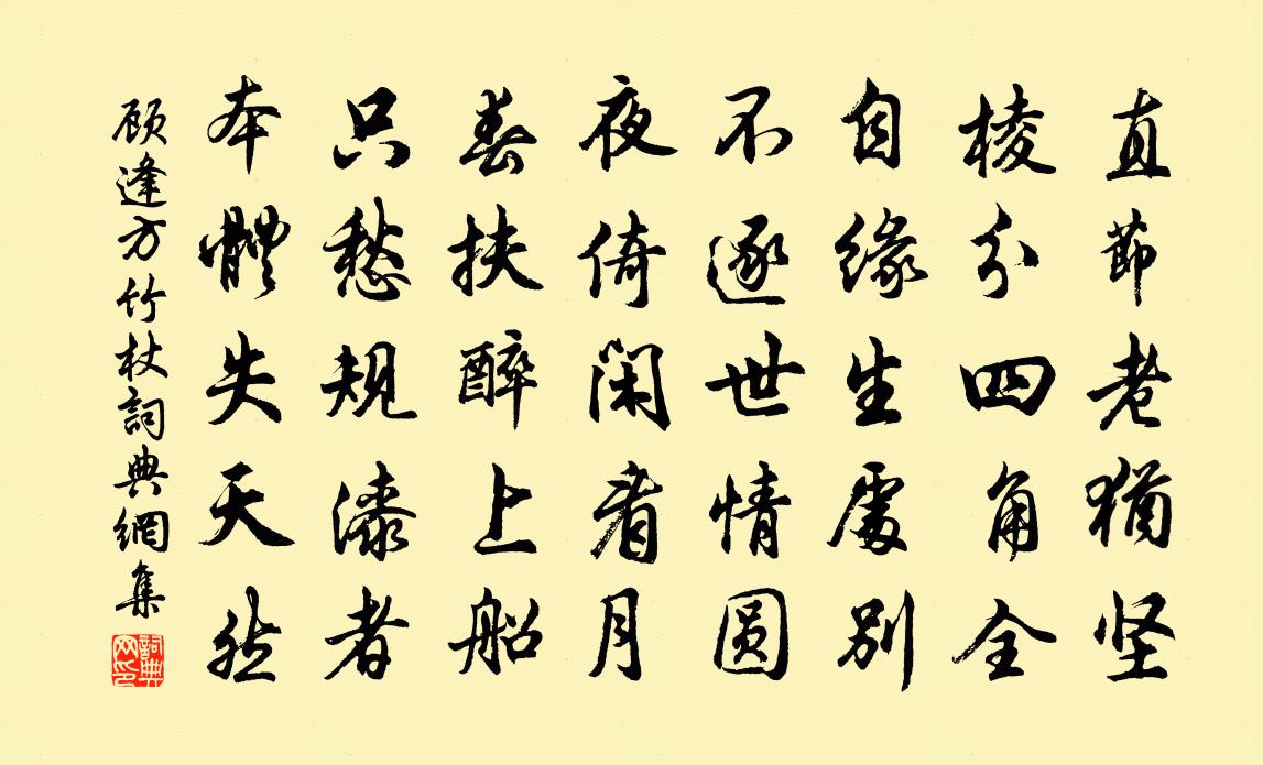 詩詞名句歷史字典書法欣賞書法字典國語詞典說文解字康熙字典古漢語字典標 題 作 者 詩 句 方竹杖作者:顧逢 朝代:宋代方竹杖原文直節老猶堅,棱分四角全。自緣生處別,不逐世情圓。夜倚閑看月,春扶醉上船。只愁規漆者,本體失天然。詩詞問答問:方竹杖的作者是誰?答:顧逢問:方竹杖寫於哪個朝代?答:宋代顧逢方竹杖書法欣賞方竹杖書法作品詩詞推薦別夔州官吏劉禹錫〔唐代〕三年楚國巴城守,一去揚州揚子津。青帳聯延喧驛步,白頭俯傴到江濱。巫山暮色常含雨,峽水秋來不恐人。惟有雜興利登〔宋代〕我昔此園游,寒梅吐孤艷。重來幾何間,叢青倏以遍。誰雲花與葉,同樹不相見。望江南張繼先〔宋代〕西源好,岩館鑿松F625。五斗洞前斟玉斝,半酣窗外撫金杯。無累自悠哉。青翠色,玉竹自新栽。風到莫來搖沁園春嚴羽〔宋代〕問訊溪莊,景如之何,吾為平章。自月湖不見,江山零落,驪塘去後,煙月淒涼。有老先生,如梅峰者,健筆縱橫題魏仲遠筠深軒王冕〔元代〕君家住處多幽趣,繞屋琅玕淨無數。蕭蕭清韻動天風,冉冉晴陰生綠霧。湖山遠映蒼翠稠,五月六月涼如秋。且開關王祠李流謙〔宋代〕萬人傑誰可敵,千載名終不磨。此地晚鐘晨梵,生前鐵馬金弋。閒適白居易〔唐代〕祿俸優饒官不卑,就中閒適是分司。風光暖助遊行處,雨雪寒供飲宴時。肥馬輕裘還粗有,粗歌薄酒亦相隨。微躬詠螢於季子〔唐代〕卉草誠幽賤,枯朽絕因依。忽逢借羽翼,不覺生光輝。直念恩華重,長嗟報效微。方思助日月,為許願曾飛。法曲(入破第二)曹勛〔宋代〕清晝靜居香冷,風動萬年枝。涼應兌卦體。秋色鳴輕颸。冥心運正一。御鐵牛、耕寸地。都種金錢花,秀色照戊己晦日詔宴永穆公主亭子賦得流字張說〔唐代〕堂邑山林美,朝恩晦日游。園亭含淑氣,竹樹繞春流。舞席千花妓,歌船五彩樓。群歡與王澤,歲歲滿皇州。和三司蔡君謨內翰麞猿蘆雁屏二首王珪〔唐代〕麞猿未省京華見,畫筆新傳思入神。綠野春深將戲子,空山朋午掛吟身。只應有夢須懷土,卻為無機不避人。我愛沅陵契丈用蕃將至辰州寄在伯兄韻作詩見屬用趙蕃〔宋代〕往日交遊才著我,近來酬唱喜添君。請君立拜詩壇將,容我閒尋茗椀勛。蝶戀花(密州冬夜文安國席上作)蘇軾〔宋代〕簾外東風交雨霰。簾里佳人,笑語如鶯燕。深惜今年正月暖。燈光酒色搖金盞。摻鼓漁陽撾未遍。舞褪瓊釵,汗濕送江水曹還遠館詩謝朓〔南北朝〕高館臨荒途。清川帶長陌。上有流思人。關卡是望歸客。塘邊草雜紅。樹際花猶白。日暮有重城。何由盡離席。范子庚見示長書晁公溯〔宋代〕百川各分流,至海皆同源。儻於中道畫,潢污無本根。子今始濫觴,如河發崑崙。勿作澗溪止,當規溟海尊。誰謂次韻潁叟弟送行蘇泂〔宋代〕間道驅車逐帥旗,別情惟有弟兄知。百年同好少張仲,舉世誰人似子期。竹葉尚堪中酒聖,梅花真是斷腸枝。蒼崖和子長見招韻四首袁說友〔宋代〕青林綠幄春歸後,翠岫蒼崖雨過初。作意尋幽還得笑,隨宜供客莫求余。龍尾泉黃非熊〔宋代〕龍頭何在尾猶存,定向天中飲漢源。且注靈泉清洞府,未呵甘雨活乾坤。半空飛下珠千顆,平地澄來玉一盆。寂寞贈雲岫上人丘葵〔宋代〕諸生多晚出,一老獨高年。月照遺經匣,雲生破衲褰。苔深埋屐齒,屋老帶松煙。何日塵氛斷,從師此話禪。東陽道中二首葛紹體〔宋代〕麥隴東風半展須,桃紅柳綠自相於。耕犂歇午炊煙起,斷岸溪頭人釣魚。名句推薦強本而節用,則天不能貧。荀子《荀子·天論》 綠雲擾擾,梳曉鬟也;杜牧《阿房宮賦》 兒女此情同。往事朦朧。湘娥竹上淚痕濃。辛棄疾《浪淘沙·賦虞美人草》 盧家少婦鬱金堂,海燕雙棲玳瑁梁。沈佺期《古意呈補闕喬知之 / 古意 / 獨不見》 梅花雪,梨花月,總相思。張惠言《相見歡·年年負卻花期》 愁煩中具瀟灑襟懷,滿抱皆春風和氣王永彬《圍爐夜話·第七八則》 歲夜高堂列明燭,美酒一杯聲一曲。李頎《聽安萬善吹觱篥歌》 勿以身貴而賤人,勿以獨見而違眾。姜子牙《六韜·龍韜·立將》 境難足於心,盡行放下,則未有不足矣。王永彬《圍爐夜話·第一一三則》 奢者富而不足,何如儉者貧而有餘。洪應明《菜根譚·概論》