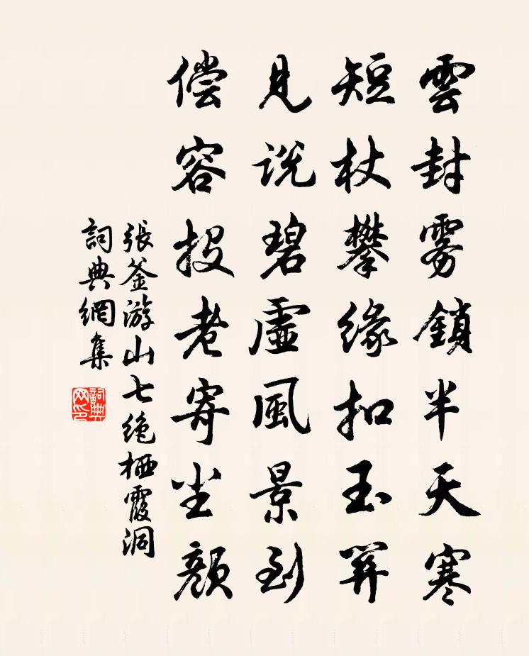 詩詞名句歷史字典書法欣賞書法字典國語詞典說文解字康熙字典古漢語字典標 題 作 者 詩 句 游山七絕棲霞洞作者:張釜 朝代:宋代游山七絕棲霞洞原文雲封霧鎖半天寒,短杖攀緣扣玉關。見說碧虛風景到,償容投老寄塵顏。詩詞問答問:游山七絕棲霞洞的作者是誰?答:張釜問:游山七絕棲霞洞寫於哪個朝代?答:宋代張釜游山七絕棲霞洞書法欣賞游山七絕棲霞洞書法作品詩詞推薦郊意境格二首釋普聞〔宋代〕水闊天長雁影孤,眠沙鷗鷺倚黃薦。半收小雨西風冷,藜杖相半入畫書。齊山詩呈王學士司馬光〔宋代〕江上有奇山,群峰矗如翦。昔聞齊刺史,置酒升絕巘。其人有惠政,嘉名自茲遠。君來踵其跡,詞牒日清簡。驪駒酬和二章拜呈慈雲大師伏惟采覽和種桂胡則〔宋代〕累累丹桂子,秋落古禪關。乍到圓蟾窟,潛依靈鷲山。始知塵外有,會向月中攀。千載孤峰上,清陰與客閒。蜀酒歌陸游〔宋代〕漢州鵝黃鸞鳳雛,不騺不搏德有餘;眉州玻璃天馬駒,出門已無萬里塗。病夫少年夢清都,曾賜虛皇碧琳腴,文德清平樂袁去華〔宋代〕春愁錯莫。風定花猶落。鬥草踏青閒過卻。乳燕鳴鳩自樂。行人江北江南。滿庭萱草毿毿。且恁亡憂可矣,只他怎西江孔武仲〔宋代〕灩灩西江水,朝朝伴我行。雲天初散豁,秋色正分明。魚逝應相得,鷗來故不驚。煙波聊寄適,南北久忘情。和吳沖卿學士省中植菊梅堯臣〔宋代〕園菓已熟實未墜,野卉已老葉未瘁。菊叢是時方發榮,潭上籬邊俱有為。一從潭島輔長年,一自籬根圖暫醉。今將聞卞氏舊有怪石藏宅中問其遺孫指一廢井雲盡李若水〔宋代〕昔人遊宦久江湖,怪石嵌空駭里閭。一井深藏緣底事,百年不出待潛夫。棄捐泥土性仍在,睥睨林亭氣漸蘇。微物太上虛皇黃庭經句法十篇壽趙師程珌〔宋代〕莫辭金盞十分斟,邇日星郎寵數深,庭前桂子更鮮新。鰲頭早晚貼塗金,公亦綠殿峨華簪。九日有感再書方回〔宋代〕荒山過雨薄寒新,洗盡西風扇底塵。萍梗江湖今故國,干戈天地幾遺民。向來佳節都如夢,不謂衰年剩此身。草草長歌行劉復〔唐代〕淮南木落秋雲飛,楚宮商歌今正悲。青春白日不與我,當壚舉酒勸君持。出門驅馳四方事,徒用辛勤不得意。三山子夜四時歌冬陸龜蒙〔唐代〕南雲走冷圭,北籟號空木。年年任霜霰,不減篔簹綠。北風行劉基〔明代〕城外蕭蕭北風起,城上健兒吹落耳。將軍玉帳貂鼠衣,手持酒杯看雪飛。偈傾一百六十九首釋智朋〔宋代〕行路難,有何難。不見陶淵明,採菊東籬下,悠然見南山。彼此丈夫,莫受人瞞。橋丁謂〔宋代〕鞭石滔滔遠,填烏歲歲新。七星橫巨浸,半月映長津。永固騫崩勢,終無揭厲因。時逢題柱客,不見脫輈人。浣溪沙劉仲尹〔元代〕貼體宮羅試袷衣。冰藍嬌淺染東池。春風一把瘦腰支。戲鏤寶鈿呈翡翠,笑拈金翦下酴。最宜京兆畫新眉。題宴坐石太史章〔宋代〕白雲曾罩定中身,石上雲歸不見人。應有山神常守獲,松風時為埽埃塵。述懷二首郭昭乾〔宋代〕箕穎久淪沒,矯矯誰能群。憶昔讓王者,高風殊可聞。我懷在廖廓,思勒滄浪勛。何時凌紫蹻,翛然絕塵氛。七夕錢惟演〔宋代〕紫天銀水渡辛夷,藻帳雕屏解佩時。金朔窗中窺阿母,小姑堂上憶蘭芝。初宵已有穿針樂,欲曙還成弄杼悲。若比靈溪舟中風雨陳宗遠〔宋代〕斜風吹雨打篷窗,獨棹孤舟向曉江。沙岸竹洲煙漠漠,青山飛鷺一雙雙。名句推薦傷心秦漢經行處,宮闕萬間都做了土。張養浩《山坡羊·潼關懷古》 曉迎秋露一枝新,不占園中最上春。杜牧《紫薇花》 看破的,遁入空門;痴迷的,枉送了性命。曹雪芹《紅樓夢·第五回》 愁煩中具瀟灑襟懷,滿抱皆春風和氣王永彬《圍爐夜話·第七八則》 雪霏霏,風凜凜,玉郎何處狂飲?魏承班《滿宮花·雪霏霏》 河西幕中多故人,故人別來三五春。岑參《涼州館中與諸判官夜集》 猶喜閏前霜未下,菊邊依舊舞身輕。司空圖《白菊三首》 相州晝錦堂廚醞,衛國淇川岸竹萌。姜特立《雅志小飲適寬仲送相州法醞並竹萌同至》 西宮南內多秋草,落葉滿階紅不掃。白居易《長恨歌》 貞女貴徇夫,捨生亦如此。孟郊《列女操 / 烈女操》