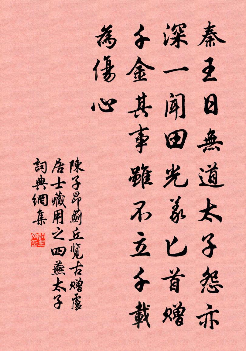 詩詞名句歷史字典書法欣賞書法字典國語詞典說文解字康熙字典古漢語字典標 題 作 者 詩 句 薊丘覽古贈盧居士藏用之四 燕太子作者:陳子昂 朝代:唐代原文秦王日無道。太子怨亦深。一聞田光義。匕首贈千金。其事雖不立。千載為傷心。詩詞問答問:《薊丘覽古贈盧居士藏用之四 燕太子》的作者是誰?答:陳子昂問:該詩寫於哪個朝代?答:唐代問:陳子昂的名句有哪些?答:陳子昂名句大全書法欣賞薊丘覽古贈盧居士藏用之四 燕太子書法作品注釋全唐詩:卷83_9詩詞推薦湘宮人歌溫庭筠〔唐代〕池塘芳草濕,夜半東風起。生綠畫羅屏,金壺貯春水。黃粉楚宮人,芳花玉刻鱗。娟娟照棋燭,不語兩含嚬。十二晚蔡襄〔宋代〕欲尋軒檻倒清尊,江上煙雲向晚昏。須倩樂風吹散雨,明朝卻待入花園。近世飲者尊尚苦味有感成詩李呂〔宋代〕悠悠古先酒,麴櫱化為醴。適口固匪他,詩人詠其旨。岐黃作本草,甘辛味所紀。惟清香滑辣,四事世云爾。孟詵張侍郎示東府新居詩因而和酬二首王安石〔宋代〕榮觀流傳動草萊,中官賜設上尊開。鼓歌(穴下加叫)窱聽疑夢,餚果聯翩饋有台。斧藻故應宜舊德,棟樑非復復庚寅秋病得語不復詮次名曰感懷黎廷瑞〔宋代〕炎夏忽已變,西風飄然秋。親友日已遠,坐感歲月遒。登高明不見,涕泗滂沱流。天高雁未來,落日空悠悠。願為船子和尚贊釋慧遠〔宋代〕老手當年靠夾山,全機喪盡結深冤。父南子北家何在,撥轉天關地軸翻。春從天上來 至元六年庚辰元日立春,將為山宋褧〔元代〕許可用大參,陳景議憲副旭日暾暾。爛春餅堆盤,壽酒盈尊。玉帛交錯,襟佩翩翻。想像虎豹天門。靄蓬萊雲氣,句陳堯佐〔宋代〕部吏百函通爵里,從兵千騎屬鞦韆右健}櫜。倦尋芳(渡口酒家)王質〔宋代〕斷崖樹老,側岸槎枯,倒倚斜插。腳面淺溪,掌樣平洲重疊。著芒鞋,攜竹杖,遇亂莎幽澗縈紆涉。那人家,有竹和道卿舍人奉祠太一齋宮宋祁〔宋代〕素秋來蕊館,瑞祝達霄晨。蘋薦祠無餼,樓居地不塵。擲波琴鯉樂,傍畤漢雞馴。此際清懷極,盈杯沆瀣津。紹熙四年加上壽聖皇太后尊號八首佚名〔宋代〕熙辰禮備,濟濟雍雍。言奉斯冊,重親之宮。宮帷既敞,協氣感通。皇儀親展,壽祉無窮。翁靈舒客臨川因經從訪之不遇聞過村居趙汝鐩〔宋代〕聞道深村裹,結茅三四間。買田因種秫,移樹為看山。詩好人皆誦,身安心自閒。有時思雁盪,依舊棹舟還。和榮安中二絕王灼〔宋代〕射洪春酒舊知名,更得新詩意已傾。獨與劉伶敦契好,山王不敢豈人情。獨酌試藥玉酒盞有懷諸君子明日望夜月庭佳景蘇軾〔宋代〕鎔鉛煮白石,作玉真自欺。琢削為酒杯,規摹定州瓷。荷心雖淺狹,鏡面良渺瀰。持此壽佳客,到手不容辭。曹侯牽牛花三首楊萬里〔宋代〕曉思歡欣晚思愁,繞籬縈架太嬌柔。木犀未發芙蓉落,買斷西風恣意秋。奉和聖制從蓬萊向興慶閣道中留春雨中春望之作應制王維〔唐代〕渭水自縈秦塞曲,黃山舊繞漢宮斜。鑾輿迥出千門柳,閣道回看上苑花。雲里帝城雙鳳闕,雨中春樹萬人家。為乘別擬太上皇帝輓歌詞六首范成大〔宋代〕斂福開皇極,儲祥握赤符。寇降千貐貐,胡拜兩單于。洗甲民安枕,垂衣國覆盂。有生何以報,壽域互綿區。竹溪直院盛稱起予草堂詩之善暇日覽之多有可劉克莊〔宋代〕月體無拘礙,那堪得水清。暫從掬處動,還在水中明。長物瓢安用,寒光握不盈。注眸蟾彩亂,入掌蚌珠生。顧兔長相思周邦彥〔宋代〕好風浮,晚雨收,林葉陰陰映鷁舟,斜陽明倚樓。黯凝眸,憶舊遊,艇子扁舟來莫愁,石城風浪秋。訪姚輔周郎中月陂西園邵雍〔宋代〕相憶不可遏,西街來訪時。交橫過溝水,隙曲繞蔬畦。樹偃低頭避,筇高換手持。朋游相得甚,何樂更如之。名句推薦用國者,得百姓之力者富,得百姓之死者強,得百姓之譽者榮。荀子《荀子·王霸》 義膽包天,忠肝蓋地,四海無人識。施耐庵《念奴嬌·天南地北》 渭城朝雨浥輕塵,客舍青青柳色新。王維《渭城曲 / 送元二使安西》 天下從事者,不可以無法儀。無法儀而其事能成者,無有。墨子《墨子·04章 法儀》 若對黃花孤負酒,怕黃花、也笑人岑寂。劉克莊《賀新郎·九日》 多欲則貪,尚私則枉,其罪遂生。來俊臣《羅織經·閱人卷第一》 本是同根生,相煎何太急?曹植《七步詩》 愁煩中具瀟灑襟懷,滿抱皆春風和氣;暗昧處見光明世界,此心即白日青天。王永彬《圍爐夜話·第七八則》 赤闌橋盡香街直,籠街細柳嬌無力。陳克《菩薩蠻·赤闌橋盡香街直》 佇聽寒聲,雲深無雁影。周邦彥《關河令·秋陰時晴漸向暝》