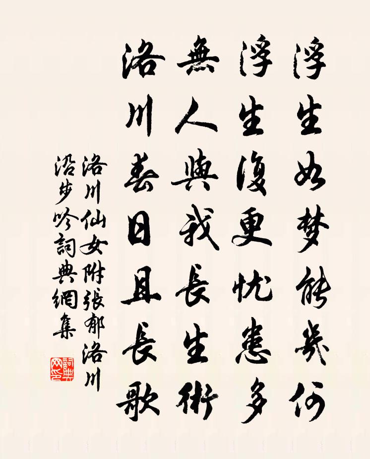 詩詞名句歷史字典書法欣賞書法字典國語詞典說文解字康熙字典古漢語字典標 題 作 者 詩 句 附:張郁洛川沿步吟作者:洛川仙女 朝代:唐代附:張郁洛川沿步吟原文浮生如夢能幾何,浮生復更憂患多。無人與我長生術,洛川春日且長歌。詩詞問答問:附:張郁洛川沿步吟的作者是誰?答:洛川仙女問:附:張郁洛川沿步吟寫於哪個朝代?答:唐代問:附:張郁洛川沿步吟是什麼體裁?答:七絕洛川仙女附:張郁洛川沿步吟書法欣賞附:張郁洛川沿步吟書法作品注釋全唐詩:卷863-12詩詞推薦循省鄭剛中〔宋代〕僦居栽竹暮清幽,縶系其如是楚囚。高枕亦成驚枕夢,小窗長作客窗愁。捫心罪在愚臣戇,肉骨恩歸聖主優。日有漫興十一首趙蕃〔宋代〕釣發關余謂吉徵,長年三老爾何憑。那知我本江湖士,失腳東來亦墮罾。春雪陳洪〔宋代〕光映妝樓月,花隨歌扇風。欲妒梅將柳,故落早春中。東郊少步仇遠〔宋代〕高低遠近樹陰濃,杖屨閒行萬綠中。一片殘紅無覓處,卻疑身在碧紗籠。贈唐祖二子王翰〔唐代〕鴻飛遵枉渚,鹿鳴思故群。物情尚勞愛,況乃予別君。別時花始發,別後蘭再薰。瑤觴滋白露,寶瑟凝涼氛。裴徊八哀詩贈司空王公思禮杜甫〔唐代〕司空出東夷,童稚刷勁翮。追隨燕薊兒,穎銳物不隔。服事哥舒翰,意無流沙磧。未甚拔行間,犬戎大充斥。短小挽陳北山二首劉克莊〔宋代〕握筆臨池慣,殘書映雪勤。今寧無古篆,寧復有唐文。荒草周顒宅,空山董相墳。何時攜斗酒,一酹墨溪雲。虞永康生日魏了翁〔宋代〕良知誰不有,靡究復靡屆。寸心日月明,萬里天地解。握機洞消長,觀物了成壞。推行濟四海,小試未為隘。姓名作蠶絲佚名〔南北朝〕春蠶不應老,晝夜常懷絲。何惜微軀盡, * 自有時。再委趙丞陽山送龍禱雨虞儔〔宋代〕傳聞神姥產英靈,雷電當時亦晦冥。好雨因宜隨禱應,夜窗曾誤幾番聽。關心病守頭空白,失喜農夫眼倍青。水溢太平興國寺鎖翠軒王冕〔元代〕當軒種竹一萬個,清蔭滿林生綠苔。六月不知天氣熱,長年只覺雨聲來。豈惟鳳鳥不食實?又見龍孫漸脫胎。計我梅三首曾豐〔宋代〕太清儲氣置南荒,非我閒生誰足當。瘦可以風饒道骨,白難為月飽神光。寧教大庾有山色,莫管長安無國香。驛使同州端午殷堯藩〔唐代〕鶴髮垂肩尺許長,離家三十五端陽。兒童見說深驚訝,卻問何方是故鄉。送雨浙轉連道卿學士二首宋庠〔宋代〕彼美閨台彥,胡為江海行。真貪子舍養,不厭使軺輕。茂草姑蘇苑,蒼山越絕城。莫因羊酪味,終擬笑諸倉。本來上人釋祖欽〔宋代〕本人曾來亦不去,百二十日如是住。昨夜西風忽轉頭,花開闌畔木犀樹。收拾行囊話起單,集雲東湖來去間。雙桂秋日憫旱題香山庄舍王之道〔宋代〕千里驕陽稼穡枯,人心窮極但天呼。須煩岩壑為霖手,下澤蒼生慰海隅。和韓五持國乞分道損山藥之什梅堯臣〔宋代〕不種東陵瓜,不利千畦韭。山藥數十本,帶土移野叟。故葉萎未醒,傷根亦何咎。既為君子好,豈與騷人負。騷人寄題四川總餉陳郎中籌邊堂項安世〔宋代〕四萬黃金六出奇,家藏犬豹虎龍機。古傅財賞軍能壯,今見樵蘇士不飢。借得留侯千里箸,掃平冒頓五方圍。是朝示超然上人釋曇瑩〔宋代〕往事明明是夢中,髮霜那有舊形容。客床對臥秋深雨,聽得鄰僧半夜鍾。自儆陸游〔宋代〕經術吾家事,躬行更不疑。仁常為己任,清每畏人知。古訓必三復,危途仍十思。兢兢死方已,寧論迫期頤。名句推薦千羊之皮不如一狐之腋。司馬遷《史記·趙世家》 莫嫌舉世無知己,未有庸人不忌才。查慎行《三閭祠》 十輪霜影轉庭梧,此夕羈人獨向隅。晏殊《中秋月》 日暖桑麻光似潑,風來蒿艾氣如薰。蘇軾《浣溪沙·軟草平莎過雨新》 柳葉雙眉久不描,殘妝和淚污紅綃。江采萍《謝賜珍珠》 事不至大,無以驚人。案不及眾,功之匪顯。來俊臣《羅織經·瓜蔓卷第十二》 牽衣頓足攔道哭,哭聲直上乾雲霄。杜甫《兵車行》 獨自莫憑欄,無限江山,別時容易見時難。李煜《浪淘沙令·簾外雨潺潺》 不知何歲月,得與爾同歸?韋承慶《南中詠雁詩》 琅琅新雨洗湖天,小景六橋邊。張可久《風入松·九日》