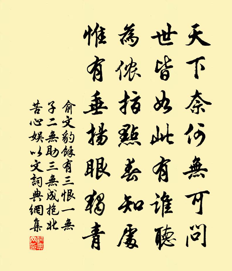 詩詞名句歷史字典書法欣賞書法字典國語詞典說文解字康熙字典古漢語字典標 題 作 者 詩 句 余有三恨一無子二無助三無成抱北苦心娛以文作者:俞文豹 朝代:宋代原文天下奈何無可問,世皆如此有誰聽。為儂指點春知處,惟有垂揚眼獨青。詩詞問答問:《余有三恨一無子二無助三無成抱北苦心娛以文》的作者是誰?答:俞文豹問:該詩寫於哪個朝代?答:宋代書法欣賞余有三恨一無子二無助三無成抱北苦心娛以文書法作品詩文賞析【原題】:余有三恨一無子二無助三無成抱北苦心娛以文字既絕筆於斯錄復長吟以擊之詩詞推薦浮雲宮袁陟〔宋代〕為余傳語嶺頭雲,君自無心笑我勤。我亦暫來稱使者,眼看官職似看君。和晏尚書出城口占四首宋祁〔宋代〕千里梁陳一眺分,古愁今恨枉相聞。早須跋馬收清思,莫看沈西日暮雲。錢郎中寫真求贊釋正覺〔宋代〕勝淨明心,混融古今。河漢之氣清秋闊,牛斗之光寒夜深。機歷歷兮錦梭吐緒,道綿綿兮玉線聯針。月漾珊瑚海,夏初示兒曹曾幾〔宋代〕鳥聲四合陰扶疏,江湖散人拜賜初。此君之子才墮地,一一文采如於菟。相看又作故時面,乃是秋風篋中扇。寸陰酥張蘊〔宋代〕兼味醍醐外,分身乳酪中。江南鳴穉犢,塞上寄飛鴻。乾雨看如幻,生鹽訝漸融。臘殘猶有待,煎取牡丹紅。有懷廣文俞同年虞儔〔宋代〕祝君努力且加餐,世路羊腸政屈盤。烹鯉何由問訊息,割雞政自困平單。書生說食真成癖,俗子疑人莫與看。搜攪失調名佚名〔宋代〕便是監商孟客兒。浣溪沙趙必〔宋代〕只為相思怕上樓。離鶯一操恨悠悠。十二翠屏煙篆冷,曉窗秋。繡線未拈心已懶,花箋欲寄寫還羞。懊恨郎邊無個句宋白〔宋代〕吉音來碧落,帖子報紅箋。何山仇遠〔宋代〕溪轉峰迴一徑平,田頭白水照人清。寺因何氏封山姓,客把坡詩證地名。蘿月長隨行道影,杉風猶帶讀書聲。雲津玉岑徐集孫〔宋代〕一抹斜陽掛淺林,細聽山鳥說春心。千年古寺多奇蹟,讀了豐碑看玉岑。挽知軍劉公三首陳棣〔宋代〕昔我先君子,期公泰茹連。索文姑作贄,拂袖遽言旋。偉節人難學,高風史逸傳。邕碑誰秉筆,願采入新篇。雜記五言十首劉克莊〔宋代〕追日忍渴走,喝月使倒行。夸父骨已朽,秦皇冢亦平。和李天麟秋懷五絕句楊萬里〔宋代〕漫浪歸來歲又秋,依然風月朁人愁。奉酬只麽隨緣句,懶更雕肝與探鉤。梅花絕句陸游〔宋代〕低空銀一鉤,糝野玉三尺。愁絕水邊花,無人問訊息。石魚湖上醉歌元結〔唐代〕序:漫叟以公田米釀酒,因休暇,則載酒於湖上,時取一醉。歡醉中,據湖岸,引臂向魚取酒,使舫載之,偏飲坐梳頭看可正平詩有寄養直時未祝髮等篇楊萬里〔宋代〕老子平生湯餅腸,客間湯餅亦何嘗。怪來今晚加餐飯,一味廬山筍蕨香。踏雲行 本名踏莎行 自遣王丹桂〔元代〕壬癸才升,丙西已降。往來澆灌黃芽長。靈童採摘赴瑤宮,笙簧迎引聲嘹亮。虎嘯祥風,龍翻雪浪。斡旋造化憑真上陽宮侍宴應制得林字宋之問〔唐代〕廣樂張前殿,重裘感聖心。砌蓂霜月盡,庭樹雪雲深。舊渥驂宸御,慈恩忝翰林。微臣一何幸,再得聽瑤琴。棲雲中伏何澹〔宋代〕炎官驅我入山椒,日日松聲似海潮。四月黃梅無不雨,卻來三伏洗炎歊。名句推薦不愁屋漏床床濕,且喜溪流岸岸深曾幾《蘇秀道中》 相思似海深,舊事如天遠。樂婉《卜運算元·答施》 寄語天涯客,輕寒底用愁。于謙《除夜太原寒甚》 霜風漸欲作重陽,熠熠溪邊野菊香。蘇軾《捕蝗至浮雲嶺山行疲苶有懷子由弟二首·其二》 烏鵲倦棲,魚龍驚起,星斗掛垂楊。陳亮《一叢花·溪堂玩月作》 亂雲低薄暮,急雪舞迴風。杜甫《對雪》 舊時王謝堂前燕,飛入尋常百姓家。劉禹錫《烏衣巷》 戀樹濕花飛不起,愁無比,和春付與東流水。朱服《漁家傲·小雨纖纖風細細》 君子成人之美,不成人之惡;小人反是。孔子弟子《論語·顏淵篇》 解鞍欹枕綠楊橋,杜宇一聲春曉。蘇軾《西江月·頃在黃州》