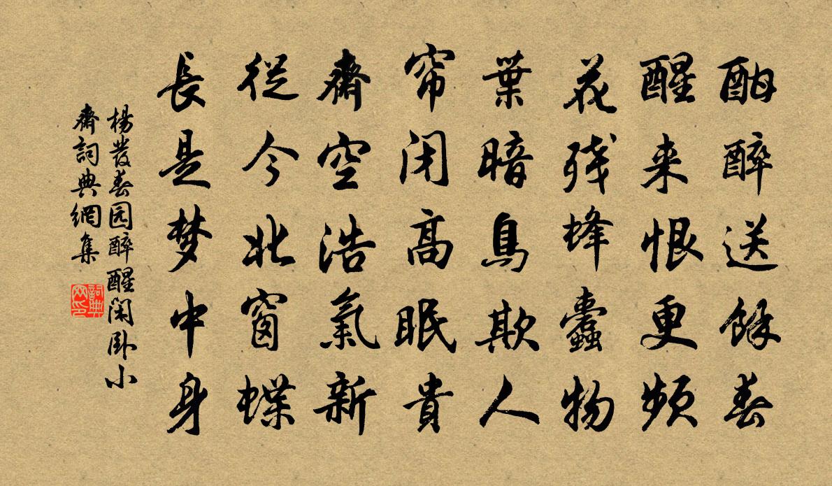 詩詞名句歷史字典書法欣賞書法字典國語詞典說文解字康熙字典古漢語字典標 題 作 者 詩 句 春園醉醒閒臥小齋作者:楊發 朝代:唐代春園醉醒閒臥小齋原文酣醉送餘春,醒來恨更頻。花殘蜂蠹物,葉暗鳥欺人。簾閉高眠貴,齋空浩氣新。從今北窗蝶,長是夢中身。詩詞問答問:春園醉醒閒臥小齋的作者是誰?答:楊發問:春園醉醒閒臥小齋寫於哪個朝代?答:唐代問:春園醉醒閒臥小齋是什麼體裁?答:五律楊發春園醉醒閒臥小齋書法欣賞春園醉醒閒臥小齋書法作品注釋全唐詩:卷517-2詩詞推薦春閨思王涯〔唐代〕雪盡萱抽葉,風輕水變苔。玉關音信斷,又見發庭梅。和黃幾叔墨梅二絕洪咨夔〔宋代〕六月夜窗留取看,霜風蕭颯墮林端。問渠底事青青晚,恥上尋常桃李盤。暮景楊冠卿〔宋代〕客行無常期,遠適亦有歸。家人具膏沐,垢發幸一晞。可憐兒時面,坐受塞色欺。看鏡恍如失,功名定何時。買油釋印肅〔宋代〕三百六十斤油,何須苦苦問他求。心光廓徹燈何用,水草無心若畫牛。五味舌頭無足日,煎熬煮炙幾時休。功辨斯梅花對飲葛紹體〔宋代〕半痕霜月曉窗低,三兩梅花作伴棲。盂飲花邊更風度,石泉湯潑嫩鹽虀。滿江紅·江漢西來蘇軾〔宋代〕江漢西來,高樓下、蒲萄深碧。猶自帶、岷峨雲浪,錦江春色。君是南山遺愛守,我為劍外思歸客。對此間、風物和吳微明疏影橫斜水清淺七詠韻李呂〔宋代〕深叢茉莉香有餘,濃李爭春俗不除。借箸推排風味勝,尖新莫向小梅疏。投老高翥〔宋代〕投老才營一把茅,前臨官路後林坳。最宜雞犬無鄰舍,好放牛羊有近郊。春韭采來勝市食,秋鱸留取續山餚。吾廬賢者之孝二百四十首竇融林同〔宋代〕璽書來萬里,鼎足許三分。解道為忠易,誰知以孝聞。贈筆工張嵲〔宋代〕顧兔霜余毫健如,銛錐妙手應時胥。臨池自愧無功用,欲借僧房柿葉書。和送雙鴨洪皓〔宋代〕鶩落春洲整翮毛,呼鷹搏擊自忘勞。充庖豈為食三鼎,改館何須饋七牢。漫詠續弦求鳳髓,休夸辟穀獻龍膏。今朝送謙父弟宋自適〔宋代〕日用功夫在細微,行逢礙處便須疑。高言怕被空虛笑,闊步先防墮落時。次徐相公韻十首劉錡釋行海〔宋代〕五色戎旌百萬鞍,徒夸龍虎統兵官。囂喧閃電蕃營亂,陣算迴風虜帳寒。兵法用過黃石遠,血盟瀝公盡心乾。太平滿江紅·登黃鶴樓有感岳飛〔宋代〕遙望中原,荒煙外、許多城郭。想當年、花遮柳護,鳳樓龍閣。萬歲山前珠翠繞,蓬壺殿里笙歌作。到而今、鐵騎挽秦國夫人李流謙〔宋代〕伴渙方興日,憂危未決前。偽書知莽詐,新曆斷周延。冰作群疑泮,風從一語傳。龜靈無此識,上智炳機先。坊州按獄舒元輿〔唐代〕中部接戎塞,頑山四周遭。風冷木長瘦,石磽人亦勞。牧守苟懷仁,癢之時為搔。其愛如赤子,始得無啼號。奈何過衡陽晚宿李曾伯〔宋代〕雨後春寒冽,山前夕照斜。身猶尋壘燕,聲雜宿林鴉。過嶺尚千里,隔村能幾家。毋嫌茅店惡,窗下有梅花。和顏長官百詠邊庭朱繼芳〔宋代〕探使歸來半信疑,帳前相語怕人知。沉香霧裡嬌弦暖,莫遣邊愁到兩眉。過嚴子陵釣台二首張浚〔宋代〕古木籠煙半鎖空,高台隱隱翠微中。身安不羨三公貴,寧與漁樵卒歲同。頌古十九首釋慧暉〔宋代〕混而不雜體常虛,雪月交光類莫如。應處萬端無掛礙,片雲自在卷還舒。名句推薦小時不識月,呼作白玉盤。李白《古朗月行》 驪山四顧,阿房一炬,當時奢侈今何處?張養浩《山坡羊·驪山懷古》 一曲高歌一樽酒,一人獨釣一江秋。王士禎《題秋江獨釣圖》 海內風塵諸弟隔,天涯涕淚一身遙。杜甫《野望》 誰向若耶溪上,倩美人西去,麋鹿姑蘇。辛棄疾《漢宮春·會稽蓬萊閣懷古》 惱他香閣濃睡,撩亂有啼鶯。晏殊《訴衷情·東風楊柳欲青青》 柳色黃金嫩,梨花白雪香。李白《宮中行樂詞八首》 木落雁南度,北風江上寒。孟浩然《早寒江上有懷 / 早寒有懷 / 江上思歸》 草枯鷹眼疾,雪盡馬蹄輕。王維《觀獵》 功名萬里外,心事一杯中。高適《送李侍御赴安西》