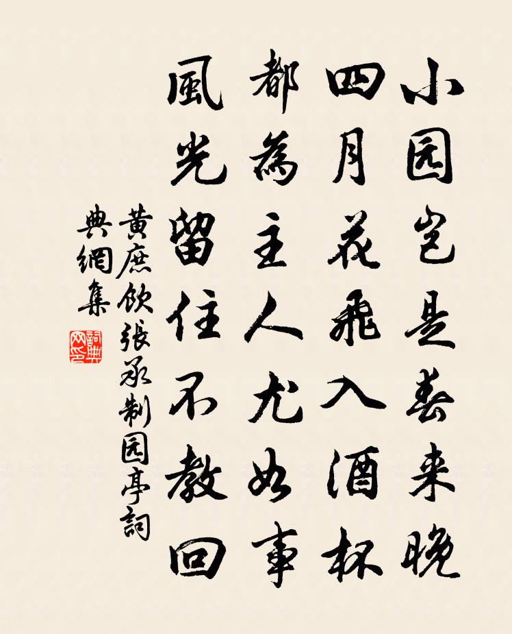 詩詞名句歷史字典書法欣賞書法字典國語詞典說文解字康熙字典古漢語字典標 題 作 者 詩 句 飲張承制園亭作者:黃庶 朝代:宋代飲張承制園亭原文小園豈是春來晚,四月花飛入酒杯。都為主人尤如事,風光留住不教回。詩詞問答問:飲張承制園亭的作者是誰?答:黃庶問:飲張承制園亭寫於哪個朝代?答:宋代問:飲張承制園亭是什麼體裁?答:七絕黃庶飲張承制園亭書法欣賞飲張承制園亭書法作品詩詞推薦答韓中丞容不飲酒李頻〔唐代〕老大成名仍足病,強聽絲竹亦無歡。高情太守容閒坐,借與青山盡日看。滿江紅 至元丙戌,敏中興廣平安思承同為御劉敏中〔元代〕而志意又同,以是交甚款。又畸思承得拜其兄今宣慰公於其家,公即歡然相接,傾倒如書。公時在京領漕運,明年南山感舊劉克莊〔宋代〕既具頂門眼,逐得少林髓。南山梵王宮,規模自唐始。送陳郎玉汝之官二首劉克莊〔宋代〕管鮑交三世,朱陳共一村,居慚阿承女,獲事太丘孫。惜別吾鍾愛,相賓右格言。應憐垂白叟,計日望回轅。陽春曲張詠〔宋代〕東風習習吹庭樹,知道春權移日馭。青紅獨解露春心,凝冷無言避春去。大有閒階白日長,清詞麗句祝春皇。春皇過達磨泉緬懷東坡曾豐〔宋代〕分野秦南海,城池漢尉佗。功名徒自苦,寒暑暗相磨。破寺容僧少,枯松閱士多。我來空想像,百世一東坡。山行二首釋善珍〔宋代〕歸牛晚失犢,牧童學聲喚。溪邊白鷺鷥,銜魚上田岸。放船敖陶孫〔宋代〕柳邊放船試南風,揚溪荷花能艷紅。一川雲錦步不盡,我舟正在繁香中。午天無雲青脈脈,枕舷哀歌醉脫幘。更將題蜀江觀姚勉〔宋代〕幸喜甘霖做歲豐,靈泉又奏濟人功。但令奸猾銷聲好,莫禁民躋壽域中。投李益賈島〔唐代〕四十歸燕字,千年外始吟。已將書北嶽,不用比南金。次韻凝翠閣看水鄧肅〔宋代〕欄桿十二俯煙濤,冒雨從君一醉陶。頗覺寒窗侵島瘦,故將勝景助韓豪。波聲裂岸魚歌遠,水勢橫天釣艇高。前日別湯伯紀朱復之〔宋代〕停雲思何長,伐木夢苦短。飄搖乘風來,倏霍搏沙散。匪今我獨黯,自昔客屢嘆。之子曷雲戾,微陽逼候炭。囚山訪桂衛宗武〔宋代〕行秋遍歷谷之陽,粲粲岩花競晚芳。僧宇盡成金粟界,天風處處散天香。高宗皇帝輓詞林栗〔宋代〕兼愛無南北,全能冠古今。典墳供夜覽,烽火自宵沉。睿藻成章煥,宸鈞寓意深。萬年垂琬琰,誰識至仁心。望夫石劉禹錫〔唐代〕終日望夫夫不歸,化為孤石苦相思。望來已是幾千載,只似當時初望時。奉和李右相中書壁畫山水孫逖〔唐代〕廟堂多暇日,山水契中情。欲寫高深趣,還因藻繪成。九江臨戶牖,三峽繞檐楹。花柳窮年發,煙雲逐意生。能令偈頌八十七首釋慧開〔宋代〕不是護身符,亦非斷貫索。直饒鼻孔遼天,也被這個穿卻。無門老漢還免得麽,卻請維那下個註腳水村姜特立〔宋代〕一水瀉寒玉,數峰羅翠屏。漁樵自來往,不悟落丹青。石橋李禕〔唐代〕別有經行所,迥跨重巒側。粵因求瘼余,倏想尋真域。放情恣披拂,杖策聊□□。□□□□□,□□□□色。亂幡居山樂釋文珦〔宋代〕居山樂無涯,三徑富松菊。山體靜吾心,山光悅吾目。春來山蕨肥,秋後山田熟。未必王侯家,有吾清淨福。名句推薦欲知平直,則必準繩;欲知方圓,則必規矩呂不韋《呂氏春秋·論·不苟論》 居必擇鄉,游必就士。荀子《荀子·勸學》 無材可去補蒼天,枉入紅塵若許年。曹雪芹《紅樓夢·第一回》 千載琵琶作胡語,分明怨恨曲中論。杜甫《詠懷古蹟五首·其三》 悲莫悲生離別,樂莫樂新相識,兒女古今情。辛棄疾《水調歌頭·壬子三山被召陳端仁給事飲餞席上作》 年華共,混同江水,流去幾時回納蘭性德《滿庭芳·堠雪翻鴉》 虜騎聞之應膽懾,料知短兵不敢接,車師西門佇獻捷。岑參《走馬川行奉送出師西征 / 走馬川行奉送封大夫出師西征》 脈脈花疏天淡,雲來去、數枝雪。范成大《霜天曉角·梅》 為害常因不察,致禍歸於不忍。來俊臣《羅織經·閱人卷第一》 無情燕子,怕春寒、輕失花期。晁沖之《漢宮春·梅》