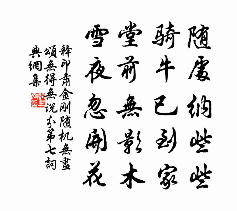 詩詞名句歷史字典書法欣賞書法字典國語詞典說文解字康熙字典古漢語字典標 題 作 者 詩 句 金剛隨機無盡頌無得無說分第七作者:釋印肅 朝代:宋代原文隨處納些些,騎牛已到家。堂前無影木,雪夜忽開花。詩詞問答問:《金剛隨機無盡頌無得無說分第七》的作者是誰?答:釋印肅問:該詩寫於哪個朝代?答:宋代書法欣賞金剛隨機無盡頌無得無說分第七書法作品詩詞推薦郡圃宋祁〔宋代〕側曲艷歌閒送日,晚花初葉暗留春。舞狂風蝶時過樹,啼熟林鶯不避人。大父令賦舊扇蘇籀〔宋代〕裁紈當團扇,當暑不離手。炎涼一推遷,委擲昏塵垢。蒙蒙縈蛛網,闇闇迷遠岫。人情逐時移,浪自分好醜。一朝景純復以二篇一言其亡兄與伯父同年之契一言蘇軾〔宋代〕靈壽扶來似孔光,感時懷舊一悲涼。蟾枝不獨同攀桂,雞舌還應共賜香。(亦同為郎。)等是浮休無得喪,粗分憂九日席上賦得茱萸韓維〔宋代〕寥落霜園樹,萸房獨照秋。實兼蘭佩結,香近玉卮浮。嗔蕊醒殘醉,紉紅感舊遊。三英佳句在,殊喜繼風流。挽張梅坦二首陳著〔宋代〕之子吾鄉秀,生來踏上風。蘭亭高擢穎,芹泮早稱雄。科第孫山秀,吟情灞雪中。□□□□□,□□□□□。通守黃子說解印造朝之日江梅輒花天其或者以史彌寧〔宋代〕鵷甃霜明欺曉色,一筆巡檐梅摘索。犯寒上隊出郊坰,攀折南枝餞行客。此客端的梅樣清,秋水為神月為魄。瑤葩和陝州參軍李通微首夏書懷呈同寮張裳段群二先輩姚鵠〔唐代〕公門何事更相牽,邵伯優賢任養閒。滿院落花從覆地,半檐初日未開關。尋仙鄭谷煙霞里,避暑柯亭樹石間。獨為送少微上人還鹿門顧況〔唐代〕少微不向吳中隱,為個生緣在鹿門。行入漢江秋月色,襄陽耆舊幾人存。臨流郭印〔宋代〕長江一鏡淨,豈但燭鬚眉。清光瑩我心,雙鬢任如絲。鷗鷺近人來,游魚亦可窺。不把塵纓濯,身世兩相遺。好觀秋夜陳文述〔清代〕梧桐葉底見銀河,露氣當窗冷碧羅。四壁蟲聲兩行雁,不知何處得秋多。寄新茶與南禪師黃庭堅〔宋代〕筠焙熟香茶,能醫病眼花。因甘野夫食,聊寄法王家。石缽收雲液,銅缾煮露華。一甌資舌本,吾欲問三車。過石洞度正〔宋代〕修門赫赫鐵城長,雨後山川擁翠光。大似錦屏饒富貴,至今人說狀元坊。郊廟歌辭。漢宗廟樂舞辭。武德舞佚名〔唐代〕明明我祖,天集休明。神母夜哭,彤雲晝興。籩豆有踐,管籥斯登。孝孫致告,神其降靈。見邸報陳杰〔宋代〕正徯朝陽聽鳳鳴,忽傳鵜鴃作秋聲。百年事會紛成毀,一日光陰屢晦明。張霸安能識時務,翟公久自風交情。人間錦溪次趙令韻二首王執禮〔宋代〕困人天氣近清明,花信風來拂面輕。屏卻鳴騶成獨往,綠楊陰里聽鶯聲。客去陸游〔宋代〕相對 * 睡味長,主人與客兩相忘。須臾客去主人覺,一半西窗無夕陽。偈頌一百二十三首釋崇岳〔宋代〕千年田,八百主,郎當屋舍沒人修,不風流處也風流。元覺上人釋祖欽〔宋代〕妙覺明淨,元無所覺。如鄱陽尖服務業波不作。亦若匡廬,雲平月壑。笠頂西風閒去來,拄杖頭邊空索索,打碎靈對燈詠感吳錫疇〔宋代〕竛竮瘦影伴孤燈,兩鬢蕭然失舊青。豪在尚堪論劍術,骨凡何用泥丹經。半生蹤跡如春燕,少日交遊類曙星。閒拂真珠簾(四時懷古夏詞)陳著〔宋代〕青雲玉樹南薰扇。京華地、別是瀟湘圖展。茉莉芰荷香,拍滿笙簫院。雪藕盈盈歌裊處,早已帶、秋聲悽怨。堪嘆名句推薦浮雲不系名居易,造化無為字樂天李忱《吊白居易》 白水滿春塘,旅雁每迥翔。沈約《詠湖中雁》 暮雨相呼失,寒塘欲下遲。崔塗《孤雁二首·其二》 王者不令人放生,而無故卻不殺生,則物命可惜也王永彬《圍爐夜話·第二四則》 布衣得暖真為福,千金平安即是春。佚名《增廣賢文·下集》 人學始知道,不學非自然。孟郊《勸學》 織女牽牛送夕陽,臨看不覺鵲橋長。德容《七夕二首·其二》 無言獨上西樓,月如鉤。李煜《相見歡·無言獨上西樓》 人有所優,固有所劣;人有所工,固有所拙。王充《論衡·卷二十八·書解篇》 深宮桃李無人問,舊愛玉顏今自恨。元好問《玉樓春·驚沙獵獵風成陣》