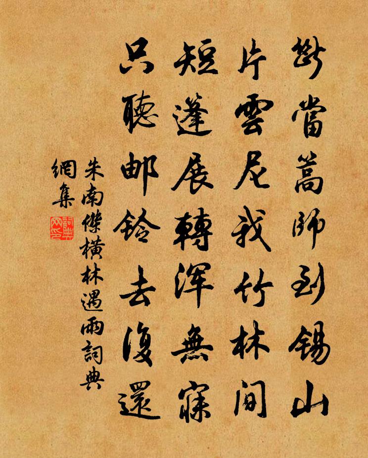 詩詞名句歷史字典書法欣賞書法字典國語詞典說文解字康熙字典古漢語字典標 題 作 者 詩 句 橫林遇雨作者:朱南傑 朝代:宋代橫林遇雨原文斷當篙師到錫山,片雲尼我竹林間。短篷展轉渾無寐,只聽郵鈴去復還。詩詞問答問:橫林遇雨的作者是誰?答:朱南傑問:橫林遇雨寫於哪個朝代?答:宋代朱南傑橫林遇雨書法欣賞橫林遇雨書法作品詩詞推薦維摩贊釋惟一〔宋代〕凜然夷齊之風,悠然巢許之態。橫作竺乾之孽,崛起釋門之害。口吧吧地說盡萬千,究竟不知有這一解。觀上朝宋祁〔宋代〕郁蔥佳氣護天台,銜尾茸題隘路槐。金箭忽鳴衡漏盡,火城爭撲相車來。黃人日映仙盤上,閶闔天隨禁鑰開。規地寒食詩雲表〔唐代〕寒食時看郭外春,野人無處不傷神。平原累累添新冢,半是去年來哭人。題六畫釋善珍〔宋代〕淵明寄奴開國熱龍驤,轉眼更齊又換梁。惟有先生賦歸去,至今猶是晉文章。虛白堂白居易〔唐代〕虛白堂前衙退後,更無一事到中心。移床就日檐閒臥,臥詠閒詩側枕琴。念奴嬌(用東坡赤壁韻)辛棄疾〔宋代〕倘來軒冕,問還是、今古人間何物。舊日重城愁萬里,風月而今堅壁。藥籠功名,酒壚身世,可惜蒙頭雪。浩歌一山村日暮釋永頤〔宋代〕犢背斜陽暖,茅蔣石樹穿。行人識岡路,飢鵲噪沙田。遠浦生微月,荒皋起暝煙。群烏飛散盡,寒水漾漁船。冶城清談陳杰〔宋代〕西周固羸國,東轍幾孱王。信有親親弱,科無善善亡。精詳隋五教,韌略漢三章。始悟清談相,嘉言味最長。江神子慢 詠香姬翼〔元代〕玉童報朝徹。仙夢斷、華胥太平國。素屏側。金爐暖、灰襯雲心虛白。御封坼。一瓣才拈清馥馥,氤氳滿、靈空無哭徐璣五首趙師秀〔宋代〕君早抱奇質,獲與有道親。微官漫不遇,泊然安賤貧。心夷語自秀,一洗世士陳。使其養以年,鮑謝焉足鄰。赴郡之初尋屬愆亢有議舉舊典取湫水徵巫覡以劉筠〔宋代〕優詔將州任,視政才旬時。田畯訴炎暵,坐虞多稼萎。雲將掉頭去,波臣涸轍危。行部殊未及,隨車杳難期。往慚酬江西盧端公藍口阻風見寄之什許渾〔唐代〕又攜刀筆泛膺舟,藍口風高桂楫留。還似郢中歌一曲,夜來春雪照西樓。酹江月(中秋對月)佚名〔宋代〕奩霏淨洗,喚素娥睡起,平分秋色。雁背風高孀兔冷,露腳侵衣香濕。銀浦流雲,珠房迎曉,鬢影霜爭白。玉尊良憶游朱坡四韻杜牧〔唐代〕秋草樊川路,斜陽覆盎門。獵逢韓嫣騎,樹識館陶園。帶雨經荷沼,盤煙下竹村。如今歸不得,自戴望天盆。送楊元功李流謙〔宋代〕判司碌碌塵埃間,可能老盯橫海鱣,一朝雷雨插兩翰。九江風高浪如屋,萬里扁舟帆一幅,夢魂先繞湖山綠。玉除訴衷情令(登郁孤台,與施德初同讀坡詩作)康與之〔宋代〕郁孤台上立多時。煙晚暮雲低。山川城郭良是,回首昔人非。今古事,只堪悲。此心知。一尊芳酒,慷慨悲歌,月登彼公堂燕貢士陳襄〔宋代〕登彼公堂,有松有柏。君子燕湑,其儀孔特。暑詠寄梅集賢楊億〔宋代〕點綴鮮雲紫宙寬,微風淅淅起霜紈。魏台清暑開冰井,漢殿延年啜露盤。天外一飛期汗漫,水邊千畝憶檀樂。流波新居用韓昌黎詩辛勤三十年以有此屋廬為韻蔡戡〔宋代〕我亦大痴人,勸者多不足。抖擻囊中金,傾倒囷內粟。雖雲壁徒立,尚有田可鬻。百口勿啼飢,張頤仰看屋。游城南十六首嘲少年韓愈〔唐代〕直把春償酒,都將命乞花。只知閒信馬,不覺誤隨車。名句推薦嵩雲秦樹久離居,雙鯉迢迢一紙書。李商隱《寄令狐郎中》 相逢清露下,流影濕衣襟。袁枚《夜過借園見主人坐月下吹笛》 日暮征帆何處泊,天涯一望斷人腸。孟浩然《送杜十四之江南 / 送杜晃進士之東吳》 涓流雖寡,浸成江河;爝火雖微,卒能燎野范曄《後漢書·列傳·酷吏列傳》 種竹淇園遠致君,生平孤節負辛勤。王汝舟《詠歸堂隱鱗洞》 片雲天共遠,永夜月同孤。杜甫《江漢》 意輕千金贈,顧向平原笑。李白《古風·齊有倜儻生》 吏不治則亂,農事緩則貧。墨子《墨子·39章 非儒(下)》 不才明主棄,多病故人疏。孟浩然《歲暮歸南山 / 歸故園作 / 歸終南山》 黃昏鼓角似邊州,三十年前上此樓。李益《上汝州郡樓》