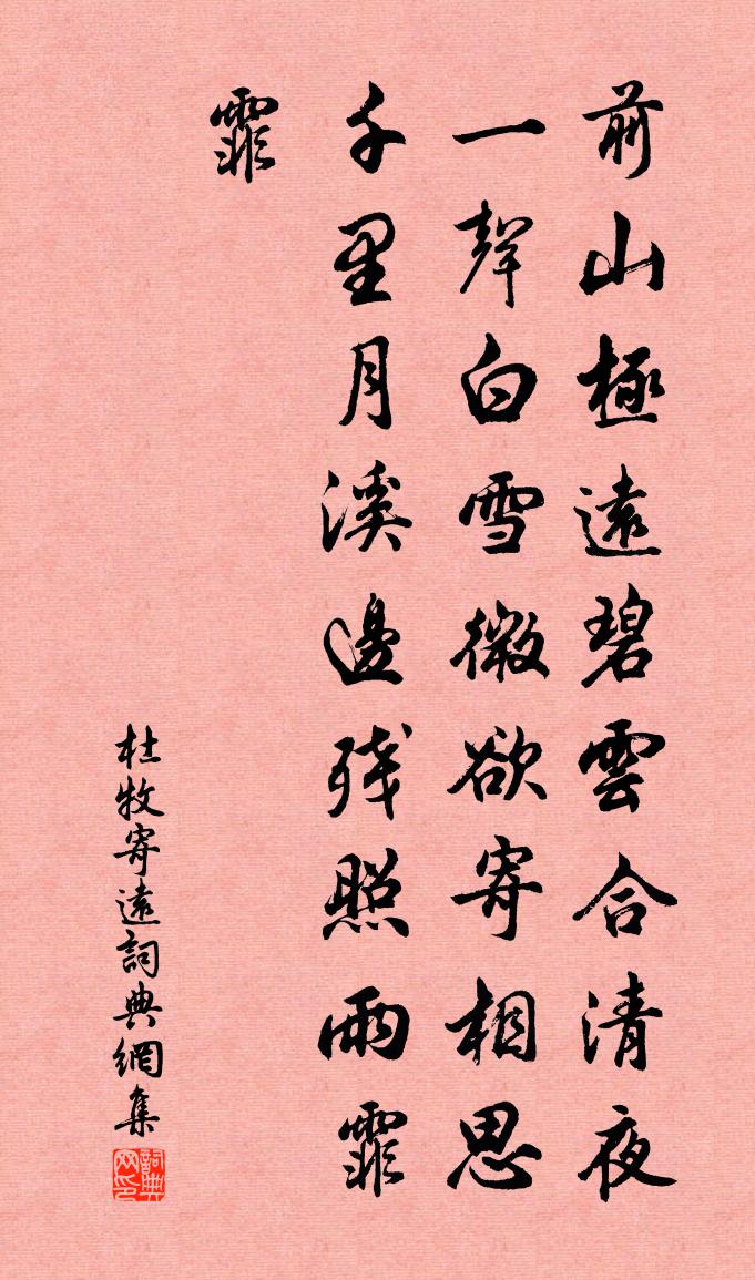 詩詞名句歷史字典書法欣賞書法字典國語詞典說文解字康熙字典古漢語字典標 題 作 者 詩 句 寄遠作者:杜牧 朝代:唐代寄遠原文前山極遠碧雲合,清夜一聲《白雪》微。欲寄相思千里月,溪邊殘照雨霏霏。詩詞問答問:寄遠的作者是誰?答:杜牧問:寄遠寫於哪個朝代?答:唐代問:杜牧的名句有哪些?答:杜牧名句大全杜牧寄遠書法欣賞寄遠書法作品詩詞推薦次韻陳元述見寄謝茶葛立方〔宋代〕青樓宜嬰石穴神,姜鹽藙橘豈容親。湯鳴鼎甗颼颼響,末下刀圭瑟瑟塵。火裹槍旗俱發妙,胸中梨棗不妨春。柳州塵外葉茵〔宋代〕自有此山扃,疑與浮世隔。清風襲我裳,竹下有來客。清曉洪澤放閘四絕句楊萬里〔宋代〕沿河過閘夢中聞,奇觀何曾似此晨。雪濺雷奔乍明眼,天跳地趠也驚人。黃渚舟中仇遠〔宋代〕夕晴殊可喜,小作川原游。水岸菰蔣合,野田鴻雁留。雲煙易得晚,城市那知秋。落葉塞破屋,逃亡令我愁。西湖雜感(六首)錢謙益〔清代〕其一板蕩淒涼忍再聞?煙巒如赭水如焚。白沙堤下唐時草,鄂國墳邊宋代雲。樹上黃鸝今作友,枝頭杜宇昔為君。菩薩蠻 寄都下友人許有壬〔元代〕憑高日望金台路。黃沙盡處空煙樹。歲晚足蕭疏。雁聲無夜無。簿書臨俗態。人道儒酸在。何以慰相思。半年無好送璲上人釋智朋〔宋代〕來從衡岳畫圖間,雙眼無非向上看。放一頭低相見去,方知玉幾最高寒。壽建寧太守劉克莊〔宋代〕官府昇平戟衛嚴,退衙惟與客清談。寬和卻笑閩溪急,苦硬翻嫌建茗甘。南國只今歌召伯,漢庭早晚相曹參。情知題玉澗八景八首王柏〔宋代〕山外江村晚,縱橫 * 家。過橋無路處,人思渺天涯。句釋淨照〔宋代〕盤饌春多筍,廚薪涇帶苔。池州春送前進士蒯希逸杜牧〔唐代〕芳草復芳草,斷腸還斷腸。自然堪下淚,何必更殘陽。楚岸千萬里,燕鴻三兩行。有家歸不得,況舉別君觴。閒園書事招暢當司空曙〔唐代〕聞蟬晝眠後,欹枕對蓬蒿。羸病懶尋戴,田園方詠陶。傍檐蟲掛靜,出樹蝶飛高。惆悵臨清鏡,思君見鬢毛。泊雷公步涉豫章境江流淼漫煙村夾岸景色橫出李呂〔宋代〕我昔閱畫圖,酷暑江天景。是行不作難,巨艦寄萍梗。柁樓一放目,合付詩管領。煙雨山出沒,浦漵林逾靜。水行次韻酬李黃山衛宗武〔宋代〕吾儒何所事,讀書而挾策。君才郄林枝,靈根芳正發。筆下富詞藻,雲錦自天落。英英光岳氣,灑灑冰雪魄。中秋桑扈佚名〔先秦〕交交桑扈,有鶯其羽。君子樂胥,受天之祜。交交桑扈,有鶯其領。君子樂胥,萬邦之屏。之屏之翰,百闢為憲。姑孰十詠。慈姥竹李白〔唐代〕野竹攢石生,含煙映江島。翠色落波深,虛聲帶寒早。龍吟曾未聽,鳳曲吹應好。不學蒲柳凋,貞心嘗自保。憶天彭牡丹之盛有感陸游〔宋代〕常記彭州送牡丹,祥雲徑尺照金盤。豈知身老農桑野,一朵妖紅夢裡看。勸農二首奉呈同官諸丈陳淳祖〔宋代〕勸農事雲畢,晴日足登山。山高翠微上,坐見人境閒。天目有修眉,洞庭無狂瀾。田疇井畫見,布穀行相關。村村李迅甫送蟹高似孫〔宋代〕平生嗜此龜蒙蟹,便無錢也多多買。瞥見風姿已瀟瀟,一呷橙虀酒如澥。和運司園亭小亭孫甫〔宋代〕蕭森玉谿南,小亭屹相向。使華雙軺車,禪境二方丈。固將物理齊,室隘志自廣。松竹周四檐,足以備幽賞。名句推薦寒山轉蒼翠,秋水日潺湲。王維《輞川閒居贈裴秀才迪》 不怕三十而死,只怕死後無名。佚名《增廣賢文·下集》 一時輕信人言語.自有明人話不平。馮夢龍《警世通言·卷四》 自勝之謂強。韓非及後人《韓非子·喻老》 遙望洞庭山水色,白銀盤裡一青螺劉禹錫《望洞庭》 把酒看花想諸弟,杜陵寒食草青青。韋應物《寒食寄京師諸弟》 奢者富而不足,何如儉者貧而有餘。洪應明《菜根譚·概論》 渡江天馬南來,幾人真是經綸手。辛棄疾《水龍吟·甲辰歲壽韓南澗尚書》 旅館寒燈獨不眠,客心何事轉悽然。高適《除夜作》 青青園中葵,朝露待日晞。佚名《長歌行》