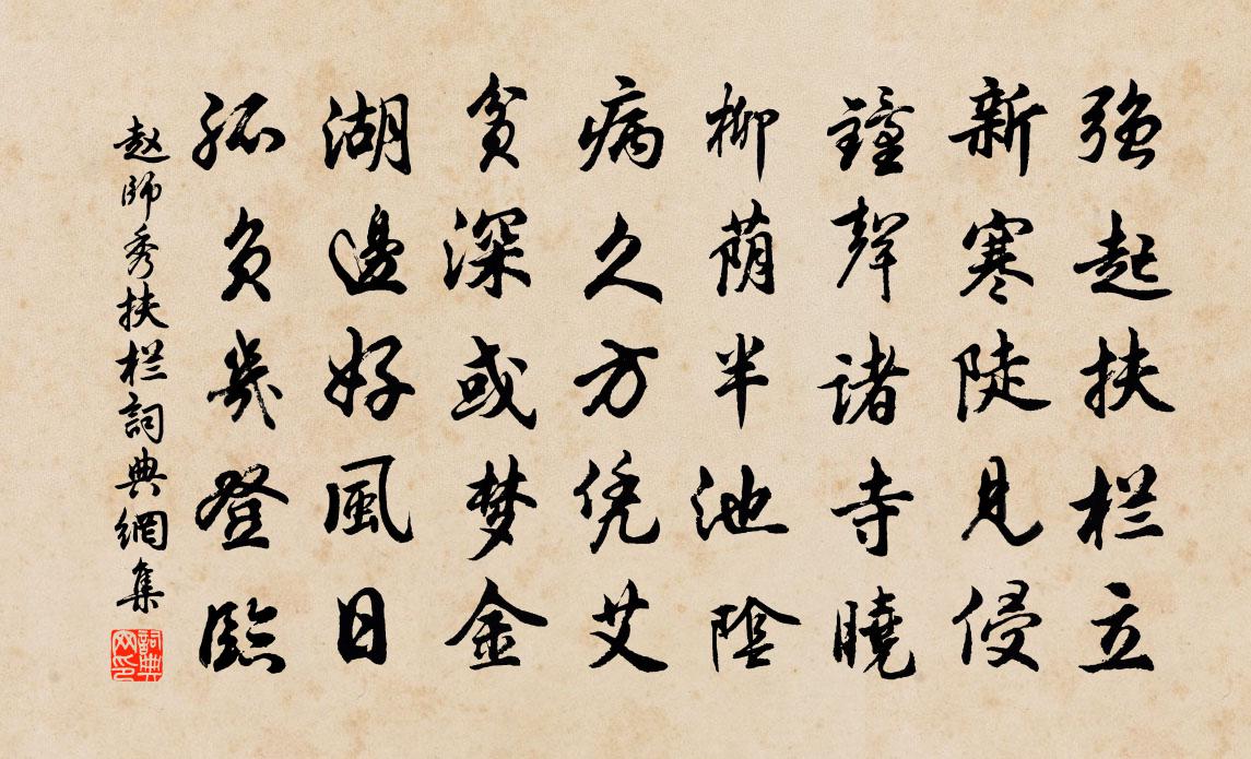 詩詞名句歷史字典書法欣賞書法字典國語詞典說文解字康熙字典古漢語字典標 題 作 者 詩 句 扶欄作者:趙師秀 朝代:宋代扶欄原文強起扶欄立,新寒陡見侵。鐘聲諸寺曉,柳蔭半池陰。病久方憑艾,貧深或夢金。湖邊好風日,孤負幾登臨。詩詞問答問:扶欄的作者是誰?答:趙師秀問:扶欄寫於哪個朝代?答:宋代趙師秀扶欄書法欣賞扶欄書法作品詩詞推薦遣興黃超然〔宋代〕曬麥有餘粒,雙鳩下庭際。知我無我心,相忘兩兩礙。風暝物意樂,雲薄花影晦。試知春色深,精覺靜可愛。紛紛系裙腰魏夫人〔宋代〕燈花耿耿漏遲遲。人別後、夜涼時。西風瀟灑夢初回。誰念我,就單枕,皺雙眉。錦屏繡幌與秋期。腸欲斷、淚偷奉使設宴戲擲籠籌朱灣〔唐代〕今日陪樽俎,良籌復在茲。獻酬君有禮,賞罰我無私。莫怪斜相向,還將正自持。一朝權入手,看取令行時。張大同寫予真請自贊黃庭堅〔宋代〕秀眉廣宇,不如魯山。槁項黃馘,不如漆園。韜光匿名,將在雙井。談玄說妙,熱謾兩川。枯木突兀,死灰不然。箜篌謠二首寄季長少卿陸游〔宋代〕庭樹非不榮,霜霣萬葉枯。朋友豈我棄,漸遠勢自疏。中夜起太息,發篋覓舊書,塵昏蠹蝕損,行缺字欲無。一讀韓非子引先聖諺先秦無名〔先秦〕不躓于山。而躓於垤。規有摩而水有波。我欲更之。無奈之何。謝都官監建安郡宋祁〔宋代〕郎署新疇出宰功,海閩關夾使旌雄。晨塗倦伏雙毫奏。暮席貪隨五兩風。芳荈摘山唐貢遠,薧魚升豆漢祠豐。賭囊題汪季路家藏吳彩鸞唐韻後樓鑰〔宋代〕舊說仙人吳彩鸞,日書切韻歸毫端。不應神速有如此,令人至今疑稗官。相傳此事三百載,誰知真跡儼然在。筆精至啟伏以搖落九秋正憐殘菊淒清四韻忽及弊廬李至〔宋代〕曉趨蓬閣暮還家,坐覽圖書見海涯。釣有舊谿猶懶說,詩無新律豈堪夸。涼風吹葉沿階厚,積雨生苔逐徑斜。知宴減字木蘭花(甲午九日午山作)劉辰翁〔宋代〕舊遊山路。落在秋陰最深處。風雨重陽。無蝶無花更斷腸。天知老矣。莫累門生與兒子。不用登高。高處風吹帽不官滿將歸與同幕別平山堂方岳〔宋代〕鷗未寒盟儻可尋,歸與雅不負登臨。江南山作故人面,雲北雁知遊子心。淮海三年雙鬢短,乾坤萬里一杯深。秋風渡錢塘二首釋寶曇〔宋代〕潮生西浦未全平,頃刻潮回岸有聲。落日人從官渡去,西風誰識此時情。不如吳越中流盡,贏得江山老眼明。試問道衡書寄求詩戴表元〔宋代〕烈士蹈東海,公仍歸白雲。龍藏誰顧蛻,鶴去不隨群。道貌青難寫,香風遠自聞。人間塵垢子,羞讀徑山文。酬楊侍郎憑見寄劉禹錫〔唐代〕翔鸞闕底謝皇恩,纓上滄浪舊水痕。疏傅揮金忽相憶,遠擎長句與招魂。賀鄭漕三首黃公度〔宋代〕東京望重兩儒先,經術傳農敗百看。派別九仙綿慶胄,運逢千載毓真賢。鼎槐未孥登三事,社桃何知托十天。壽考泛湖十絕句陳造〔宋代〕嫩綠搖漪紅藕香,雨膏煙膩午供涼。西湖到眼真西子,莫信溫柔別有鄉。寄文叔且問畏知近訊五首趙蕃〔宋代〕醉里揮毫君不嗔,平生嗜酒見天真。離觴曾為黃花滿,別日行看梅又新。遇越州賀仲宣施肩吾〔唐代〕君在鏡湖西畔住,四明山下莫經春。門前幾個採蓮女,欲泊蓮舟無主人。約劉良叔觀苔梅方岳〔宋代〕雪侵橫驛苔枝古,莫作江南一樣看。醞藉春情可遜老,稜層詩骨孟郊寒。也知餘子十分俗,雅有書生半點酸。政恐沁園春 示眾丘處機〔元代〕世事紛紛,似水東傾,甚時了期。嘆利名千古,爭馳虎豹,丘原一旦,總伴狐狸。枳棘叢中,桑榆影里,亂冢堆堆名句推薦掩妾淚,聽君歌。李白《夜坐吟》 雨中百草秋爛死,階下決明顏色鮮。杜甫《秋雨嘆三首》 孤煙村際起,歸雁天邊去。孟浩然《南歸阻雪》 月華如練,長是人千里。范仲淹《御街行·秋日懷舊》 向來吟秀句,不覺已鳴鴉。韓翃《酬程延秋夜即事見贈》 當年得意如芳草。日日春風好。辛棄疾《虞美人·賦虞美人草》 掩柴扉,謝他梅竹伴我冷書齋。沈自晉《玉芙蓉·雨窗小詠》 未晚先投宿,雞鳴早看天。佚名《增廣賢文·上集》 風雨送春歸,飛雪迎春到。 * 《卜運算元·詠梅》 形相雖惡而心術善,無害為君子也。荀子《荀子·非相》