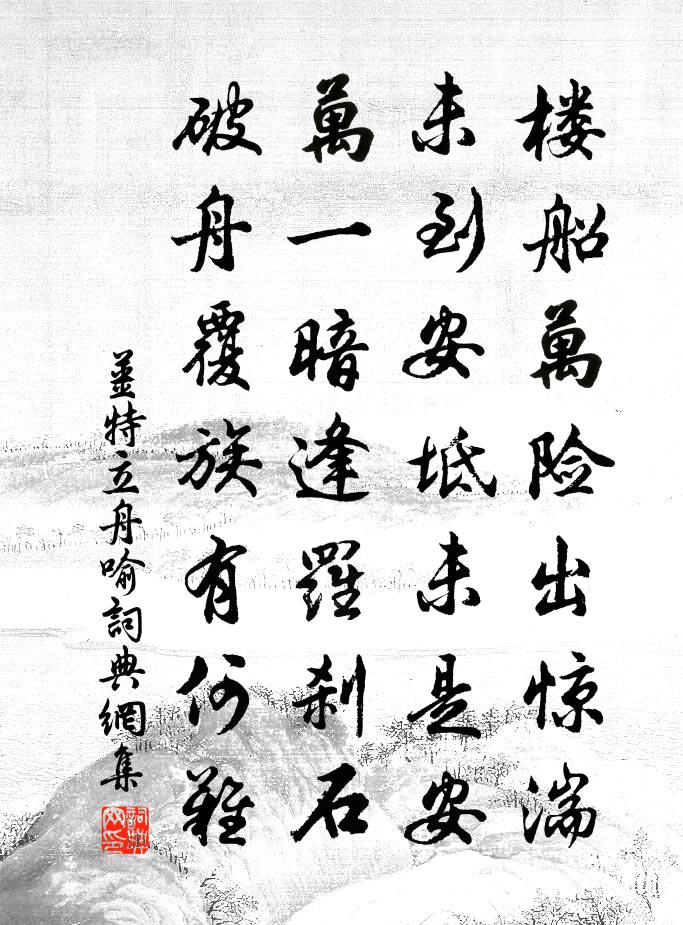 詩詞名句歷史字典書法欣賞書法字典國語詞典說文解字康熙字典古漢語字典標 題 作 者 詩 句 舟喻作者:姜特立 朝代:宋代舟喻原文樓船萬險出驚湍,未到安坻未是安。萬一暗逢羅剎石,破舟覆族有何難。詩詞問答問:舟喻的作者是誰?答:姜特立問:舟喻寫於哪個朝代?答:宋代姜特立舟喻書法欣賞舟喻書法作品詩詞推薦闖山亭李處權〔宋代〕亭皋樹林五月寒,坐揖秀爽披孱顏。使君清雅頗好事。妙墨風流名闖山。雲歸雨罷作佳色,山在杳靄空濛間。煙中送朝士使虜楊萬里〔宋代〕又見皇舉賦北征,謪仙俊氣似秋鷹。詩成紫寒三更月,馬渡黃河十丈冰。趙北燕南有人否,禽胡歸漢竟誰曾。天家韓東山遠訪於西岑寄釋文珦〔宋代〕東東魏國之雲仍,一清不減玉壺冰。生平閉戶養真素,隱節久為人所稱。遠來訪我青蓮嶂,道骨仙風極閒曠。正是郭隗徐鈞〔宋代〕國主張羅網異材,一言隗始自為媒。他年能下齊城者,知自千金市骨來。送羅道甫歸廬陵應舉姚勉〔宋代〕西風滿路桂枝香,催整登雲步月裝。群輩總皆推德行,三年稔已聽文章。琅琅議論須披腹,瑣瑣功名只探囊。捷了送樞密樓相公歸田陳邦固〔宋代〕宦歷年多鬢未霜,乞閒幾度上封章。共看解組朝辭館,爭賀懸魚晚在鄉。家篋已添新劃藁,錦袍猶帶舊薰香。溪南贈友人賈島〔唐代〕五字詩成卷,清新韻具偕。不同狂客醉,自伴律僧齋。春別和花樹,秋辭帶月淮。卻歸登第日,名近榜頭排。臘雪葛天民〔宋代〕片片嘉平瑞,無聲有耿光。來雖成頃刻,釀亦費商量。天闊花無賴,風休絮不狂。孤山林處士,魂在隴頭香。芙蓉道間二首趙蕃〔宋代〕芙蓉山下芙蓉渡,歷盡崔嵬何物路。更觀溪水突人來,令我詩情雜欣懼。輿夫重說松原山,如此積雨應生湍。從來追和晦庵先生十梅韻艾性夫〔宋代〕微吟水部詩,欲續廣平賦。須是鐵心人,方識花妙處。符亭二首薛能〔唐代〕符亭之地雅離群,萬古懸泉一旦新。若念農桑也如此,縣人應得似行人。山如巫峽煙雲好,路似嘉祥水木清。大抵布袋和尚贊恭依聖上韻釋慧遠〔宋代〕布袋挨開,猿啼曉月。海岳逃形,佛魔路絕。列列挈挈,翹翹傑傑。大機兮棒打不回閒,大用兮利劍流鮮血。別別別齊太守於鵠〔唐代〕花里南樓春夜寒,還如王屋上天壇。歸山不道無明月,誰共相從到曉看。過九疑馬大同〔宋代〕平生夢想九疑高,原隰驅馳敢憚勞。肅肅衣冠朝帝所,此行端不為游遨。老僧釋景雲〔宋代〕日照西山雪,老僧門始開。凍瓶黏柱礎,宿火陷爐灰。童子病歸去,鹿麋寒入來。齋鍾知漸近,枝鳥下生台。陳頵徐鈞〔宋代〕中華傾弊無他故,習尚淡談出望門。奏議救時翻見黜,搜揚隱逸更誰論。山櫻王安石〔宋代〕山櫻抱石蔭松枝,比並余花發最遲。賴有春風嫌寂寞,吹香渡水報人知。玉照東西兩軒有紅梅及千葉緗梅未經題詠倒用張鎡〔宋代〕雖嫌綠葉與青枝,入格依前自欠詩。幾向斜陽溪畔見,猶將桃杏誤猜疑。宿慈恩寺郁公房賈島〔唐代〕病身來寄宿,自掃一床閒。反照臨江磬,新秋過雨山。竹陰移冷月,荷氣帶禪關。獨住天台意,方從內請還。閿鄉寓居十首木塔偶題吳融〔唐代〕西南古剎近芳林,偶得高秋試一吟。無限黃花襯黃葉,可須春月始傷心。名句推薦知音少,弦斷有誰聽。岳飛《小重山·昨夜寒蛩不住鳴》 龍吟虎嘯一時發,萬籟百泉相與秋李頎《聽安萬善吹觱篥歌》 千金縱買相如賦,脈脈此情誰訴。辛棄疾《摸魚兒·更能消幾番風雨》 不忍登高臨遠,望故鄉渺邈,歸思難收。柳永《八聲甘州·對瀟瀟暮雨灑江天》 離愁萬種,醉鄉一夜頭白。施耐庵《念奴嬌·天南地北》 夫民勞則思,思則善心生;逸則淫,淫則忘善,忘善之噁心生。左丘明《國語·魯語·公父文伯之母論勞逸》 大鵬一日同風起,扶搖直上九萬里。李白《上李邕》 范增一去無謀主,韓信原來是逐臣。嚴遂成《烏江項王廟》 明月皎皎照我床,星漢西流夜未央。曹丕《燕歌行二首·其一》 漉我新熟酒,只雞招近局。陶淵明《歸園田居·其五》