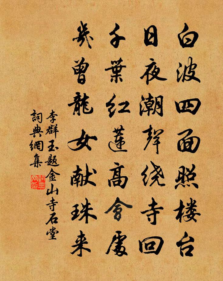 詩詞名句歷史字典書法欣賞書法字典國語詞典說文解字康熙字典古漢語字典標 題 作 者 詩 句 題金山寺石堂作者:李群玉 朝代:唐代題金山寺石堂原文白波四面照樓台,日夜潮聲繞寺回。千葉紅蓮高會處,幾曾龍女獻珠來。詩詞問答問:題金山寺石堂的作者是誰?答:李群玉問:題金山寺石堂寫於哪個朝代?答:唐代李群玉題金山寺石堂書法欣賞題金山寺石堂書法作品注釋全唐詩:卷570-58詩詞推薦點絳唇張元乾〔宋代〕畫閣深圍,暖紅光里芳林影。暗香成陣。上下花相映。倒掛疏枝,月落參橫冷。休裝景。要人酒醒。除是花枝並。宣州雜詩二十首梅堯臣〔宋代〕諸葛久精妙,已能聞國都。紫毫搜老兔,蒼鼠拔長須。露筦何明淨,煙丸事染濡。班超投此去,死作玉關夫。齊雲庵文洪源〔宋代〕齊雲山特立,古剎懸危壁。翠竹舞柔風,高峰聳紅日。龍井冽生寒,冰房清澈骨。半空神氣怡,恍入群仙窟。仰盼宜城道間李曾伯〔宋代〕蕭蕭風雨問南關,客里單衣八月寒。燈火數家棲逆旅,江山千里走插官。飄零岐路憑詩紀,寂寞襟懷借酒寬。亟寫送青龍一公張謂〔唐代〕事佛輕金印,勤王度玉關。不知從樹下,還肯到人間。楚水青蓮淨,吳門白日閒。聖朝須助理,絕莫愛東山。田家建除體洪咨夔〔宋代〕建鼓勸竭作,除田綠紛披。滿築沮澤岸,平流綺堘陂。定約欲水均,執熱願雨隨。破柱雷電合,危檐溜紳垂。成功連雪五日有無盡觀吳龍翰〔宋代〕平生酷愛雪,老我看不足。安得走五台,六月漱寒玉。無計巢雪山,與佛結幽獨。方輿多奇觀,出門欠車轂。天公禪人並化主寫真求贊釋正覺〔宋代〕淨智而昭昭,體空而寥寥。天心河淡月欲下,松頂雪寒春未消。三世遷流兮彈指可斷,萬年長久兮一念全超。恁麽次韻陸務觀慈姥岩酌別范成大〔宋代〕送我彌旬未忍回,可憐蕭索把離杯。不辭更宿中岩下,投老餘年豈再來!雲際寺前山頂卻望幡竿、鷓鴣諸山二首楊萬里〔宋代〕幡竿嶺帶鷓鴣山,雪後霜前紫翠間。自掇胡床移好處,莫教漏眼一煙鬟。夏日吳園鄭會〔宋代〕斫藕敲瓜酒面涼,片雲如墨不成章。東風忽遣雨西去,相對兩烏行夕陽。月夜過靈徹上人房因贈權德輿〔唐代〕此身會逐白雲去,未洗塵纓還自傷。今夜幸逢清淨境,滿庭秋月對支郎。言懷張蠙〔唐代〕不將高蓋竟煙塵,自向蓬茅認此身。唐祖本來成大業,豈非姚宋是平人。摸魚兒(今歲海棠遲開半月,然一夕如雪,無飲余者,賦此寄恨。)劉辰翁〔宋代〕是他家、絳唇翠袖,可容卿有功否。相思不到胭脂井,只隔東林煙柳。春去又。漫一夜東風,吹得花成舊。無人舉安定山張恪〔宋代〕常懷玉壘李謫仙,精神浩瀚游八表。頂摩蒼天弄白日,方丈蓬萊思清矯。吾鄉夙號山水邦,縈青繚白雜蒼縹。人間湖上寓居雜詠 其十三姜夔〔宋代〕格下軒窗枕水開,畫船忽載故人來。與君同過西城路,卻指煙婆獨自回。奉和魯望四明山九題鞠侯皮日休〔唐代〕堪羨鞠侯國,碧岩千萬重。煙蘿為印綬,雲壑是堤封。泉遣狙公護,果教犭軍子供。爾徒如不死,應得躡玄蹤。夜別韋司士高適〔唐代〕高館張燈酒復清,夜鍾殘月雁歸聲。只言啼鳥堪求侶,無那春風欲送行。黃河曲里沙為岸,白馬津邊柳向城。莫怨春波堂小飲懷棠湖舊隱三首岳珂〔宋代〕平生到處西湖長,眼底波光日日新。圖在輞川非舊隱,夢回笠澤是前身。一江細雨欹青菊,萬里雄風起白苹。獨立雜曲歌辭宮中調笑韋應物〔唐代〕胡馬,胡馬,遠放燕支山下。咆沙咆雪獨嘶,東望西望路迷。迷路,迷路,邊草無窮日暮。河漢,河漢,曉掛秋城名句推薦博觀而約取,厚積而薄發蘇軾《稼說送張琥》 愁因薄暮起,興是清秋發。孟浩然《秋登蘭山寄張五》 永夜角聲悲自語,客心愁破正思家。汪元量《望江南·幽州九日》 不義不昵,厚將崩。左丘明《左傳·隱公·隱公元年》 天地不仁,以萬物為芻狗;聖人不仁,以百姓為芻狗。老子《老子·道經·第五章》 舊曲梅花唱,新正柏酒傳。孟浩然《歲除夜會樂城張少府宅》 如知其非義,斯速已矣,何待來年。孟子《孟子·滕文公章句下·第八節》 貴富而不知道,適足以為患,不如貧賤。呂不韋《呂氏春秋·紀·孟春紀》 別有根芽,不是人間富貴花。納蘭性德《採桑子·塞上詠雪花》 天公見玉女,大笑億千場。李白《短歌行》