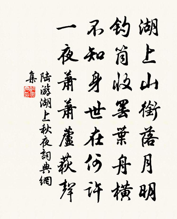 詩詞名句歷史字典書法欣賞書法字典國語詞典說文解字康熙字典古漢語字典標 題 作 者 詩 句 湖上秋夜作者:陸游 朝代:宋代湖上秋夜原文湖上山銜落月明,釣筒收罷葉舟橫。不知身世在何許,一夜蕭蕭蘆荻聲。詩詞問答問:湖上秋夜的作者是誰?答:陸游問:湖上秋夜寫於哪個朝代?答:宋代問:陸游的名句有哪些?答:陸游名句大全陸游湖上秋夜書法欣賞湖上秋夜書法作品詩詞推薦廢烽台韓維〔宋代〕耆老不可問,高台荊棘間。一時戎馬散,千古暮鴉還。事往孤鴻斷,人來落照閒。興亡無限恨,慘澹對河關。靈都觀李道士張籍〔唐代〕仙觀雨來靜,繞房瓊草春。素書天上字,花洞古時人。泥灶煮靈液,掃壇朝玉真。幾回遊閬苑,青節亦隨身。大腹兒楊維楨〔元代〕大腹兒,腹空侗。胡旋舞,疾如風。君王醉眼大朦朧,乃謂赤心貯中其中。君王寵之恩日厚,宮中洗兒中冓醜。大頌古四十五首釋如珙〔宋代〕我瞿曇佛,具正遍知。子母分解,只在當時。次韻斯遠同過智門茂草之中獨剪春羅花炯然趙蕃〔宋代〕山客城市役,故人雞黍情。懷我舊隱地,偕為蕭寺行。草茂既已合,花孤遂能明。看渠色彌正,寧使城為傾。君詩青玉案(和何使君次了翁韻詞三首)張榘〔宋代〕嚴城寂寞山繚繞。覺寒透、貂裘峭。雲壓江天風破曉。飛瓊萬頃,看來渾似,澤國蘆花老。玉山不怕頻頻倒。要筆英德邵守之綱記予衰顏戲題數語周必大〔宋代〕使君燕頷虎頭,法噹噹城封侯。宜伯蜀而之廣,繪象祠於兩州。鈴閣雖非麟閣,胡為畫此獼猴。亦如杭人效穆仲獻緣識宋太宗〔宋代〕深秋雲物冷,經雨斗添寒。盡日緣情坐,霜葉易燋右乾。偈頌一百零二首釋紹曇〔宋代〕觸翻茶瓢,眉毛掛劍。殺活不分,邪正難辨。古今同轍不同途,妙悟玄機轆轆轉。春日有感示魏定父王之道〔宋代〕聚散時來不自由,相逢相別欲何尤。韋皋況有三年約,陶谷端非一日謀。殘角為誰驚曉夢,遠山多事惹春愁。故園山陽即席獻裴中丞趙嘏〔唐代〕早年天上見清塵,今日樓中醉一春。暫肯剖符臨水石,幾曾焚筆動星辰。瓊台雪映迢迢鶴,蓬島波橫浩浩津。好是送雙峰聖僧遺像還山李呂〔宋代〕枯林形模酷肖之,只應鐸落自秦時。定光爐韛收親子,圓寬門風出自枝。韜晦無因觀大用,感通猶得見全提。要知恭次家大人初抵海陵官舍元韻孫應時〔宋代〕灌園保必學於陵,吾事胸中有淮程。三鬴宦遊苦寂寞,百年心跡定分明。逍遙朱墨塵埃外,娛樂戲文章金石聲。侍寄東禪宗周講主釋雲岫〔宋代〕四海六民皆走利,東禪講主只潭禪。何年去住靈山寺,招我岩間看白狷。游寶應寺李廌〔宋代〕雨後秋風入翠微,我來仍值晚涼時。山遮日腳斜陽早,雲礙鐘聲出谷遲。故國空餘煙冉冉,舊宮何在黍離離。興亡次韻賀子忱春事王之望〔宋代〕老境流年速,春風幾日晴。清尊花下怯,白髮鏡中明。蝴蝶迷幽夢,倉庚愧好聲。良辰一尊酒,鐘鼎可忘情。遣遇杜甫〔唐代〕磬折辭主人,開帆駕洪濤。春水滿南國,朱崖雲日高。舟子廢寢食,飄風爭所操。我行匪利涉,謝爾從者勞。石間蚊蟆白居易〔唐代〕巴徼炎毒早,三月蚊蟆生。咂膚拂不去,繞耳薨薨聲。斯物頗微細,中人初甚輕。如有膚受譖,久則瘡痏成。痏成有感黃庚〔宋代〕自嘆文章不遇時,平生壯志與心違。十年湖海無家住,千里鄉關有夢歸。殘夜月寒燈暈淡,高秋天闊雁聲微。傷今菩薩蠻蘇庠〔宋代〕年時憶著花前醉。而今花落人憔悴。麥浪卷晴川。杜鵑聲可憐。有書無雁寄。初夏槐風細。家在落霞邊。愁逢江月名句推薦晴雲滿戶團傾蓋,秋水浮階溜決渠。杜甫《柏學士茅屋》 不患寡而患不均,不患貧而患不安。蓋均無貧,和無寡,安無傾。孔子弟子《論語·季氏篇》 政者正也。君為正,則百姓從政矣。戴聖《禮記·哀公問》 知者不惑,仁者不憂,勇者不懼。孔子弟子《論語·子罕篇》 世有伯樂,然後有千里馬。千里馬常有,而伯樂不常有。韓愈《雜說四·馬說》 雲無心以出岫,鳥倦飛而知還。陶淵明《歸去來兮辭·並序》 桃根桃葉終相守,伴殷勤、雙宿鴛鴦。納蘭性德《一叢花·詠並蒂蓮》 天憐客子鄉關遠。借與花消遣。蔣捷《虞美人·梳樓》 而今識盡愁滋味,欲說還休。辛棄疾《醜奴兒·書博山道中壁》 君看六幅南朝事,老木寒雲滿故城。韋莊《金陵圖》