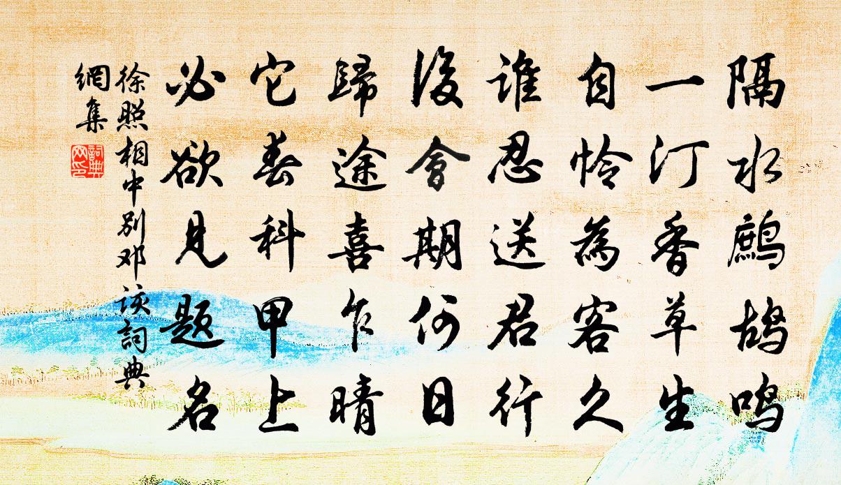 詩詞名句歷史字典書法欣賞書法字典國語詞典說文解字康熙字典古漢語字典標 題 作 者 詩 句 相中別鄧該作者:徐照 朝代:宋代相中別鄧該原文隔水鷓鴣鳴,一汀香草生。自憐為客久,誰忍送君行。後會期何日,歸途喜乍晴。它春科甲上,必欲見題名。詩詞問答問:相中別鄧該的作者是誰?答:徐照問:相中別鄧該寫於哪個朝代?答:宋代徐照相中別鄧該書法欣賞相中別鄧該書法作品詩詞推薦柏仙詩王義山〔宋代〕古柏林間小劍仙,雲鬟低綰嚲輕蟬。願持天上長生錄,來祝東朝億萬年。雜詩崔國輔〔唐代〕逢著平樂兒,論交鞍馬前。與酤一斗酒,恰用十千錢。後余在關內,作事多迍邅。何肯相救援,徒聞寶劍篇。張元覽追和東坡詠梅要予同賦李處權〔宋代〕江空月掛疏梅村,生香湔祓何郎魂。亭亭自是塵表物,玉質敢有煙埃昏。西州風土似南國,高樹繚台丞相園。居然詠酒翁綬〔唐代〕逃暑迎春復送秋,無非綠蟻滿杯浮。百年莫惜千回醉,一盞能消萬古愁。幾為芳菲眠細草,曾因雨雪上高樓。平生贈過門道人陸游〔宋代〕賣藥人間兩屨輕,飄然雲水不論程。曉經浦口亂流渡,夜宿山家乘月行。與周長官李秀才游徑山二君先以詩見寄次其韻蘇軾〔宋代〕少年飲紅裙,酒盡推不去。呼來徑山下,試與洗塵霧。瘦馬惜障泥,臨流不肯渡。獨有汝南君,從我無朝暮。肯將送劉尊師祗詔闕庭三首曹唐〔唐代〕海風葉葉駕霓旌,天路悠悠接上清。錦誥淒涼遺去恨,玉簫哀絕醉離情。五湖夜月幡幢濕,雙闕清風劍珮輕。從此漁塘十六韻(在朱陽縣石岩下)韋莊〔唐代〕洛水分餘脈,穿岩出石棱。碧經嵐氣重,清帶露華澄。瑩澈通三島,岩梧積萬層。巢由應共到,劉阮想同登。壁峻燈夕寄獻內翰虢略公楊億〔宋代〕瓊樓十二玉梯斜,乾鵲南飛轉斗車。有客郢中歌白雪,幾人天上醉流霞。金吾緹騎章台陌, * 繁弦太帝家。秦痔拜賜宮花紀恩詩許應龍〔宋代〕濟濟蹌蹌藹縉紳,祝堯均效華封人。觴稱鳳闕懽聲沸,花錫鸞枝內樣新。露葉巧裁隋苑彩,天葩先借漢宮春。舉頭點絳唇吳文英〔宋代〕推枕南窗,楝花寒入單紗淺。雨簾不捲。空礙調雛燕。一握柔蔥,香染榴巾汗。音塵斷。畫羅閒扇。山色天涯遠。郊廟歌辭。享節愍太子廟樂章。送文舞出迎武舞入佚名〔唐代〕邕邕闡化憑文德,赫赫宣威藉武功。既執羽旄先拂吹,還持玉鏚更揮空。鷓鴣天 贈珠廉秀 青樓集馮子振〔元代〕恁倚東風遠映樓。流鶯窺面燕低頭。暇須瘦影纖纖織,龜背香紋細細浮。紅霧斂,彩雲收。海霞為帶月為鉤。夜來趙德麟中秋生日李廌〔宋代〕中秋月,風露淒清光倍潔。皓氣澄霄萬象沉,孤光散彩繁星滅。中秋潮,江海鯨波此日高。倒卷東溟蕩平陸,逆撼即事曾幾〔宋代〕野寺山家兩寂然,小窗下有白頭禪。微風不動爐煙直,永日方中樹影圓。隱几讀書長竟夕,閉門覓句可忘年。幸無西齋遣興陸游〔宋代〕桐葉秋先霣,菊花寒更香。酒邊聊兀兀,身外本茫茫。小憩元非睡,長吟偶似狂。忽然思把卷,一笑就窗光。冬日早作裘萬頃〔宋代〕黃昏月姊翦雲開,夜半雷車載雨來。晨起鉤簾望霄漢,風花吹墮萬璚瑰。採蓮曲俞桂〔宋代〕平湖淼淼蓮風清,花開映日紅妝明。一雙鸂鶒忽飛去,為驚花底蘭橈鳴。蘭橈蕩漾誰家女,雲妥髻鬟黛眉嫵。采采子規(一作賈島詩)項斯〔唐代〕遊魂自相叫,寧復記前身。飛過人家月,聲連客路春。夢邊催曉急,愁外送風頻。自有沾花血,相和淚滴新。臨江仙(初夏)趙長卿〔宋代〕簾幕清風灑灑,園林綠蔭垂垂。楝花開遍麥秋時。雨深芳草渡,蝴蝶正慵飛。憔悴三春心事,風流一弄金衣。韶光名句推薦謂女子,先生為姊,後生為妹。佚名《爾雅·釋親》 竹馬踉蹡沖淖去,紙鳶跋扈挾風鳴。陸游《觀村童戲溪上》 寄語天涯客,輕寒底用愁。于謙《除夜太原寒甚》 誰教歲歲紅蓮夜,兩處沉吟各自知。姜夔《鷓鴣天·元夕有所夢》 天網恢恢,疏而不失。老子《老子·德經·第七十三章》 鴻雁不堪愁里聽,雲山況是客中過。李頎《送魏萬之京》 以銅為鑑,可整衣冠;以古為鑑,可知興替。程登吉《幼學瓊林·卷三·器用》 下附上以成志,上恃下以成名。來俊臣《羅織經·治下卷第三》 藕花珠綴,猶似汗凝妝。閻選《臨江仙·雨停荷芰逗濃香》 把酒送春春不語。黃昏卻下瀟瀟雨。朱淑真《蝶戀花·送春》