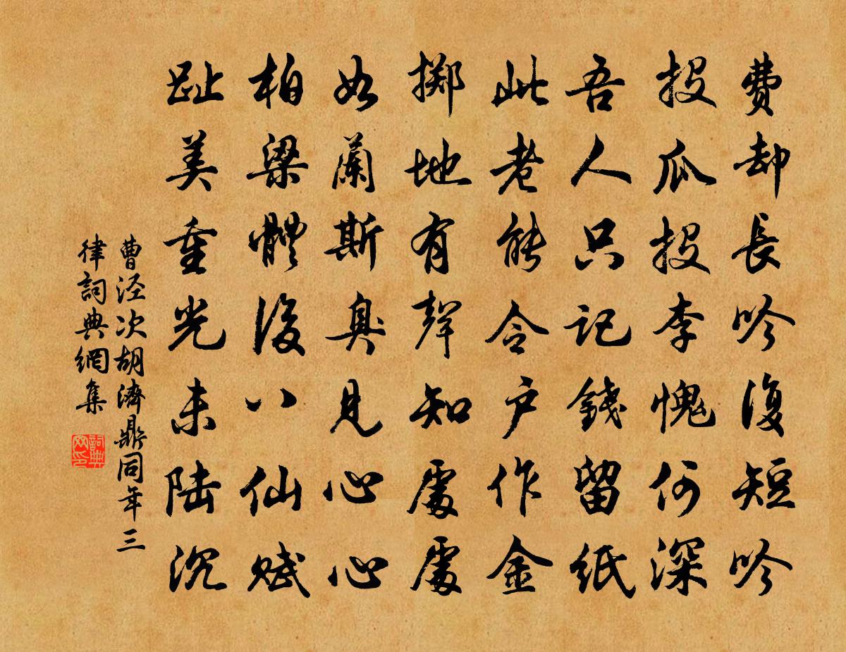 詩詞名句歷史字典書法欣賞書法字典國語詞典說文解字康熙字典古漢語字典標 題 作 者 詩 句 次胡濟鼎同年三律作者:曹涇 朝代:宋代次胡濟鼎同年三律原文費卻長吟復短吟,投瓜投李愧何深。吾人只記錢留紙,此老能令戶作金。擲地有聲知處處,如蘭斯臭見心心。柏梁體後八仙賦,趾美重光未陸沉。詩詞問答問:次胡濟鼎同年三律的作者是誰?答:曹涇問:次胡濟鼎同年三律寫於哪個朝代?答:宋代曹涇次胡濟鼎同年三律書法欣賞次胡濟鼎同年三律書法作品詩詞推薦送廣東潘帥移鎮湖南十口號曾豐〔宋代〕八碑新打掛舲齋,萬里春從碑上來。墨本不須多帶去,瀟湘有石可重開。北庭作岑參〔唐代〕雁塞通鹽澤,龍堆接醋溝。孤城天北畔,絕域海西頭。秋雪春仍下,朝風夜不休。可知年四十,猶自未封侯。借位明功釋正覺〔宋代〕六戶虛通路不迷,太陽影里不當機。縱橫妙展無私化,恰恰行從鳥道歸。倦書圖牟巘五〔宋代〕日長偏困校讎人,袖手旁觀亦欠伸。一覺黑甜酣午枕,絕憐識字苦勞神。又一絕請為申達京洛親交知余病廢韓偓〔唐代〕鬢惹新霜耳舊聾,眼昏腰曲四肢風。交親若要知形候,嵐嶂煙中折臂翁。採蓮曲張敬徽〔唐代〕游女泛江晴,蓮紅水復清。競多愁日暮,爭疾畏船傾。波動疑釵落,風生覺袖輕。相看未盡意,歸浦棹歌聲。十二月二十六日趙蕃〔宋代〕水有縈紆何自來,竹能森爽為誰栽。山僧乞飯朝一出,幽子題詩日幾廻。故鶴未妨頻有客,騎驢正爾獨尋梅。得閒和洪秀才八首胡寅〔宋代〕愛酒希元亮,敲門重子猷。孤松將秀嶺,萬竹已搖秋。懶去手搔發,興來書映眸。此生當皎皎,毋作夢中游。官舍歲暮感懷書事五首張耒〔宋代〕筆床茶灶素圍屏,瀟灑幽齋燈火明。木落風霜初十月,坐寒星斗欲三更。消磨永夜晝盈案,分付閒愁酒滿觥。乾世此君室方蒙仲〔宋代〕滔滔天地間,非我安知我。大兒王子猷,小兒文與可。罷府歸舊居(自此後重授賓客歸履道宅作)白居易〔唐代〕陋巷乘籃入,朱門掛印回。腰間拋組綬,纓上拂塵埃。屈曲閒池沼,無非手自開。青蒼好竹樹,亦是眼看栽。石片七月二十四日作陸游〔宋代〕閒拂青銅一惘然,此生應老海雲邊。涼颸入袂詩初就,幽鳥呼人夢不全。天上鵲歸星渚冷,月中桂長露華鮮。射胡武康郭外望許緯先生山居崔峒〔唐代〕湖上千峰帶落暉,白雲開處見柴扉。松門一徑仍生草,應是仙人向郭稀。第二百九十五卷碇齋李伯玉〔宋代〕先生產地起風波,皆竟中流定得么。放取斷頭船子去,醉眠煙雨一漁蓑。自贊釋淨全〔宋代〕匙挑不上個村夫,文墨胸中一點無。曾把虛空揣出骨,惡聲贏得滿江湖。無夢令 繼重陽韻馬鈺〔元代〕師父說開顛倒。別是一般運造。外事削來無,便得裡頭尋討。大道。大道。清淨身有丹灶。送來巡檢方回〔宋代〕鐵甲金戈百戰攻,將軍未老紫髯濃。早依討粵□□□,□受從驃合騎封。驚邏三年微竊鼠,飛騰一日定采□,□□答謝諮議謝靈運〔南北朝〕寡弱多幸。逢茲道泰。荷榮西荒。晏然解帶。翦削前識。任此天籟。人對遇矣。何懼何害。天津橋汪元量〔宋代〕白楊獵獵柳青青,怒浪高低不肯平。一自堯夫分手後,更無人聽杜鵑聲。次韻唐彥猷華亭十詠其七華亭谷王安石〔宋代〕巨川非一源,源亦在眾流。此谷乃清淺,松江能覆舟。蟲魚何所知,上下相沉浮。徒嗟大盈北,浩浩無春愁。名句推薦欲尋芳草去,惜與故人違。孟浩然《留別王侍御維 / 留別王維》 枕前何事最傷情?梧桐葉上,點點露珠零。尹鶚《臨江仙·深秋寒夜銀河靜》 山亭水榭秋方半。鳳幃寂寞無人伴。朱淑真《菩薩蠻·山亭水榭秋方半》 奢者富而不足,何如儉者貧而有餘。洪應明《菜根譚·概論》 到家應是,童稚牽衣,笑我華顛。吳激《訴衷情·夜寒茅店不成眠》 晚鴉飛去,一枝花影送黃昏夏完淳《婆羅門引·春盡夜》 今年海角天涯。蕭蕭兩鬢生華。李清照《清平樂·年年雪裡》 明主之道,必明於公私之分韓非及後人《韓非子·飾邪》 止戈為武。左丘明《左傳·宣公·宣公十二年》 魯酒不可醉,齊歌空復情。李白《沙丘城下寄杜甫》
