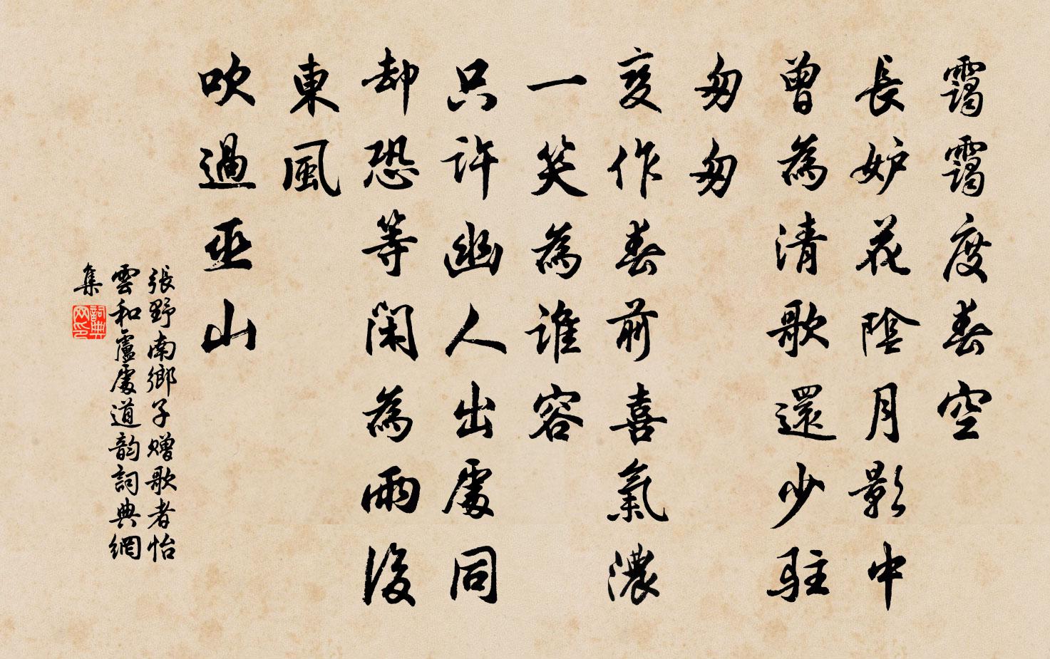詩詞名句歷史字典書法欣賞書法字典國語詞典說文解字康熙字典古漢語字典標 題 作 者 詩 句 南鄉子 贈歌者怡雲,和盧處道韻作者:張野 朝代:元代原文靄靄度春空。長妒花陰月影中。曾為清歌還少駐,匆匆。變作春前喜氣濃。一笑為誰容。只許幽人出處同。卻恐等閒為雨後,東風。吹過巫山詩詞問答問:《南鄉子 贈歌者怡雲,和盧處道韻》的作者是誰?答:張野問:該詩寫於哪個朝代?答:元代問:該詩是什麼體裁?答:詞書法欣賞南鄉子 贈歌者怡雲,和盧處道韻書法作品詩詞推薦挽陳本齋尚書牟巘五〔宋代〕在昔實齋老,公能繼盛名。平生守師說,晚歲萃儒榮。禋赦原兵禍,台綱忤物情。抽身甬東去,騰上幾公卿。人有畫花中四倫者偶記毗陵舊詩即題其上家鉉翁〔宋代〕佩玉垂紳廊廟人,幽花小草豈其倫。須知四海皆兄弟,淡泊論交處處親。踏莎行 金錢卜歡 復古詩集五以上周詠先輯本王國器〔元代〕暗擲龍文,尋盟鸞鏡。龜兒不似青蚨準。花房羞化彩娥飛,銀橋密遞仙娥信。錦屋瓊樓,薄情飄性。碧雲望斷紅輪草飲招表臣才臣彥文道夫李處權〔宋代〕愧匪屠門嚼,且無金屈卮。人生難得醉,我輩不須辭。山迥雲生谷,林空鳥並枝。前溪天欲雪,為報戴逵知。吳興辯長老以達磨畫像請贊釋正覺〔宋代〕長蘆駕浪,只履西歸。求 * 之法器,付屈眴之田衣。度九年之緘默,印二祖之靈知。海犀酣月而暈,寒烏帶雪而辛法司法宅觀妓盧照鄰〔唐代〕甫國佳人至,北堂羅薦開。長裙隨鳳管,促柱送駕杯。雲光身後落,雪態掌中回。到愁金谷晚,不怪玉山頹。魏王堤白居易〔唐代〕花寒懶發鳥慵啼,信馬閒行到日西。何處未春先有思,柳條無力魏王堤。戛金釵佚名〔宋代〕梅蕊破初寒,春來何太早。輕傅粉、向人先笑。比並年時較些少。愁底事,十分清瘦了。影靜野塘空,香寒霜月曉阮郎歸胡文卿〔宋代〕薰風吹盡不多雲。曉天如水清。喔松庭院忽聞笙。簾疏香篆明。蘭玉盛,鳳和鳴。家聲留漢庭。狨鞍長傍九重城。戲簡朱公武劉邦直田子平五首黃庭堅〔宋代〕朱家塤篪好兄弟,陋巷六經葵莧秋。我卜荊州三畝宅,讀田家書從之游。午窗曹邍〔宋代〕午窗破夢角巾斜,自滌銅鐺煮茗芽。滿院綠苔春色靜,冥冥細雨落桐花。梅花喜神譜大蕊八枝宋伯仁〔宋代〕高山流水音,泠泠生指下。無與俗 * ,伯牙恐嘲罵。荊南簽判向和卿用予六言見惠次韻奉酬四首黃庭堅〔宋代〕覓句真成小技,知音定須絕弦。景公有馬千駟,伯夷垂名萬年。寄太素韓維〔宋代〕雪竹風松絕點塵,邪陰消盡火成輪。時人不識先生意,喚作人間無事翁。以鑒贈趙制置袁燮〔宋代〕吁嗟此鑒,惟銅之精。磨之治之,瑩乎其明。其明維何,洞燭毫髮。非由外至,實自中發。我有良友,天支之英。正月六日早行松山道鄭清之〔宋代〕五更河鼓尚橫陳,小立晨光漸可人。日出野雞猶唱曉,雪晴山鳥競呼春。溪筠拂袖霜花落,石路支筇蘚跡新。慚愧西泠橋題畫李流芳〔明代〕多寶峰頭石欲摧,西泠橋邊樹不開。輕煙薄霧斜陽下,曾泛扁舟小築來。冬至孟春孟夏季秋四祀上公攝事七首佚名〔宋代〕禮經之重,祭典為宗。上公揶事,登降彌恭。庶品豐潔,令們肅雍。百神萃止,惟吉之從。奉題付珠二首劉克莊〔宋代〕初祖西來但指心,大光明藏在胸襟。世間盲漢渾忘卻,誤向驪龍頷下尋。宿湖邊山寺顧況〔唐代〕群峰過雨澗淙淙,松下扉扃白鶴雙。香透經窗籠檜柏,雲生梵宇濕幡幢。 * 僧定風過席,葦岸漁歌月墮江。誰悟名句推薦情共天涯秋黯,朱橋鎖深巷。吳文英《解蹀躞·醉雲又兼醒雨》 無人知此意,歌罷滿簾風。陳與義《臨江仙·高詠楚詞酬午日》 胭脂洗出秋階影,冰雪招來露砌魂。曹雪芹《薛寶釵詠白海棠》 何事春風容不得?和鶯吹折數枝花。王禹偁《春居雜興·兩株桃杏映籬斜》 我見青山多嫵媚,料青山見我應如是。辛棄疾《賀新郎·甚矣吾衰矣》 青青子衿,悠悠我心。佚名《子衿》 波面澄霞,蘭艇采香去。高觀國《祝英台近·荷花》 香消翠減,雨昏煙暗,芳草遍江南。喬吉《小桃紅·春閨怨》 馬穿山徑菊初黃,信馬悠悠野興長。王禹偁《村行·馬穿山徑菊初黃》 棹動芙蓉落,船移白鷺飛。蕭綱《採蓮曲》