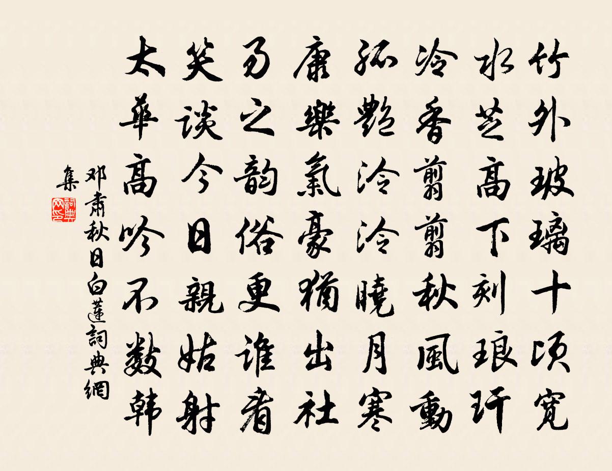 詩詞名句歷史字典書法欣賞書法字典國語詞典說文解字康熙字典古漢語字典標 題 作 者 詩 句 秋日白蓮作者:鄧肅 朝代:宋代秋日白蓮原文竹外玻璃十頃寬,水芝高下刻琅玕。冷香翦翦秋風動,孤艷泠泠曉月寒。康樂氣豪猶出社,易之韻俗更誰看。笑談今日親姑射,太華高吟不數韓。詩詞問答問:秋日白蓮的作者是誰?答:鄧肅問:秋日白蓮寫於哪個朝代?答:宋代鄧肅秋日白蓮書法欣賞秋日白蓮書法作品詩詞推薦喜雨姜特立〔宋代〕昨宵榾榾車聲喧,人情嗷嗷不得眠。今朝一雨忽大足,人聲車聲俱寂然。吁嗟血汗滴焦土,寸寸灌田亦良苦。天工挽平山菊澗陳普〔宋代〕自是斯民手,全民此世身。片言含展席,一室見經綸。德業空成已,詩書上事親。但贏千載內,一樣不無人。禪人並化主寫真求贊釋正覺〔宋代〕教示無轍跡,贊之絕涯岸。才發名言,便成形段。月蘆混處鳴鷗,天水連時沒雁。而今對現十成,向道只得一半。梳頭看可正平詩有寄養直時未祝髮等篇楊萬里〔宋代〕老子平生湯餅腸,客間湯餅亦何嘗。怪來今晚加餐飯,一味廬山筍蕨香。子駿運使八詠堂桐軒文同〔宋代〕晴影滿空壁,晨曦上清軒。庭下雙高桐,枝葉蔚以繁。種者意自遠,豈並群木論。謂可絙朱絲,中有雅韻存。成之秋吟晁說之〔宋代〕友生吾所畏,言貌凜秋威。崔子稻畦晚,楊公玉田飢。階除昨夜霜,鐘鳴尚依稀。吾友豈憔悴,西山空崔巍。晚登千峰榭陸游〔宋代〕只道文書無了日,也能擺撥上層台。窗明山雪暮方作,露白野梅寒未開。老病真慚天下士,窮愁強覆掌中杯。兒曹周五聲調曲 羽調曲 四庾信〔南北朝〕定律零陵玉管。調鍾始平銅尺。龍門之下孤桐。泗水之濱鳴石。河靈於是讓珪。山精所以奉璧。滌九川而賦稅。乘小集垂絲海棠下方岳〔宋代〕酌我紫金盞,醉此紅玉蕤。為經老天手,元氣之所滋。萬生有不齊,時至俱紛披。一一得自性,亦豈造化私。君看除夕前一日歸舟夜泊曲渦市宿治平寺楊萬里〔宋代〕江寬風緊折綿寒,灘多岸少上水船。市何曾遠船不近,意已先到燈明邊。夜投古寺沖泥入,濕薪燒作蟲聲泣。冷窗宮詞楊皇后〔宋代〕溶溶太液碧波翻,雲外樓台日月閒。春到漢室三十六,為分和氣到人間。六州歌頭(吊武穆鄂王忠烈廟)李訦〔宋代〕高皇神武,善駕馭豪英。攘北狄,驅群盜,命天膺。救蒼生。奈夢繞沙漠,隔溫情,屈和好,召大將,歸兵柄,列五松驛李商隱〔唐代〕獨下長亭念過秦,五松不見見輿薪。只應既斬斯高后,尋被樵人用斧斤。雨陰未解成長句趙蕃〔宋代〕一日舒晴十日陰,春來時節更蕭森。徐行索句茅檐靜,孤坐焚香書屋深。少日饑寒真累己,莫年勳業已無心。先賢予久客思歸以秋光都似宦情薄山色不如歸意濃仇遠〔宋代〕威鳳巢深林,神龍潛巨壑。泥塗困螻蟻,城市防彈{矢敫}。小草不自貴,已鑄出山錯。豈知甘苦淡,有味俱不惡有所思二首曹勛〔宋代〕有所思兮天一涯,彼美人兮安得知。江皋送日下洲渚,心遙目斷征鴻飛。蘭嗟蕙怨芳草歇,春歸猶見霏霏雪。文姬聽竇圭琴胡仲弓〔宋代〕指按金徽星斗寒,試聽一曲話悲歡。妙音怕入時人耳,攜入白雲深處彈。芙蓉嶺吳黯〔宋代〕每度芙蓉嶺,愁眉慘不開。有命終須過,無災不再來。燕堂詩蔡茲〔宋代〕世情日澆道情深,悔不林泉早脫簪。一世簡編胎後葉,百年香火奉先心。詩緣好句須親錄,酒到濃時輒倩斟。於此酬和元九東川路詩十二首。駱口驛舊題詩白居易〔唐代〕拙詩在壁無人愛,鳥污苔侵文字殘。唯有多情元侍御,繡衣不惜拂塵看。名句推薦至長反短,至短反長,天之道也。呂不韋《呂氏春秋·論·似順論》 月色穿簾風入竹,倚屏雙黛愁時。顧敻《臨江仙·月色穿簾風入竹》 酒闌更喜團茶苦,夢斷偏宜瑞腦香。李清照《鷓鴣天·寒日蕭蕭上瑣窗》 小憐初上琵琶,曉來思繞天涯。王安國《清平樂·春晚》 看來豈是尋常色,濃淡由他冰雪中。曹雪芹《詠紅梅花得“紅”字》 裳裳者華,其葉湑兮。佚名《裳裳者華》 夜聽胡笳折楊柳,教人意氣憶長安。王翰《涼州詞二首》 凍風時作,作則飛沙走礫。袁宏道《滿井遊記》 見世人可取者多,則德日進矣。王永彬《圍爐夜話·第五六則》 人依遠戍須看火,馬踏深山不見蹤。王昌齡《從軍行七首》