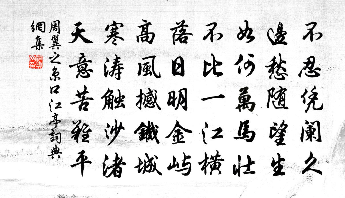 詩詞名句歷史字典書法欣賞書法字典國語詞典說文解字康熙字典古漢語字典標 題 作 者 詩 句 京口江亭作者:周翼之 朝代:宋代京口江亭原文不忍憑闌久,邊愁隨望生。如何萬馬壯,不比一江橫。落日明金嶼,高風撼鐵城。寒濤觸沙渚,天意苦難平。詩詞問答問:京口江亭的作者是誰?答:周翼之問:京口江亭寫於哪個朝代?答:宋代周翼之京口江亭書法欣賞京口江亭書法作品詩詞推薦龍潯山吳遵〔宋代〕危亭瞰碧虛,縹緲青林薄。坐久人不知,衣上雲光落。絕構臨層霄,虛窗動元氣。晨興蒼莽間,諸峰在平地。四月三日張十遺牡丹二朵梅堯臣〔宋代〕已過穀雨十六日,猶見牡丹開淺紅。曾不爭先及春早,能陪芍藥到薰風。句陳舜俞〔宋代〕石間圓影疊金波。張堯夫寺丞改葬輓詞梅堯臣〔宋代〕舊墳為潤齧,新冢得山深。斬木來荒路,移松出近岑。黃鸝啼棗上,玉女問泉音。強作挽人唱,儻知哀感心。春日田家三首黃大受〔宋代〕清明百草春,家家上丘墓。南鄰去年冬,祝痛及翁嫗。酒戎羅新阡,蹙頞見追慕。舊時細君墳,望見淚已注。紙錢定西番溫庭筠〔唐代〕捍撥紫槽金襯,雙秀萼,兩回鸞。齊學漢宮妝樣,競嬋娟。三十六弦蟬鬧,小弦蜂作團。聽盡昭君幽怨,莫重彈。詠虞美人花吳信辰〔清代〕怨粉愁香繞砌多,大風一起奈卿何。烏江夜雨天涯滿,休向花前唱楚歌。梧桐樹牧常晁〔元代〕汞既心,鉛即氣。汞鉛結就丹根蒂。產在西南地。坎離龍虎總由伊。性命陰陽只這是。勸君早留意。渚宮秋思羅隱〔唐代〕楚城日暮煙靄深,楚人駐馬還登臨。襄王台下水無賴,神女廟前雲有心。千載是非難重問,一江風雨好閒吟。欲招奉使鎮州,行次承天行營,奉酬裴司空韓愈〔唐代〕竄逐三年海上歸,逢公復此著征衣。旋吟佳句還鞭馬,恨不身先去鳥飛。玉團兒周邦彥〔宋代〕妍姿艷態腰如束。笑無限、桃粗杏俗。 * ,雲鬟斜墜,春睡還熟。夕陽斗轉闌乾曲。乍醉起、餘霞襯肉。搦綠淨軒鄭剛中〔宋代〕小小軒窗冷逼人,竹無俗韻水無塵。正如蘆葦瀟湘浦,不見樊然花柳春。登劍南西川門感懷陸游〔宋代〕自古高樓傷客情,更堪萬里望吳京。故人不見暮雲合,客子欲歸春水生。瘴癘連年須藥石,退藏無地著柴荊。諸公憶晦叔白居易〔唐代〕游山弄水攜詩卷,看月尋花把酒杯。六事盡思君作伴,幾時歸到洛陽來?深自婦氏歸侍陳著〔宋代〕我生貧非窮,有子環我膝。深汝實居長,何可去頃刻。顧從百里外,贅滯日復日。事有不得已,我心常壹鬱。昨朝和丘員外《題湛長史舊居》李益〔唐代〕昔降英王顧,屏身幽岩曲。靈波結繁笳,爽籟赴鳴玉。運轉春華至,歲來山草綠。青松掩落暉,白雲竟空谷。伊人清平樂(私情)黃庭堅〔宋代〕銀燭生花如紅豆。占好事、而今有。人醉曲屏深,借寶瑟、輕招手。一陣白苹風,故滅燭、教相就。花帶雨、冰肌好事近(再和)李之儀〔宋代〕上盡玉梯雲,還見一番佳節。惆悵舊時行處,把青青輕折。倚闌人醉欲黃昏,飛鳥望中滅。天面碧琉璃上,印彎彎次韻吳雅翁秋懷四首黎廷瑞〔宋代〕蟋蟀鳴空階,亹亹昏達曙。感此不成眠,推枕覓長句。物情欣得時,我乃獨不遇。悠悠經世心,歲晚付農圃。長歌三峽歌陸游〔宋代〕神女廟前秋月明,黃牛峽里暮猿聲。危途性命不容恤,百丈牽船侵夜行。名句推薦煙霏雲斂;其容清明,天高日晶;歐陽修《秋聲賦》 力貴突,智貴卒。得之同則速為上,勝之同則濕為下。呂不韋《呂氏春秋·論·開春論》 平生多感激,忠義非外獎。李白《酬裴侍御對雨感時見贈》 孤燈寒照雨,濕竹暗浮煙。司空曙《雲陽館與韓紳宿別》 露清枕簟藕花香,恨悠揚。顧敻《虞美人·觸簾風送景陽鍾》 雲山萬重兮歸路遐,疾風千里兮揚塵沙。蔡文姬《胡笳十八拍》 刑稱罪,則治;不稱罪,則亂。荀子《荀子·正論》 去國十年老盡、少年心。黃庭堅《虞美人·宜州見梅作》 枕前何事最傷情?梧桐葉上,點點露珠零。尹鶚《臨江仙·深秋寒夜銀河靜》 料因循誤了,殘氈擁雪,故人心眼。張炎《解連環·孤雁》