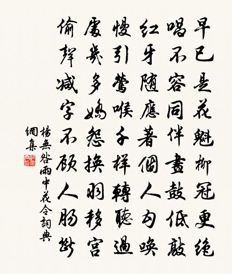 詩詞名句歷史字典書法欣賞書法字典國語詞典說文解字康熙字典古漢語字典標 題 作 者 詩 句 雨中花令作者:楊無咎 朝代:宋代雨中花令原文早已是花魁柳冠。更絕唱、不容同伴。畫鼓低敲,紅牙隨應,著個人勾喚。慢引鶯喉千樣轉。聽過處、幾多嬌怨。換羽移宮,偷聲減字,不顧人腸斷。詩詞問答問:雨中花令的作者是誰?答:楊無咎問:雨中花令寫於哪個朝代?答:宋代楊無咎雨中花令書法欣賞雨中花令書法作品詩詞推薦口占李流謙〔宋代〕午照當窗樹影疎,靜聽{左浖右虎}{左浖右虎}水鳴除。便將一日平分了,半用酣眠半讀書。鄭生嘗隱天台,徵起而仕。今復謝病,隱於此白居易〔唐代〕鄭君得自然,虛白生心胸。吸彼沆瀣精,凝為冰雪容。大君貞元初,求賢致時雍。蒲輪入翠微,迎下天台峰。赤城令狐相公與夢得交情素深眷予分亦不淺一聞薨逝…繼和白居易〔唐代〕緘題重疊語殷勤,存沒交親自此分。前月使來猶理命,今朝詩到是遺文。銀鉤見晚書無報,玉樹埋深哭不聞。最感商山路有感白居易〔唐代〕憶昨征還日,三人歸路同。此生都是夢,前事旋成空。杓直泉埋玉,虞平燭過風。唯殘樂天在,頭白向江東。鷓鴣天周紫芝〔宋代〕樓上緗桃一萼紅。別來開謝幾東風。武陵春盡無人處,猶有劉郎去後蹤。香閣小,翠簾重。今宵何事偶相逢。行雲如夢令 贈道夫二首曹伯啟〔元代〕學有探奇索妙。命有人僧鬼笑。難與老天爭,寂寞漢陵周廟。權要。權要。林樾有人清嘯。醉賦陸游〔宋代〕霜楓照茅屋,露菊插紗巾。今古無窮事,江湖未死身。直令依馬磨,終勝拜車塵。我亦輕餘子,君當恕醉人。福州內檗送廣州化主釋崇岳〔宋代〕不住煙蘿第一層,翻身要勘嶺南能。謂言檗嶠三千指,不比黃梅七百僧。紫溪莊舍讀癸丑壁間舊題轉眼忽十八年同游十劉學箕〔宋代〕維親與朋,雜然滿坐。華屋連甍,紅紫毓移。半世重遊,霧 * 鎖。慨然撫膺,謬悠老我。和梁簽判潁州西湖十三題去思堂蘇頌〔宋代〕丞相臨人以惠和,三年鄉校起弦歌。至今旌旆曾游處,猶道當時樂事多。恭和御製進讀唐鑒徹章詩劉克莊〔宋代〕考詳往事炳蓍龜,精論微言訓戒垂。度贊元和中興業,徵開貞觀太平基。覽披賢似銅為鑑,顧問謙然木就規。孤遠高士詠周豐吳筠〔唐代〕周豐貴隱耀,靜默尊無名。魯侯詢政體,喻以治道精。蒞人在忠愨,疑叛由會盟。一言達至義,千載良為程。木蘭花慢 和陳思濟 洞霄詩集卷九劉元〔元代〕問神仙何處,尋溪路,水聲寒。此福地靈岩,西南天柱,洞府名山。翠蛟對誰或舞,更岩飛、龍鳳駭人看。見說丹投壺全中戲成曾幾〔宋代〕寸心只在所投中,出手何曾一箭空。不作秋風鋪落葉,端如春草種成叢。旁觀詎敢當勍敵,俯拾無勞命短童。說與上水遣懷杜甫〔唐代〕我衰太平時,身病戎馬後。蹭蹬多拙為,安得不皓首。驅馳四海內,童稚日餬口。但遇新少年,少逢舊親友。低顏園步雜興張鎡〔宋代〕豆籬黃葉被蔬田,靜極情懷似黯然。居舍又從東壁看,柳梢濃處起廚煙。行香子劉處玄〔元代〕歷遍人間。卻羨名山。洞天清、坐聽潺*。萬株松檜,千頃雲煙。好伴琴書,真念道,樂安閒。養就靈鉛,命耀光後天易吟三十首方回〔宋代〕祖考精神散,子孫能聚之。淫祠祭非鬼,萃渙義何居。洪州城下作徐照〔宋代〕野靄初收見遠汀,數株楊柳是官亭。漁人各晚各歸去,一陣風來釣具腥。書懷黃滔〔唐代〕退耕逢歉歲,逐貢愧行朝。道在愁雖淺,吟勞鬢欲凋。破村虹入井,孤館客投魈。誰怕秋風起,聽蟬度渭橋。名句推薦山亭水榭秋方半。鳳幃寂寞無人伴。朱淑真《菩薩蠻·山亭水榭秋方半》 此情可待成追憶?只是當時已惘然。李商隱《錦瑟》 塞馬一聲嘶,殘星拂大旗。納蘭性德《菩薩蠻·朔風吹散三更雪》 春朝秋夜思君甚,愁見繡屏孤枕。魏承班《滿宮花·雪霏霏》 桃花落後蠶齊浴,竹筍抽時燕便來。朱彝尊《鴛鴦湖棹歌·一百首選二》 謙尊而光,卑而不可逾,君子之終也。佚名《易傳·彖傳上·謙》 寒月悲笳,萬里西風瀚海沙。納蘭性德《採桑子·塞上詠雪花》 無功不賞,無罪不罰。荀子《荀子·王制》 福來有由,禍來有漸。陳壽《三國志·吳書·吳主五子傳》 樹挪死,人挪活。佚名《增廣賢文·下集》