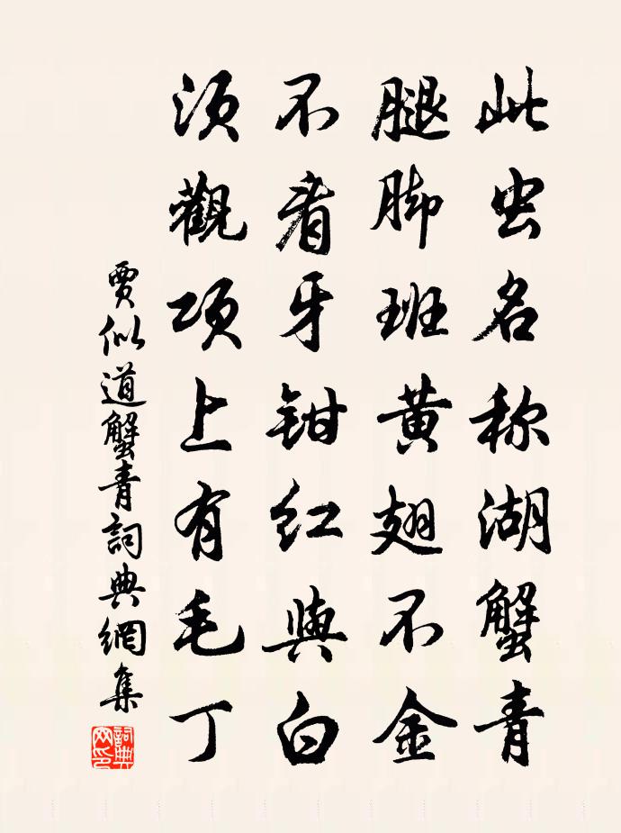 詩詞名句歷史字典書法欣賞書法字典國語詞典說文解字康熙字典古漢語字典標 題 作 者 詩 句 蟹青作者:賈似道 朝代:宋代蟹青原文此蟲名稱湖蟹青,腿腳班黃翅不金。不看牙鉗紅與白,須觀項上有毛丁。詩詞問答問:蟹青的作者是誰?答:賈似道問:蟹青寫於哪個朝代?答:宋代賈似道蟹青書法欣賞蟹青書法作品詩詞推薦禪人並化主寫真求贊釋正覺〔宋代〕眉下眼深,額上骨隆。說禪口窄,受道心空。閒閒無伎倆,默默有家風。片月濯磨秋更白,百華點染春能工。滿江紅(壽留守正·月初三)劉仙倫〔宋代〕鳳歷更端,才信宿、年華方好。深院宇、祥風飄蕩,瑞煙繚繞。聞道君侯當誕日,歡聲解壓春寒峭。更九衢、煙火和秋浦聞雞偶成王志道〔宋代〕窗前銀燭焰將暗,樓上梅花引已殘。忽聽雞鳴思起舞,百年王業尚偏安。挽雇學正鄭居中〔宋代〕可惜病相如,誰尋封禪書。雙親千里外,一葉九秋餘。風露翻歸旐,麈埃鎖故廬。虎丘山下路,會葬有鄉車。梨花舒岳祥〔宋代〕新葉輕柔宜與藉,芳心疏散不須茸。象床骨冷尺春夢,霧閣神清怯曉風。雨里多情危有淚,月中澄瑩望如空。清明送方文甫判官劉克莊〔宋代〕檄筆騷情俱妙絕,它人才少子才多。分桐 * 從初祖,在孔門中占二科。此去潘輿添燕喜,向來韓木尚婆娑。傳聞自訟李復〔宋代〕前善後隨非,失於任私意。短長莫可欺,明者未免蔽。改過心每憚,責人夫何易。芸苗舍己田,無獲亦蹈厲。九日登東山寄昌叔王安石〔宋代〕城上啼烏破寂寥,思君何處坐迢嶢。應須綠酒酬 * ,何必紅裙弄紫簫。落木雲連秋水渡,亂山煙入夕陽橋。淵明送春鄧肅〔宋代〕宿雨初開萬翠屏,相攜雲水自由身。寸心未逐鶯花老,一笑能留天地春。儻得新詩同刻燭,不妨濁酒共傾銀。往來答韓湘姚合〔唐代〕疏散無世用,為文乏天格。把筆日不休,忽忽有所得。所得良 * ,不求他人識。子獨訪我來,致詩過相飾。君子孫元實春遊圖王冕〔元代〕先生讀書不閉戶,坐閱鴻濛窺太古。衣冠瀟灑武前修,禮樂從容出東魯。文章光焰駕李杜,李杜後來稱獨步。談辯夕月三首佚名〔宋代〕凝陰稟粹,照臨八埏。麗天垂象,繼日代明。一氣資始,四時運行。靈祗昭昭,備物訝誠。漫興九首方回〔宋代〕淡虀淘大麥,甘酪薦含桃。風調誰優劣,田家似頗高。薌林五十詠無熱軒楊萬里〔宋代〕南北與東西,溪光仍樹色。人間無熱軒,物外清涼國。浣溪沙佚名〔宋代〕誰識飛竿巧藝全。兒童群戲艷陽天。十分險處卻安然。海燕舞空縈弱絮,嶺猿連臂下層顛。算來真箇肉飛仙。經從豐城謁於房州於令侍姬歌舞進酒二首危稹〔宋代〕蛾眉對歌舞涼伊,舞身還逐歌聲齊。卷花萬段忽進酒,斬高蝴蝶飛來低。和道叟韻吳芾〔宋代〕自憐涉世太迂疏,豈料今朝得自如。老去不知官況好,歸來頓覺道心舒。湖山深處非凡景,松竹陰中有舊廬。靜坐延平得雪陳宓〔宋代〕衍山先自無塵土,更著飛瓊細糝看。可笑一生緣好事,卻將衰鬢敵隆寒。為昌州月上人贊布袋釋紹曇〔宋代〕拄杖不能倚靠,穩跨布袋打坐。莫怪噴嚏不成,鼻孔元來無竅。阻風入長蘆寺黃庭堅〔宋代〕福公開百室,不借鄰國權。法筵森龍象,天樂下管弦。我來雨花地,依舊薰爐煙。金碧動江水,鍾魚到客船。茗椀名句推薦江心雲帶蒲帆重,樓上風吹粉淚香。嚴仁《鷓鴣天·惜別》 出南門即大海,一日兩潮,如萬丈銀堤破海而過。沈復《浮生六記·浪遊記快》 蜃散雲收破樓閣,虹殘水照斷橋粱。白居易《江樓晚眺景物鮮奇吟玩成篇寄水部張員外》 東望鞭芙縹緲,寒光如注。劉辰翁《桂枝香· * 人去》 善惡同,則功臣倦。黃石公《三略·上略》 不道愁人不喜聽。空階滴到明。万俟詠《長相思·雨》 何意更觴昌歜酒,為君擊節一長歌。趙蕃《端午三首》 北極朝廷終不改,西山寇盜莫相侵。杜甫《登樓》 想文君望久,倚竹愁生步羅襪。姜夔《八歸·湘中送胡德華》 行出於己,名生於人。佚名《逸周書·卷六·諡法解》
