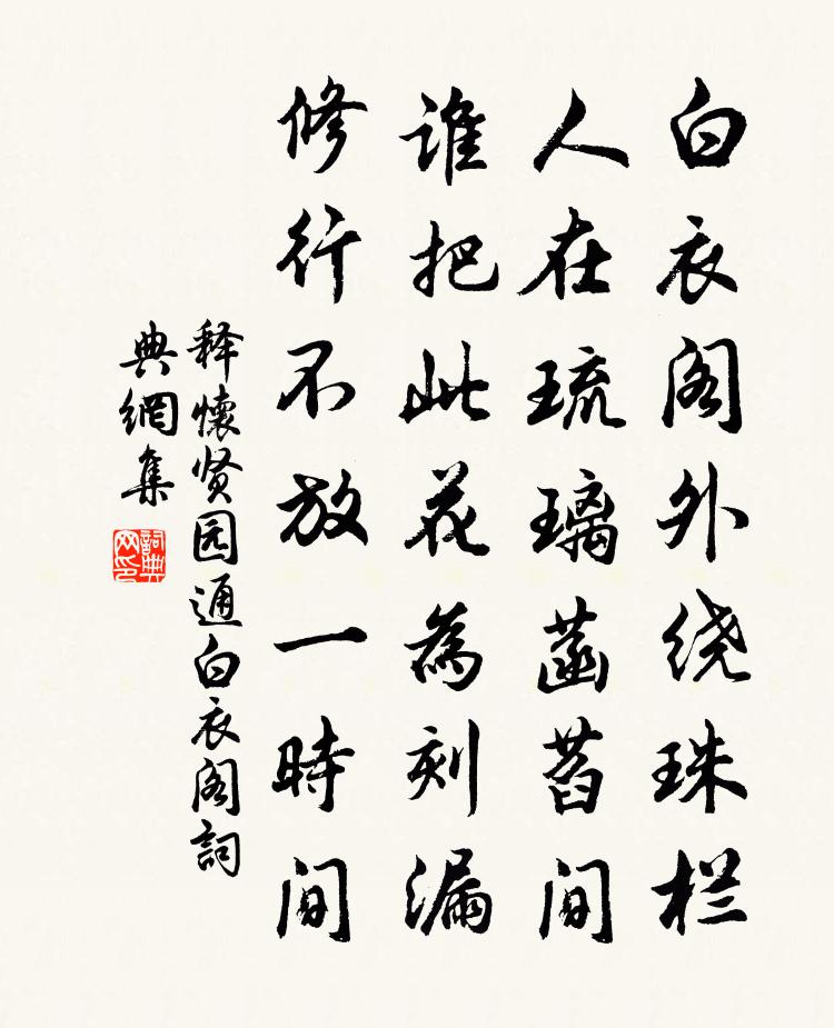 詩詞名句歷史字典書法欣賞書法字典國語詞典說文解字康熙字典古漢語字典標 題 作 者 詩 句 園通白衣閣作者:釋懷賢 朝代:宋代園通白衣閣原文白衣閣外繞珠欄,人在琉璃菡萏間。誰把此花為刻漏,修行不放一時間。詩詞問答問:園通白衣閣的作者是誰?答:釋懷賢問:園通白衣閣寫於哪個朝代?答:宋代釋懷賢園通白衣閣書法欣賞園通白衣閣書法作品詩詞推薦金陵雜興二百首蘇泂〔宋代〕闌乾三面倚晴暉,竹外長江一線微。太守不來僧自看,清涼境界籜龍圍。【中呂】粉蝶兒 寄情人佚名〔元代〕江景蕭疏,那堪楚天秋暮,戰西風柳敗荷枯。立夕陽,空凝佇,江鄉古渡,水接天隅,眼瀰漫晚山煙樹。 【醉處州葉德共輓詩項安世〔宋代〕儒服能軍事,人心以富行。邑中無惡少,堂上有佳名。死得安仁誄,生經短簿評。哀榮有如此,何必漢公卿。梅張鎡〔宋代〕冒寒崗路透溪橋,驢仆翩翩葉亂飄。還是去年初見處,青旗茅店恰相招。過石門灘郭印〔宋代〕長江風雨急,巨石虎狼蹲。水自分三道,舟唯過一門。細觀真眩目,平下亦銷魂。忠信知堪仗,見曹不用喧。昭君怨(一作董思恭詩)佚名〔唐代〕新年猶尚小,那堪遠聘秦。裾衫沾馬汗,眉黛染胡塵。舉眼無相識,路逢皆異人。唯有梅將李,猶帶故鄉春。松江使君張周卿致泖口蟹四十輩方回〔宋代〕松江太守今賢侯,喜有螃蟹無監州。左手持螯右杯酒,文章政事第一流。吳由今年十分秋,各執稻穗朝厥酋。初生紀龍井上所見鄭清之〔宋代〕搖曳輕陰羃柳堤,坳塘日暖漾鳧鷖。無端崖下鳴榔發,飛起一聲過水西。浣溪沙(餞萬大卿。前一夜有月,此日不得用樂作)程大昌〔宋代〕物本無情人有情。百般禽咮百般聲。有人聞鵲不聞鶯。我盞通神君信否,酒才著盞月隨生。大家吸月當簫笙。倉部弟生日五絕劉克莊〔宋代〕平生老兄弟,歲晚共婆娑。蘇氏推同叔,程家說二哥。長溪陳夢雷攜表弟趙君玉書相訪劉克莊〔宋代〕□□外弟寄雙魚,細讀銀鉤卷復舒。愧我掛冠方草奏,誤君載盾過茆廬。罷祠久絕支離粟,失勢誰看閒雜書。老畏永嘉上浦館逢張八子容(一題作永嘉浦逢張子容客卿)孟浩然〔唐代〕逆旅相逢處,江村日暮時。眾山遙對酒,孤嶼共題詩。廨宇鄰蛟室,人煙接島夷。鄉園萬餘里,失路一相悲。點絳唇黃公度〔宋代〕嫩綠嬌紅,砌成別恨千千斗。短亭回首。不是緣春瘦。一曲陽關,杯送纖縴手。還知否。鳳池歸後。無路陪尊酒。寄益謙李處權〔宋代〕青鬢追隨到白頭,中間憂患兩悠悠。異時果有臧倉沮,他日寧無雍齒侯。舊隱重過三徑菊,昔賢何在五湖舟。一杯句衛準〔唐代〕莫言閒話是閒話,往往事從閒話來。知何必剃頭為弟子,無家便是出家人。黎明府見示令叔顯謨開國墓誌求詩為賦三首戴復古〔宋代〕虜橫干戈密,官清財賦強。飢年無餓莩,亂後有金湯。五郡樹佳政,諸公交薦章。忠言動天聽,惜去把麾忙。遠如期趙文〔宋代〕遠如期,近可知。如何咫尺間,朝之所約夕背之。千言萬語托死生,轉眼已若行路人。問之何遽至如許,往往或起愬魃:張耒〔宋代〕帝治下土兮遠於民,撫御萬方兮周無垠。物類億千兮莽蓁蓁,出入日月兮運星辰。廣必有容兮潛奸昏,不上愬兮帝依韻和載陽登廣福寺閣梅堯臣〔宋代〕過聞聯騎出,登覽思踰清。曉漲林煙重,春歸野水平。始看僊杏發,已愛裌衣輕。誰見吟余處,殘陽上古城。和鍾大監泛舟同游見示徐鉉〔唐代〕潮溝橫趣北山阿,一月三游未是多。老去交親難暫舍,閒中滋味更無過。溪橋樹映行人渡,村徑風飄牧豎歌。孤棹名句推薦少年聽雨歌樓上。紅燭昏羅帳。蔣捷《虞美人·聽雨》 紅粉當壚弱柳垂,金花臘酒解酴醿。賈至《春思二首》 東風灑雨露,會入天地春。李白《送郄昂謫巴中》 靜女其孌,貽我彤管。佚名《靜女》 智之所貴,存我為貴;力之所賤,侵物為賤。然身非我有也,既生,不得不全之列子及其弟子《列子·楊朱》 無作牛山悲,惻愴淚沾臆。李白《君子有所思行》 未知鹿死誰手房玄齡《晉書·載記·第五章》 青春花姊不同時。淒涼生較遲。吳文英《醉桃源·芙蓉》 是以知天欲人相愛相利,而不欲人相惡相賊。墨子《墨子·04章 法儀》 心事孤山春夢在,到思量、猶斷詩魂吳文英《極相思·題陳藏一水月梅扇》