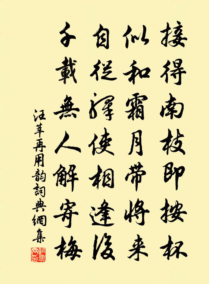 詩詞名句歷史字典書法欣賞書法字典國語詞典說文解字康熙字典古漢語字典標 題 作 者 詩 句 再用韻作者:汪莘 朝代:宋代再用韻原文接得南枝即按杯,似和霜月帶將來。自從驛使相逢後,千載無人解寄梅。詩詞問答問:再用韻的作者是誰?答:汪莘問:再用韻寫於哪個朝代?答:宋代汪莘再用韻書法欣賞再用韻書法作品詩詞推薦寄題丁子厚二亭朋來亭孔武仲〔宋代〕學有青衿聚,亭當綠野開。山川二湖曲,賓友四方來。鄉行求如禹,師門欲望回。無輕十室小,長養即高才。有懷都下寒食李廌〔宋代〕上國茲晨每豫游,仙仗繚繞來瀛洲。天王高御寶津樓,侍臣壁立環諸侯。簫韶引風搖樹羽,晴波飛影動宸旒。闌乾雙井圖徐得之〔宋代〕異時生出鬼門關,及去宜州竟不還。意者早知名是累,持鋤應只在家山。出關方岳〔宋代〕一坐一百二十日,柳初黃落今青青。索輿徑去有忙事,忽憶曾與春丁字。牡丹徑尺妙天下,許釀醽醁呼娉婷。到家用陳阜卿勸農韻呈宣城太守王之道〔宋代〕何處催耕早,宣城刺史先。旗麾明曉市,耒耜遍晴川。道咱歡聲接,樽罍麗景鮮。似聞攜百榼,分餉及高年。春日登望海亭張伯玉〔宋代〕望海亭前春色深,風光澹澹海沈沈。潮如世路來還去,山帶城蕪古到今。坐見微雲生別岸,吟驚幽鳥起層陰。勸君次蒲尉韻李石〔宋代〕斯言誠虛筌,遮眼漫盈紙。冷暖當自知,此味如飲水。誰肯落驕榮,還來共枯悴。待渠轉船頭,著力與風值。最憐清隱院張頤〔宋代〕古寺深山裡,高亭萬木叢。歸雲度疏牖,繡嶺倚晴空。澗草連階綠,岩花照檻紅。縱非塵世外,無異畫圖中。同周湛二上人游西湖之北山天竺晚歸得十絕釋紹嵩〔宋代〕和靖先生墳已荒,三春花草殿余芳。欄乾倚遍斜陽晚,戶牖軒窗總是香。別何員外元結〔唐代〕誰能守清躅,誰能嗣世儒。吾見何君饒,為人有是夫。黜官二十年,未曾暫崎嶇。終不病貧賤,寥寥無所拘。忽然山中吟陳允平〔宋代〕身在此山中,閒情薄太空。行歌白雲里,白雲連崆洞。拾得攜苕箒贊釋子益〔宋代〕往來雙磵路,腳下起塵埃。苕箒忙忙掃,何曾掃得來。寄胡介林逋〔宋代〕憶著胡居士,長看古佛書。衡門惟老母,一飯共寒蔬。墨跡多圖鶴,山名愛畫廬。幾回曾會宿,風雪滿庭除。詠史詩長安胡曾〔唐代〕關東新破項王歸,赤幟悠揚日月旗。從此漢家無敵國,爭教彭越受誅夷。訴衷情(二之一)賀鑄〔宋代〕不堪回首臥雲鄉。羈宦負清狂。年來鏡湖風月,魚鳥兩相忘。秦塞險,楚山蒼。更斜陽。畫橋流水,曾見扁舟,幾頌古四十四首釋法泰〔宋代〕宗師垂手貴天真,肯事雕蟲篆刻新。只向平田淺草處,等閒推出玉麒麟。清明日湖上晚步敖陶孫〔宋代〕一百五日苦多雨,二十四花能幾風。壯心欲與兒女競,春事翻成寇盜空。公私蛙合笙歌里,客主山張圖畫中。作意官居戲詠陸游〔宋代〕萬里飄然似斷蓬,桐廬江上又秋風。判余牘尾棲鴉濕,衙退庭中立雁空。燈火市樓知酒賤,歌呼村路覺年豐。誰言翰林作劉鄴〔唐代〕曾是江波垂釣人,自憐深厭九衢塵。浮生漸老年隨水,往事曾聞淚滿巾。已覺遠天秋色動,不堪閒夜雨聲頻。多慚水調歌頭 為初心真人七 初度時延祥張雨〔元代〕瑞靄延真館,春滿瑞真家。絳縣老人年紀,更柰紫髯何。前日黃華迎賜,賜予青氈舊物,田野總謳歌。報貺啟金*名句推薦曉月墜,宿雲微,無語枕頻欹。李煜《喜遷鶯·曉月墜》 綠葉陰濃,遍池亭水閣,偏趁涼多。元好問《驟雨打新荷》 巧媳婦煮不得沒米粥馮夢龍《警世通言·卷十二》 無稽之言,不見之行,不聞之謀,君子慎之。荀子《荀子·正名》 死者不可再生,用法務在寬簡。吳兢《貞觀政要·卷八·論刑法》 長夏村墟風日清,檐牙燕雀已生成。張耒《夏日三首·其一》 智者千慮,必有一失;愚者千慮,必有一得。司馬遷《史記·淮陰侯列傳》 莫道君行早,更有早行人。佚名《增廣賢文·上集》 軍氣橫大荒,戰酣日將入。王昌齡《從軍行二首》 生平未報國,留作忠魂補。楊繼盛《就義詩》