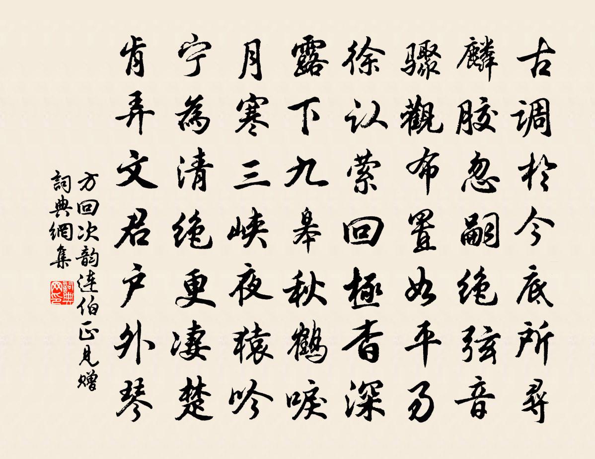 詩詞名句歷史字典書法欣賞書法字典國語詞典說文解字康熙字典古漢語字典標 題 作 者 詩 句 次韻連伯正見贈作者:方回 朝代:宋代次韻連伯正見贈原文古調於今底所尋,麟膠忽嗣絕弦音。驟觀布置如平易,徐認縈迴極杳深。露下九皋秋鶴唳,月寒三峽夜猿吟。寧為清絕更淒楚,肯弄文君戶外琴。詩詞問答問:次韻連伯正見贈的作者是誰?答:方回問:次韻連伯正見贈寫於哪個朝代?答:宋代方回次韻連伯正見贈書法欣賞次韻連伯正見贈書法作品詩詞推薦陳令舉妙奴詩秦觀〔宋代〕西湖水滑多嬌嬙,妙奴十二正芬芳。肌膚皙白髮腳長,含語未發先有香。溪上夜燕侍簪裳,皎如華月墮滄浪。音聲賀高中書兼崇政殿說書三首岳珂〔宋代〕邇聯咨夕訪,清問切辰猷。博學今中壘,遐征古上游。齒寒當預計,身履即良籌。頗牧豈雲遠,隱憂其有瘳。訓世孝弟詩十首邵雍〔宋代〕子孝親兮弟敬哥,休傷和氣忿爭多。偏生嫉妒偏艱窘,暗積私房暗折磨。不孝自然生忤逆,無仁實是出妖魔。但聞呈洞山初禪師釋良雅〔宋代〕五彩畫牛頭,黃金為點額。春晴二月初,農人皆取則。寒食賀新正,鐵錢三五百。吳知府輓詩三首釋寶曇〔宋代〕妙年聲落落,晚歲陳堂堂。政出諸公右,吾寧一老傍。園林春婉娩,墳土淚淒涼。孝友無餘事,新詩入錦囊。送資政侍讀侍郎西赴陝郊宋庠〔宋代〕君欲歸休未得休,再持符節定西侯。深嚴殿籍恩圖舊,蔽芾棠歌野續謳。洛浦神仙觀送客,崤陵風雨避傳騶。高懷再次韻二首陳造〔宋代〕問舟初立柳汀沙,雲日昇空淥影斜。詩橐恥隨金埒客,蔬腸未厭玉川茶。青湖波外方游女,翠幄叢間亦晚花。小待新春陸游〔宋代〕蒙蒙煙雨暗江乾,新歲還勝故歲寒。酒壓濁清鳴社瓮,菜分紅綠簇春盤。良辰節物元如昨,病客情懷自鮮歡。卻羨別滿首座釋正覺〔宋代〕丹山鳳窟冷相依,慚愧如今羽翼齊。雲外翔鳴同頡頏,林間啄步暫分攜。玉華銜處天容曉,珠樹棲時月影低。引喙戲成白髮二首張鎡〔宋代〕朝朝摘白髮,新生亦非黑。縱使白不生,禿翁還諱得。自考功員外授給事中沈佺期〔唐代〕南省推丹地,東曹拜瑣闈。惠移雙管筆,恩降五時衣。出入宜真選,遭逢每濫飛。器慚公理拙,才謝子云微。案牘答及甫見和二首洪咨夔〔宋代〕我愛湖南客,從橫正復奇。短裳甘制芰,破斧懶燃萁。憤世惟堪飲,憂邊不到詩。最憐孤寂甚,欲為喚羅龜。荊州新秋病起雜題一十五首病起見苔色齊己〔唐代〕病起見苔色,凝然陣未枯。淺深圍柱礎,詰曲繞廊廡。碧翠文相間,青黃勢自鋪。為錢虛玷染,畢竟不如無。緣識宋太宗〔宋代〕性相化嚴海,愛何渡要津。法門千萬偈,奧妙演無倫。游山寺周南〔宋代〕山寺清明蛺蝶飛,中庭古佛供琉璃。僧房也有追游市,瓦狗泥車誑小兒。垂楊碧(寓謁金門)張輯〔宋代〕花半濕。睡起一窗晴色。千里江南真咫尺。醉中歸夢直。前度蘭舟送客。雙鯉沈沈訊息。樓外垂楊如此碧。問春來贈無咎以既見君子云胡不喜為韻八首張耒〔宋代〕文風還正始,磊落有諸君。長者進後生,亦使我有聞。譬如狸與虎,偶使並稱文。終然不可及,困我力空勤。室空釋文珦〔宋代〕室空無侍者,坐臥一團蒲。但見朝還暮,焉知榮與枯。山心便寂寞,天籟聽喁於。雲外幽人好,時來問老夫。送張無夢歸天台山丁謂〔宋代〕不逐蒲輪至,惟尋蕙帳還。冥鴻思物外,遼鶴別人間。心與冠纓遠,身將日月閒。放歸銜帝澤,賜封仰天顏。逸躅從叔將軍宅薔薇花開太府韋卿有題壁長句因以和作權德輿〔唐代〕環列從容蹀躞歸,光風駘蕩發紅薇。鶯藏密葉宜新霽,蹀繞低枝愛晚暉。艷色當軒迷舞袖,繁香滿徑拂朝衣。名卿名句推薦時不可留,眾不可逆。范曄《後漢書·本紀·光武帝紀上》 蜂須輕惹百花心,蕙風蘭思寄清琴。薛昭蘊《浣溪沙·握手河橋柳似金》 江上晚來堪畫處,釣魚人一蓑歸去。馬致遠《壽陽曲·江天暮雪》 清夜何湛湛,孤燭映蘭幕。江淹《銅爵妓》 名播蘭簪妃后里,暈生蓮臉君王側。王清惠《滿江紅·題南京夷山驛》 小軒獨坐相思處,情緒好無聊。石孝友《眼兒媚·愁雲淡淡雨瀟瀟》 見梨花初帶夜月,海棠半含朝雨。万俟詠《三台·清明應制》 兒女紛紛夸結束,新樣釵符艾虎。劉克莊《賀新郎·端午》 鶯鶯燕燕分飛後,粉淡梨花瘦。元好問《虞美人·槐陰別院宜清晝》 遙憶獨眠人,早寒驚夢頻。顧貞觀《菩薩蠻·山城夜半催金柝》