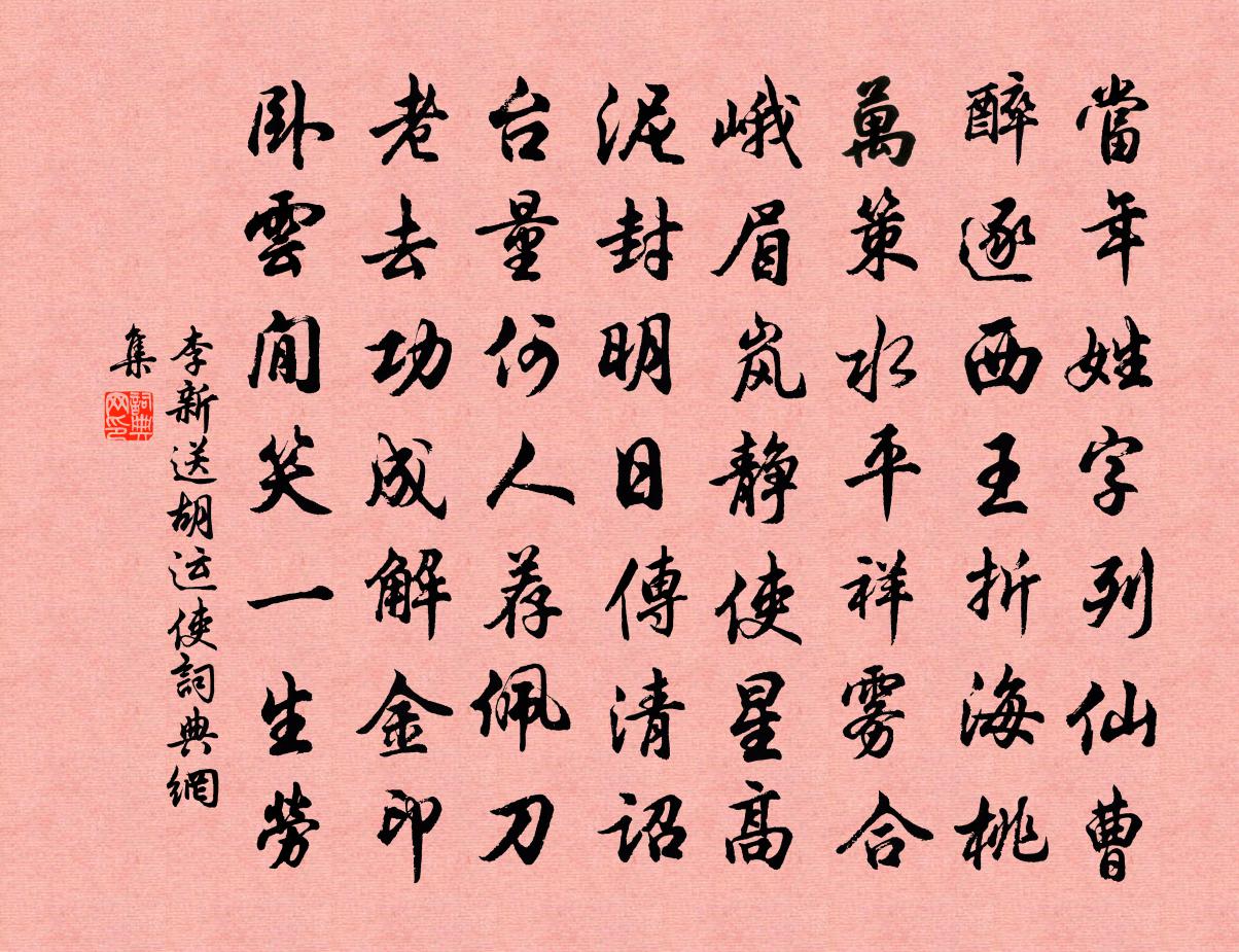 詩詞名句歷史字典書法欣賞書法字典國語詞典說文解字康熙字典古漢語字典標 題 作 者 詩 句 送胡運使作者:李新 朝代:宋代送胡運使原文當年姓字列仙曹,醉逐西王折海桃。萬策水平祥霧合,峨眉嵐靜使星高。泥封明日傳清詔,台量何人薦佩刀。老去功成解金印,臥雲閒笑一生勞。詩詞問答問:送胡運使的作者是誰?答:李新問:送胡運使寫於哪個朝代?答:宋代李新送胡運使書法欣賞送胡運使書法作品詩詞推薦方鏡賈島〔唐代〕背如刀截機頭錦,面似升量澗底泉。銅雀台南秋日後,照來照去已三年。送徐兄訪陳宰葉茵〔宋代〕投老持竿柳外村,尺書久不抵修門。料應下榻從容日,自說通家好子孫。偈頌一百零九首釋可湘〔宋代〕十方國土中,惟有一乘法。如何是一乘法,梅雨過,芰荷香,薰風殿閣生微涼。送徐仲洪尉南安八首彭龜年〔宋代〕椎牛酌酒是民頑,明約科條墟裡間。若更寬他衣食路,桑間陌上自閒閒。偈頌一百一十七首釋紹曇〔宋代〕願百劫千生,驀劄相逢,好眼看承,好收攀顧。切莫重行巘險路,背後恐遭人指註。仇家酒白居易〔唐代〕年年老去歡情少,處處春來感事深。時到仇家非愛酒,醉時心勝醒時心。上元懷舊文天祥〔宋代〕禁門三五金吾夜,回首青春忽二毛。池上昔陪王母宴,斗中今直貴人牢。風生江海龍游遠,月滿關山鶴唳高。夢到江上吟李白〔唐代〕木蘭之枻沙棠舟,玉簫金管坐兩頭。美酒尊中置千斛,載妓隨波任去留。仙人有待乘黃鶴,海客無心隨白鷗。屈平唐秀才贈端州紫石硯,以詩答之劉禹錫〔唐代〕端州石硯人間重,贈我因知正草玄。闕里廟堂空舊物,開方灶下豈天然。玉蜍吐水霞光靜,彩翰搖風絳錦鮮。此日高宗皇帝輓詞二首葉適〔宋代〕河濟初開府,江淮晚視師。纘戎由子聖,永命獨天知。鶴唳空虛警,雲生仗自移。上哀何以稱,卒代繼周時。王明美招飲有能窺狗竇之語因作詩貽之李新〔宋代〕校書隱馬隊,飲酒窺狗竇。禮法不見縛,高軒一宇宙。二王咤連璧,小王腹如繡。囊無一個錢,氣自秦楚富。公子商山夜聞泉曹松〔唐代〕瀉月聲不斷,坐來心益閒。無人知落處,萬木冷空山。遠憶雲容外,幽疑石縫間。那辭通曙聽,明日度藍關。紫騮馬李白〔唐代〕紫騮行且嘶,雙翻碧玉蹄。臨流不肯渡,似惜錦障泥。白雪關山遠,黃雲海戍迷。揮鞭萬里去,安得念春閨。丙寅十月游南華朱翌〔宋代〕五年四轉入曹溪,飛蓋乾霄日為低。人定忽聞鐘不嗄,飲香休問水流西。桄榔子熟旒珠重,荳寇叢深扇羽齊。鬱郁吊盧玉堂趙汝回〔宋代〕金鑾坡上文星落,收拾遺文有幾函。草制空教生白髮,蓋棺只是著青衫。吟魂夜訪林墳木,破屋寒拋謝客岩。自有又次韻帥初諸前七首陳著〔宋代〕幻景為生何短長,痴人得夢亦推詳。餐英漫效獨清屈,飲乳誰皆百世蒼。看釀酒王績〔唐代〕六月調神曲,正朝汲美泉。從來作春酒,未省不經年。和藕花趙希逢〔宋代〕小池清曉試芒鞋,水國真仙簇仗來。微動襪塵移穩步,半酣卯酒暉嬌腮。千重倚蓋隨風漾,一笑傾城特地開。口不道州弘道縣主簿知縣三年頗著廉慎秩滿…赴衡州題其廳事呂溫〔唐代〕為理賴同力,陟明非所任。廢田方墾草,新柘未成陰。術淺功難就,人疲感易深。煩君駐歸棹,與慰不欺心。子夜變歌三首陸龜蒙〔唐代〕人傳歡負情,我自未嘗見。三更開門去,始知子夜變。歲月如流邁,春盡秋已至。熒熒條上花,零落何乃駛。歲月名句推薦黃華自與西風約,白髮先從遠客生。元好問《秋懷》 奉君金卮之美酒,玳瑁玉匣之雕琴。鮑照《擬行路難·其一》 家貧則思良妻,國亂則思良相司馬遷《史記·魏世家》 辟如天地之無不持載,無不覆幬。辟如四時之錯行,如日月之代明。子思《中庸·第三十章》 平生不下淚,於此泣無窮。李白《江夏別宋之悌》 城邊有古樹,日夕連秋聲。李白《沙丘城下寄杜甫》 獨王之國,勞而多禍管仲《管子·形勢》 又莫是東風逐君來,便吹散眉間一點春皺蘇軾《洞仙歌·詠柳》 於安思危,危則慮安。劉向《戰國策·楚四·虞卿謂春申君》 凌余陣兮躐余行,左驂殪兮右刃傷。屈原《國殤》