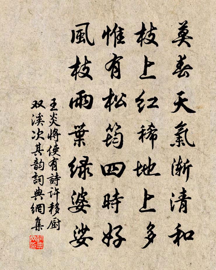 詩詞名句歷史字典書法欣賞書法字典國語詞典說文解字康熙字典古漢語字典標 題 作 者 詩 句 將使有詩許移廚雙溪次其韻作者:王炎 朝代:宋代將使有詩許移廚雙溪次其韻原文莫春天氣漸清和,枝上紅稀地上多。惟有松筠四時好,風枝雨葉綠婆娑。詩詞問答問:將使有詩許移廚雙溪次其韻的作者是誰?答:王炎問:將使有詩許移廚雙溪次其韻寫於哪個朝代?答:宋代王炎將使有詩許移廚雙溪次其韻書法欣賞將使有詩許移廚雙溪次其韻書法作品詩詞推薦滿庭芳(和洪丞相景伯韻)辛棄疾〔宋代〕傾國無媒,入宮見妒,古來顰損蛾眉。看公如月,光彩眾星稀。袖手高山流水,聽群蛙、鼓吹荒池。文章手,直須江城子翁元龍〔宋代〕一年簫鼓又疏鍾。愛東風。恨東風。吹落燈花,移在杏梢紅。玉靨翠鈿無半點,空濕透,繡羅弓。燕魂鶯夢漸惺松瀟湘神 零陵作屈大均〔清代〕瀟水長,湘水長,三湘最苦是瀟湘。無限淚痕斑竹上,幽蘭更作二妃香。曾耆英見過題贈六言四首趙蕃〔宋代〕庭空不張爵蘿,林靜可窺鳥窠。髯曾暇能過我,誦詩口若懸河。初夏山居有懷長沙從游四首趙蕃〔宋代〕日者因回使,人才致一書。有懷那再寫,為況又何如。賈傅長沙國,陶公五柳廬。文章且難進,可向友朋疏。首尾吟邵雍〔宋代〕堯夫非是愛吟詩,詩是堯夫對酒時。處世雖無一分善,行身誤有四方知。大凡觀物鬚生意,既若成章必見辭。詩者選部中作晁說之〔宋代〕白髮來遊宦,山公不我聞。邪猶在中等,政不占微分。孤淚滄溟感,微言上帝勛。何妨貧且賤,嵩嶺有高雲。泉州貢院舉梁八詠真德秀〔宋代〕萬間貢宇舊巍巍,更辟新楹廣舊規。豈為儒生決科計,要培宗社太平基。題嚴陵釣台王貞白〔唐代〕山色四時碧,溪聲七里清。嚴陵愛此景,下視漢公卿。垂釣月初上,放歌風正輕。應憐渭濱叟,匡國王論兵。贈劉藍田(一作王維詩)盧象〔唐代〕籬中犬迎吠,出屋候柴扉。歲晏輸井稅,山村人暮歸。晚田始家食,余布成我衣。對此能無事,勞君問是非。和冕仲觀試進進士黃庭堅〔宋代〕人圍廟垣重,鼓作宮漏曉。晨門傳放鑰,坌入荒庭秒。初如求木猿,稍若安巢鳥。黃爐答拜辱,月淡秋天杳。發題句陳靖〔宋代〕玉堂視草思嚴助,鈴閣談經滯馬融。仲子生日孫介〔宋代〕尋常得子要佳晨,何幸生朝在仲春。樂事沉心隨處處,仁風和氣似親親。天恩有庇容團聚,家訓無須旋卜鄰。杯酒經禁城劉復〔唐代〕日沒路且長,遊子欲涕零。荒城無人路,秋草飛寒螢。東南古丘墟,莽蒼馳郊垌。黃雲晦斷岸,枯井臨崩亭。昔人寄酬睦州晏殿丞梅堯臣〔宋代〕清潭吐明月,杳杳及吾廬。流彩滿懷袖,托情非鳥魚。朝因南澗雨,暮入北畦鋤。豈不藉余潤,況茲方飯蔬。和季弟韻二十首劉克莊〔宋代〕荒村隨分有區廛,不在花邊即水邊。甚懶安能詩詠史,已歸不復賦思玄。提壺聲好行沽酒,撲滿身災坐貯錢。揀個送孟婿植還臨川韓元吉〔宋代〕西風同泛婺江船,倒指光陰六換年。秋色又看梧葉老,離懷還對菊花前。塵埃左宦空搔首,功業青雲更著鞭,兒女偈頌四十二首釋祖先〔宋代〕不是心,不是佛,不是物。忍俊不禁,為諸人做個瞥脫。流水暗銷溪畔石,勸人除卻是非難。題梅竹圖家鉉翁〔宋代〕余家乎岷之下兮,有梅蕭蕭,有竹森森。今洎乎瀛之野兮,秋草萋萋,黃沙冥冥。有懷彼美兮在天一垠,夢不可即淮西席上醉歌盧群〔唐代〕祥瑞不在鳳凰麒麟,太平須得邊將忠臣。衛霍真誠奉主,貔虎十萬一身。江河潛注息浪,蠻貊款塞無塵。但得百寮名句推薦百里不販樵,千里不販糴。司馬遷《史記·七十列傳·貨殖列傳》 先天下之憂而憂,後天下之樂而樂范仲淹《岳陽樓記》 獨自淒涼還自遣,自製離愁。龔自珍《浪淘沙·寫夢》 龍游淺水遭蝦戲,虎落平原被犬欺。吳承恩《西遊記·第二十八回》 天街曾醉美人畔,涼枝移插烏巾。吳文英《夜飛鵲·蔡司戶席上南花》 青冥浩蕩不見底,日月照耀金銀台。李白《夢遊天姥吟留別 / 別東魯諸公》 若有知音見采,不辭遍唱陽春。晏殊《山亭柳·贈歌者》 守分安命,順時聽天。朱柏廬《朱子家訓·全文》 之子歸窮泉,重壤永幽隔。潘安《悼亡詩三首》 秋光一片,問蒼蒼桂影,其中何物?趙秉文《大江東去·用東坡先生韻》