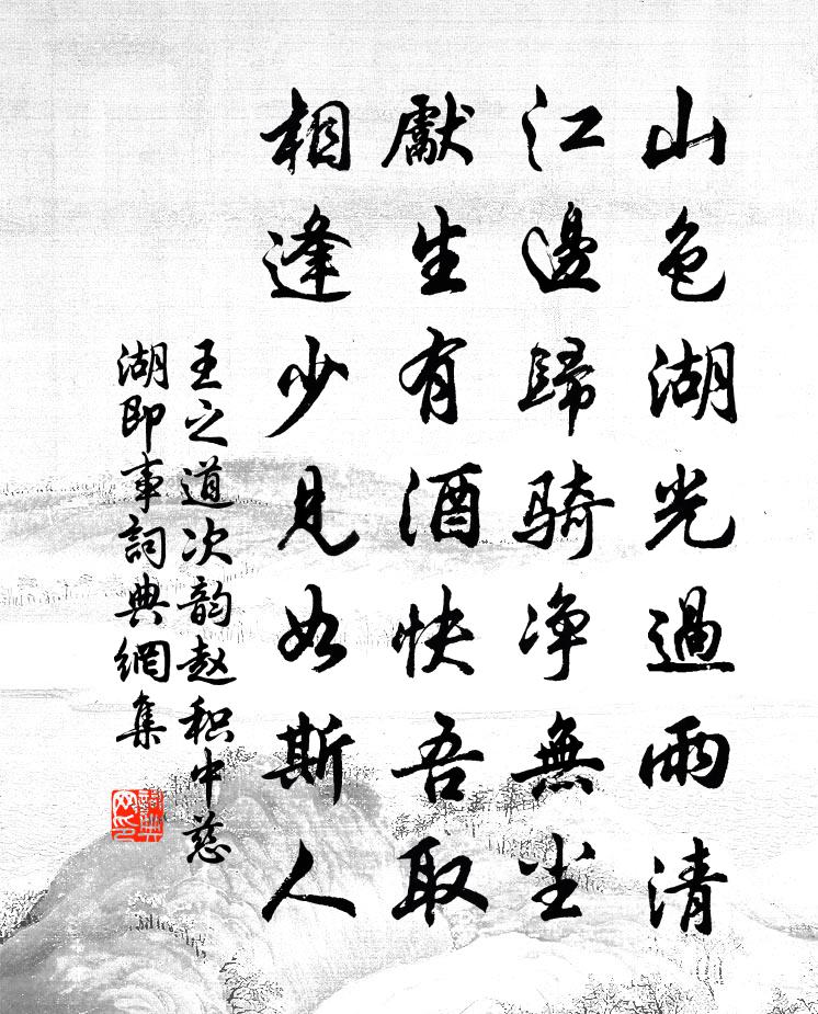詩詞名句歷史字典書法欣賞書法字典國語詞典說文解字康熙字典古漢語字典標 題 作 者 詩 句 次韻趙積中慈湖即事作者:王之道 朝代:宋代次韻趙積中慈湖即事原文山色湖光過雨清,江邊歸騎淨無塵。先生有酒快吾取,相逢少見如斯人。詩詞問答問:次韻趙積中慈湖即事的作者是誰?答:王之道問:次韻趙積中慈湖即事寫於哪個朝代?答:宋代王之道次韻趙積中慈湖即事書法欣賞次韻趙積中慈湖即事書法作品詩詞推薦八六子·倚危亭秦觀〔宋代〕倚危亭,恨如芳草,萋萋剗盡還生。念柳外青驄別後,水邊紅袂分時,愴然暗驚。無端天與娉婷。夜月一簾幽夢,吳聲子夜歌(一作崔國輔詩,題雲古意)薛奇童〔唐代〕淨掃黃金階,飛霜皓如雪。下簾彈箜篌,不忍見秋月。演雅方岳〔宋代〕蒼鷹守株待兔,白鷺臨淵羨魚。鳲鳩婦嘆於室,蝸牛亦愛吾廬。送蘇松軒路教解任陳著〔宋代〕三載多材地,一團和氣鄉。蛙池疏道脈,蓬島矗文芒。明日歸舟穩,春風驛路長。詞林是氈舊,此去足翱翔。塞下曲劉駕〔唐代〕勒兵遼水邊,風急卷旌旃。絕塞陰無草,平沙去盡天。下營看斗建,傳號信狼煙。新地書青史,當時破虜年。續漁歌/玉樓春賀鑄〔宋代〕中年多辦收身具。投老歸來無著處。四肢安穩一漁舟,祗許樵青相伴去。滄洲大勝黃塵路。萬頃月波難滓污。阿儂宣州雜詩二十首梅堯臣〔宋代〕伍員奔吳日,蒼皇及水濱。彎弓射楚使,解劍與漁人。抉目觀亡國,鞭屍失舊臣。猶為夜濤怒,來往百川頻。浪淘沙·紅影濕幽窗納蘭性德〔清代〕紅影濕幽窗,瘦盡春光。雨余花外卻斜陽。誰見薄衫低髻子,抱膝思量。莫道不淒涼,早近持觴。暗思何事斷人腸景山寺古鼎袁說友〔宋代〕小憩山前路,清談得道僧。愛渠惟一鼎,持此共三乘。製作前無古,摩挲喜不勝。茲游真可樂,著句憶弄曾。別劉孟容歲提乾二首王邁〔宋代〕吾莆諸壽雋,習靜魯靈光。有子麒麟種,群孫鴛鷺行。此行青眼眾,見謂白眉良。通籍何愁晚,庭椿樂未央。仲春過龍舒法華山尋誦經道者舊庵釋正覺〔宋代〕支逕入窮谷,來尋道者庵。梵音今默默,華雨尚毿毿。夜白月半屋,寒青燈一龕。夢隨歌吹去,借路過江南。梅花絕句陸游〔宋代〕凜凜冰霜晨,皎皎風月夜。南山有飛仙,來結尋梅社。次韻通判都官和諸公雪中席上之作強至〔宋代〕龍沙千里絕纖埃,銀色渾疑王母台。宴席此時驚酒薄,曉枝無處認梅開。騁辭梁苑客方至,乘興越溪人自來。從古臨江仙辛棄疾〔宋代〕憶醉三山芳樹下,幾層風韻忘懷。黃金顏色五花開。味如廬橘熟。貴似荔枝來。聞道商山餘四老,橘中自釀秋醅。感興李中〔唐代〕漁休渭水興周日,龍起南陽相蜀時。不遇文王與先主,經天才業擬何為!寄友生李鹹用〔唐代〕交情應不變,何事久離群。圓月思同步,寒泉憶共聞。雪霜松色在,風雨雁行分。每見人來說,窗前改舊文。送牟堯文李石〔宋代〕別久無辭道路難,沿海裘依舊據征鞍。五湖我已遭風逆,三逕君能犯雪寒。下榻莫嫌烹瓠葉,倚門正及頌椒盤。一出郭陳造〔宋代〕對花不領幾柳下,以詩自苦如東野。今年陡覺負芳時,狎興蕭條殊曩者。西湖南園怳入夢,漫道尻輪神作馬。可堪失題胡仲弓〔宋代〕成蹊雖無言,嫵媚隨東風。挺挺冰雪姿,所稟自不同。和李煽粹伯曾協〔宋代〕萬事知公一發輕,尚憐花草喚愁生。酒邊意氣來酣戰,筆下文章要主盟。絕唱共驚神有助,擅場將見敵無爭。總輸名句推薦曲闌深處重相見,勻淚偎人顫。納蘭性德《虞美人·曲闌深處重相見》 斷虹霽雨,淨秋空,山染修眉新綠。黃庭堅《念奴嬌·斷虹霽雨》 芳草年年惹恨幽。想前事悠悠。石延年《燕歸梁·春愁》 重陽佳節意休休,與客攜壺共上樓。姜塘《摘星樓九日登臨》 兩刃相割,利鈍乃知;二論相訂,是非乃見。王充《論衡·卷二十九·案書篇》 置酒望白雲,商飆起寒梧。李白《登單父陶少府半月台》 不知近水花先發,疑是經冬雪未銷。張謂《早梅》 蚊蟲遭扇打,只因嘴傷人!佚名《增廣賢文·下集》 人生無根蒂,飄如陌上塵。陶淵明《雜詩》 通則驕而偏,窮則棄而儑。荀子《荀子·不苟》