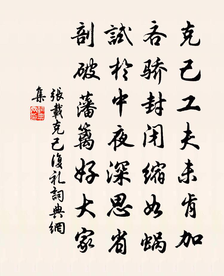 詩詞名句歷史字典書法欣賞書法字典國語詞典說文解字康熙字典古漢語字典標 題 作 者 詩 句 克己復禮作者:張載 朝代:宋代克己復禮原文克己工夫未肯加,吝驕封閉縮如蝸。試於中夜深思省,剖破藩籬好大家。詩詞問答問:克己復禮的作者是誰?答:張載問:克己復禮寫於哪個朝代?答:宋代張載克己復禮書法欣賞克己復禮書法作品詩詞推薦驀山溪仲殊〔宋代〕年芳已遠,涼夏疏疏雨。菊占此時開,背佳期、清秋何處。滴成金豆,彈破栗文圓,臨水檻,倚風亭,全勝東籬暮豫章上游江中有道觀蓋屍堅吾遊仙之地三首曾豐〔宋代〕水色月華俱受清,藏中各自有光明。夜來相遇影相射,幻我黃冠老眼睛。好事近(謝人分似蠟梅一枝)周紫芝〔宋代〕香蠟染宮黃,不屬世間風月。分我照寒金蕊,伴小窗愁絕。高標獨步本無雙,一枝為誰折。壓盡半春桃李,任滿山夏夜劉克莊〔宋代〕熱極不可度,起行林影中。開窗需過月,移簟就來風。豪鼠喧深夜,高蟬響半空。永言時物變,露已濕莎叢。頌石頭和尚草庵歌釋印肅〔宋代〕問此庵,有誰直下肯承當。不假良材並巧匠,重重帝網妙嚴莊。和遁澤雨中韻王柏〔宋代〕梅霖博得遁翁憐,磊磊詩郵忽到前。噀霧掃清塵外馬,瀑泉呼起耳中蟬。妨它種事並芒事,知是豐年或歉年。陋巷田氏南樓對月馬戴〔唐代〕主人同露坐,明月在高台。咽咽陰蟲叫,蕭蕭寒雁來。影搖疏木落,魄轉曙鍾開。倖免丹霞映,清光溢酒杯。排岸判官以荷花為貺書五十六字以謝強至〔宋代〕江國芙蕖夏最繁,臨堤每見尚盤桓。清淮況是稀疏有,江萼爭教取次看。曉艷不隨生意絕,孤根寧減舊時安。主人贈弟送山醞晁說之〔宋代〕山醞今朝熟,溪氛起正炎。醉予難酩酊,泣汝淚闌乾。題畫梅贈黃君呂徽之〔宋代〕黃君畫梅天下奇,枝枝筆底如龍飛。乾盤屈曲蒼苔古,老樹頃刻生光輝。婆娑月下弄清影,更有幽香襲詩境。地僻延真秋屏軒張叔敏〔宋代〕鳥回山色隱如城,碧落人歸依舊青。好向中間安一榻,何須更畫繞床屏。依韻和李持正晚晴出謁王子高馬上口占之作強至〔宋代〕謫仙醉跨玉鯨鱗,夷甫名談喜更聞。照眼暖光開野日,入懷晴氣散江雲。塵埃洗去人家好,空闊飛來鳥翼勤。莫望先天易吟三十首方回〔宋代〕天地囿於氣,聖賢修此心。範圍非有許,生聚尚斯今。句徐似道〔宋代〕一帶拒霜三十里,又催簫鼓作秋聲。和胡宿韻寄蔣之奇鄧忠臣〔宋代〕獨步文章妙一台,都門便欲掛冠回。已憐天上三台路,未盡人間八斗才。坐幄每聞千里勝,占雲初見四夷來。我公憶錢人塘陳郁〔宋代〕識面論心已半生,買山無計得同盟。行藏為是關天理,會聚因難遂客懷,月戶評春花影澹,風廊逃暑竹聲清。安舲早秋鄧深〔宋代〕風入題詩葉,清音已奏商。夜來堪簡冊,客至更衣裳。次第征鴻到,還令團扇藏。人情兼物意,殊覺漫炎涼。偈頌七十八首釋正覺〔宋代〕活計如今付舊人,版頭疏久又還親。星河月與長江混,渺渺清光一色勻。底時節,落功勳。臥穩須知卻轉身,轉得次平小景武衍〔宋代〕一拂殘煙暝不收,作成溪上十分秋。空林落日西風急,紅葉無詩水自流。病戒陸游〔宋代〕憂身如憂國,畏病如畏亂;此身雖幸健,敢作無事看?禍福在呼吸,恐懼兼寢飯。人所忽不省,我思嘗熟爛。夜臥名句推薦忘卻成都來十載,因君未免思量。蘇軾《臨江仙·送王緘》 秋在水清山暮蟬,洛陽樹色鳴皋煙。王昌齡《送狄宗亨》 運往無淹物,年逝覺已催。謝靈運《歲暮》 月華今夜黑,全見梨花白。楊基《菩薩蠻·水晶簾外娟娟月》 繡嶺宮前鶴髮翁,猶唱開元太平曲李洞《繡嶺宮詞》 山路元無雨,空翠濕人衣。王維《山中》 一向年光有限身,等閒離別易銷魂,酒筵歌席莫辭頻。晏殊《浣溪沙·一向年光有限身》 秋陰時晴漸向暝,變一庭淒冷周邦彥《關河令·秋陰時晴漸向暝》 奇文共欣賞,疑義相與析。陶淵明《移居二首》 龍蟠虎踞金陵郡,古來六代豪華盛。康與之《菩薩蠻令·金陵懷古》
