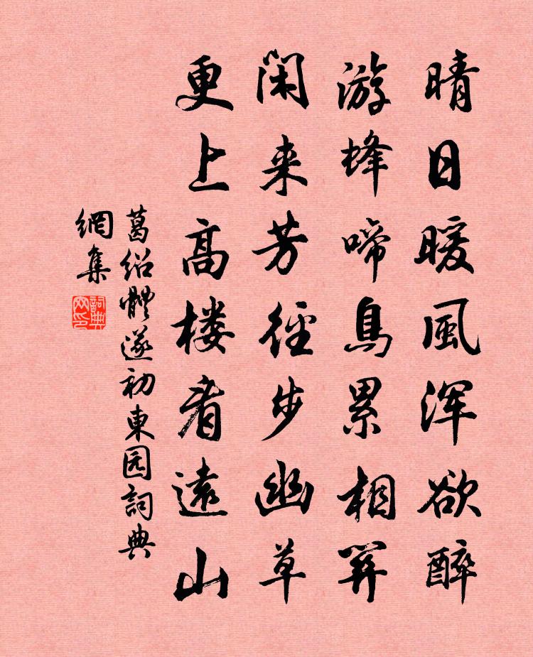 詩詞名句歷史字典書法欣賞書法字典國語詞典說文解字康熙字典古漢語字典標 題 作 者 詩 句 遂初東園作者:葛紹體 朝代:宋代遂初東園原文晴日暖風渾欲醉,游蜂啼鳥累相關。閒來芳徑步幽草,更上高樓看遠山。詩詞問答問:遂初東園的作者是誰?答:葛紹體問:遂初東園寫於哪個朝代?答:宋代葛紹體遂初東園書法欣賞遂初東園書法作品詩詞推薦奉同原甫鄆州樂郊韓維〔宋代〕詩人歌樂郊,以政不以游。太守名是地,豈非為民謀。下車布條教,惠愛春風柔。丹筆平枉訟,赭衣息奸偷。政和荷葉浦中葛天民〔宋代〕急雨捎荷分外奇,珠璣狼籍錦紛披。下塘六月關心處,西塞扁舟入手時。卻傍青蘆深處宿,還思白石去年詩。平生登漢高廟閒眺韋莊〔唐代〕獨尋仙境上高原,雲雨深藏古帝壇。天畔晚峰青簇簇,檻前春樹碧團團。參差郭外樓台小,斷續風中鼓角殘。一帶京口僧院釋尚能〔宋代〕渺漠人煙外,禪居靜趣多。山遙天接樹,江闊日生波。鳴櫓時鄰響,徵車舊絕過。清風數聲磬,應不入漁歌。計敏夫送酒四壺有詩和之二首郭印〔宋代〕何須著意苦吟詩,未動毫端萬景隨。千載騷人還把手,誰雲陶謝不同時。若耶溪蘇泂〔宋代〕歲月去悠悠,沙邊一線流。榮無嚴子釣,直有楚臣鉤。雨氣知魚樂,煙光驗鳥愁。餘年未可料,幾度此維舟。尹館作此覓酒召李順之飲陳東〔宋代〕今日天色惡,酒壺恰已空。何來進童子,挈榼問主翁。主翁正對客,兀坐書堂中。諸生功課畢,鼓瑟歌醉翁。愛酒漁父劉植〔宋代〕生不事農耕,悠然一舸輕。沅湘依舊綠,秦漢幾回更。晚膾雜香茝,夜醺歌濯纓。豈同馳騖者,只欲釣虛名。賢者之孝二百四十首蓼莪孝子林同〔宋代〕莫遂終養志,難酬罔極恩。哀哀父母句,腸斷不堪聞。夜宿宗公丈室求詩甚勤為賦五字張元乾〔宋代〕林表登層閣,秋聲隱暮鍾。雅歸苦竹寺,雨闇亂雲峰。屢乞留新句,重來訪舊蹤。松門罕車馬,似喜老夫逢。送友生游峽中李白〔唐代〕風靜楊柳垂,看花又別離。幾年同在此,今日各驅馳。峽里聞猿叫,山頭見月時。殷勤一杯酒,珍重歲寒姿。正月九日微雪二首趙蕃〔宋代〕霰雪纖纖晚倍寒,梅花清瘦不 * 。小園準擬尋詩去,少待侵苔屐齒乾。醉桃源/阮郎歸謝逸〔宋代〕晨光曉色掃檐晶。寒齋蝶夢驚。亂飄鴛瓦細無聲。游揚柳絲輕。書幌冷,竹窗明。柴門只獨扃。一尊濁酒為誰傾。獨覺蘇軾〔宋代〕瘴霧三年恬不怪,反畏北風生體疥。朝來縮頸似寒鴉,焰火生薪聊一快。紅波翻屋春風起,先生默坐春風裡。浮空南州晁公溯〔宋代〕久矣吾人愧白鷗,塵埃無路入南州。愁橫蜀嶺何年斷,夢繞吳江盡日流。病骨本無軒冕相,微官端為稻粱謀。與君送陸暢歸江南(暢娶董溪女)韓愈〔唐代〕舉舉江南子,名以能詩聞。一來取高第,官佐東宮軍。迎婦丞相府,夸映秀士群。鸞鳴桂樹間,觀者何繽紛。人事沁園春(贈錦江歌者何琮)馮取洽〔宋代〕有孤竹君,音節拂雲,謚曰洞簫。縱柳郎填就,周郎顧罷,欠伊品藻,律也難調。慚愧何郎。嗚嗚裊裊,翻入顎唇宇文袞臣吏部予在蜀日與之游至厚契闊死生二陸游〔宋代〕英姿爽氣宇邛州,雖古人中豈易求。六月長途將暍死,一天風雹起龍湫。將為枝江之行晁說之〔宋代〕北斗垂幾尺,東京路幾千。大江復幾深,臘尾難放船。豈無凋胡飯,疾病相後先。波濤日夜起,高枕相與眠。春風句郭忠恕〔宋代〕為逢末劫歸依拂,不就新恩敘理官。名句推薦明月,明月,胡笳一聲愁絕。戴叔倫《轉應曲·邊草》 對望中天地,洞然如刷。史達祖《滿江紅·中秋夜潮》 更深黃月落,夜久靨星稀。任希古《和長孫秘監七夕》 以正治國,以奇用兵,以無事取天下。老子《老子·德經·第五十七章》 相逢成夜宿,隴月向人圓。杜甫《宿贊公房》 安得千尋橫鐵鎖,截斷煙津。陸游《浪淘沙·丹陽浮玉亭席上作》 輕淘起,香生玉塵,雪濺紫甌圓。米芾《滿庭芳·詠茶》 方以類聚,物以群分佚名《易傳·繫辭傳上·第一章》 三年遇寒食,盡在洛陽城。白居易《洛橋寒食日作十韻》 風吹柳花滿店香,吳姬壓酒喚客嘗。李白《金陵酒肆留別》