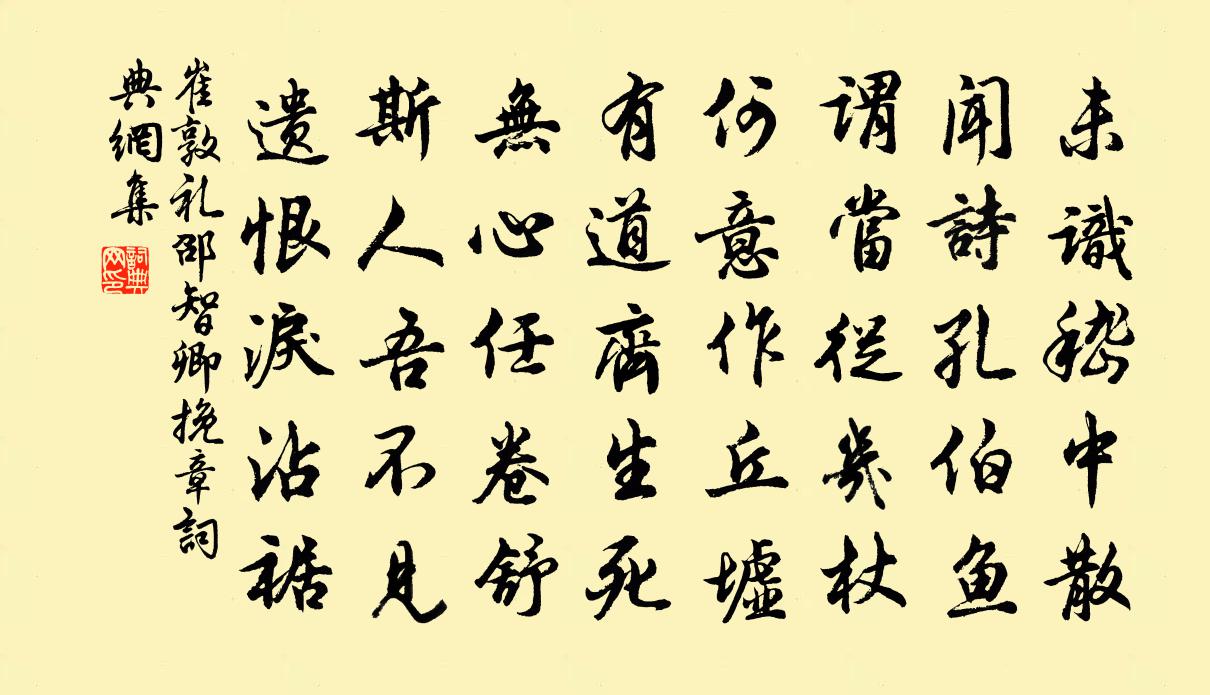 詩詞名句歷史字典書法欣賞書法字典國語詞典說文解字康熙字典古漢語字典標 題 作 者 詩 句 邵智卿挽章作者:崔敦禮 朝代:宋代邵智卿挽章原文未識嵇中散,聞詩孔伯魚。謂當從几杖,何意作丘墟。有道齊生死,無心任卷舒。斯人吾不見,遺恨淚沾裾。詩詞問答問:邵智卿挽章的作者是誰?答:崔敦禮問:邵智卿挽章寫於哪個朝代?答:宋代崔敦禮邵智卿挽章書法欣賞邵智卿挽章書法作品詩詞推薦偈頌二十二首釋道生〔宋代〕衲僧門下,三月一結。把斷要津,聖凡路絕。一夜檐頭雨滴聲,把真機俱漏世,切忌守著系驢橛。一鶚曾鞏〔宋代〕北風萬里開蓬蒿,山水洶洶鳴波濤。嘗聞一鶚今始見,眼駛骨緊精神豪。天昏雪密飛轉疾,暮略東海朝臨洮。社中送胡澳下第歸蒲津薛能〔唐代〕無媒甘下飛,君子尚 * 。歲月終榮在,家園近且歸。山光臨舜廟,河氣隔王畿。甚積湯原思,青青宿麥肥。元衡過邢園同廣聲終日坐於習堂梅樹之下得長趙蕃〔宋代〕一聞茅屋數株梅,三徑頻成為我開。剩有游蜂能掠蕊,寂無飢雀下行苔。長吟共惜頻驚落,久坐何妨晚始回。為語雪中懷成都陸游〔宋代〕憶在西州遇雪時,繡筵處處百花圍。烏絲闌展新詩就,油壁車迎小獵歸。感事鏡鸞悲獨舞,寄書箏雁恨慵飛。愁多玉樓春劉辰翁〔宋代〕相失霜風不動睛明好。探梅有約城東道。橋邊失卻老仙期,城門落日人歸早。野田一望迷芳草。除是騰空君後到。窗日黃庭堅〔宋代〕嘆息西窗過隙駒,微陽初至日光舒。□□□長宮中線,添得思堂一卷書。讀史趙文〔宋代〕夾寨功名節節奇,門高事起更堪悲。身亡家破英雄笑,恰似伶官戲罷時。偈十首釋道行〔宋代〕狗子佛性無,韶石不相碚。為君重決破,秋至雁銜蘆。梅花五首劉克莊〔宋代〕籬邊屋角立多時,試為騷人拾棄遺。不信西湖高士死,梅花寂寞便無詩。蘇武慢凌雲翰〔元代〕智不如愚,辯何如訥,大巧又何如拙。螳黠蟬痴,鶴長鳧短,總是一番消歇。逝者如斯,撓之不濁,止水本來明澈山居雜詩九十首曹勛〔宋代〕堂堂春將去,好花如款留。荼醾蔓層雪,芍藥欹重樓。金沙插架富,蕙香轉林幽。我欲助送之,飛絮漫天愁。寄姚司馬張說〔唐代〕共君春種瓜,本期清夏暑。瓜成人已去,失望將誰語。裛露摘香園,感味懷心許。偶逢西風便,因之寄鄂渚。憶舍弟王翥〔宋代〕藥物吾仍病,花時汝未歸。不眠愁月落,獨立看雲飛。詩禮自持律,饑寒誰解圍。遙知理舟楫,西望涕沾衣。挽呂東萊先生宋天則〔宋代〕含孕天資粹,稽參學力深。躬純君子行,道會聖人心。形見溫於玉,持存勁愈金。斯文方有賴,蚤作遽聞音。和座主尚書春日郊居吳融〔唐代〕海燕初歸朔雁回,靜眠深掩百花台。春蔬已為高僧掇,臘醞還因熟客開。檐外暖絲兼絮墮,檻前輕浪帶鷗來。謝公遊仙謠曹勛〔宋代〕羽蓋承流景,飆輪泛紫霞。前旌絳霄隊,駐節王母家。真童發清謠,雲表翔哀笳。樓台上清漢,服彩明朱華。萬春再次韻四首陳造〔宋代〕作吏丁年熟李書,調官晚境曳鄒裾。平時外慕生災怪,嘉遁爻中有祓除。句江公亮〔宋代〕好是道人岩邊月,夜深清照飲牛溪。劉植徐鈞〔宋代〕匹夫愛國獻昌城,力說劉揚十萬兵。顛沛腳踏車良得助,邯鄲假意不難平。名句推薦尋思不似鵲橋人,猶自得、一年一度。趙以夫《鵲橋仙·富沙七夕為友人賦》 菡萏香銷翠葉殘,西風愁起綠波間。李璟《攤破浣溪沙·菡萏香銷翠葉殘》 螣蛇無足而飛,梧鼠五技而窮。荀子《荀子·勸學》 別裁偽體親風雅,轉益多師是汝師。杜甫《戲為六絕句》 提籠忘采葉,昨夜夢漁陽。張仲素《春閨思》 對菊難逢元亮酒,登樓愧乏仲宣才。秋瑾《九日感賦》 雨里雞鳴一兩家,竹溪村路板橋斜。王建《雨過山村》 花似伊。柳似伊。花柳青春人別離。歐陽修《長相思·花似伊》 夢回芳草思依依,天遠雁聲稀。李煜《喜遷鶯·曉月墜》 與君別。相思一夜梅花發。房舜卿《憶秦娥·與君別》