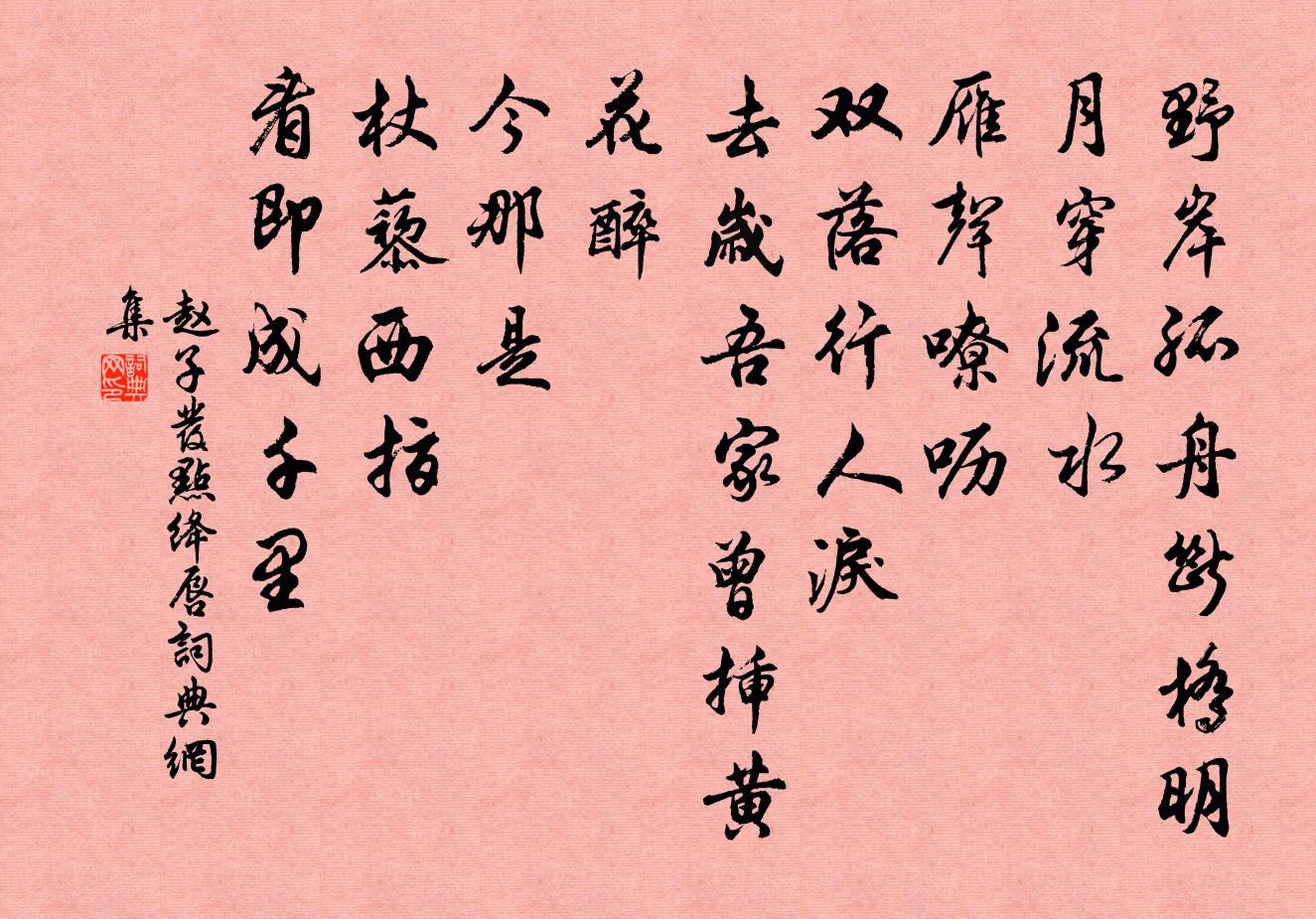 詩詞名句歷史字典書法欣賞書法字典國語詞典說文解字康熙字典古漢語字典標 題 作 者 詩 句 點絳唇作者:趙子發 朝代:宋代點絳唇原文野岸孤舟,斷橋明月穿流水。雁聲嘹嚦。雙落行人淚。去歲吾家,曾插黃花醉。今那是。杖藜西指。看即成千里。詩詞問答問:點絳唇的作者是誰?答:趙子發問:點絳唇寫於哪個朝代?答:宋代問:點絳唇是什麼體裁?答:詞趙子發點絳唇書法欣賞點絳唇書法作品詩詞推薦蘭州莊嚴寺譚嗣同〔清代〕訪僧入孤寺,一徑蒼苔深。寒磬秋花落,承塵破紙吟。潭光澄夕照,松翠下庭蔭。不盡古時意,蕭蕭雅滿林。更漏子·秋張淑芳〔宋代〕墨痕香,紅蠟淚。點點愁人離思。桐葉落,蓼花殘。雁聲天外寒。五雲嶺,九溪塢。待到秋來更苦。風淅淅,水淙寄隱靜山懷賢長老梅堯臣〔宋代〕山有枇杷樹,樹多獼猴群。高僧心不著,一似五峰雲。隨飈來溪口,石上起氤氳。果熟獼猴去,自向瀑澗分。縱筆陸游〔宋代〕冉冉殘年迫耄期,肱雖三折未成醫。北山愚公世方笑,東郭順子吾所師。萬里元非破賊手,一生無奈造物兒。梅雨清平樂佚名〔宋代〕風雙鸞偶。天上人間有。檐玉無聲花影瘦。夜淺春濃時候。別來幾度寒宵。六橋風月迢迢。燈下有誰相伴,一紅濕錦香囊歐陽修〔宋代〕一寸相思無著處。甚夜長難度。燈花前、幾轉寒更,桐葉上、數聲秋雨。真箇此心終難負。況少年情緒。已交共、禪人並化主寫真求贊釋正覺〔宋代〕髮際點白,眼眶含青。情枯歷歷,智照靈靈。形骸如槁木,蹤跡肖流萍。月明四海犀通暈,春在百華蜂採馨。梅花絕句陸游〔宋代〕當年走馬錦城西,曾為梅花醉似泥。二十里中香不斷,青羊宮到浣花溪。游峨眉十一首馮時行〔宋代〕絕嶺人人到,空回亦大誇。至人觀實相,凡眼眩空花。有障猶隨牒,無心已出家。普賢吾日月,歸屐候晴霞。題純陽洞蒲壽宬〔宋代〕道士當年九日山,側身西望翠雲間。一枝乞倚純陽洞,萬仞崔嵬不可攀。踏莎行(賦木犀)辛棄疾〔宋代〕弄影闌乾,吹香岩谷。枝枝點點黃金粟。未堪收拾付薰爐,窗前且把離騷讀。奴僕葵花,兒曹金菊。一秋風露清涼無俗念 歲寒守志丘處機〔元代〕同雲瑞雪,正三冬、*閉嚴凝時節。寂寞山家孤悄悄,終日無人談說。敗衲重披,寒*獨坐,夜永愁難徹。長更無和原甫曉雨韓維〔宋代〕喜雨濯炎夜,餘飛入晨光。起來坐軒戶,北風吹我裳。碧折萱葉亂,翠添林筍長。翩翩庭中燕,群飛戲清涼。直恐酴醿滕岑〔宋代〕紅紫從渠巧斗新,不妨自著素衣巾。中庭今夜群仙戲,總是廣寒宮裡人。次韻胡明仲見寄二首朱翌〔宋代〕柳州非國語,意恐亂詩書。去草絕根本,立言推緒餘。斷疑先近似,反己問何如。歲晚飄零甚,歸歟指敝廬。送樊眉州李流謙〔宋代〕我先君子官於涪,一時賢僚今在不。唯公直節貫華皓,千尺壽檜橫霜秋。丈人靜聽請具陳,平生契義嘣肉侔。簡池別王監鎮董嗣杲〔宋代〕僑寄荒津厭鼓鼙,逆行遣日守羈棲。天兵未卜何時解,心事難侔此日齊。雨醉田家無屐借,春眠野寺有詩題。蒲帆二月二十一日東園桃李未開有感二首張耒〔宋代〕寄語玄都觀里花,饒君繁麗奪朝霞。劉郎想到長安日,葵麥風前一嘆嗟。送裴宣城上元所居李嘉祐〔唐代〕水流過海稀,爾去換春衣。淚向檳榔盡,身隨鴻雁歸。草思晴後發,花怨雨中飛。想到金陵渚,酣歌對落暉。贊三十六祖頌釋印肅〔宋代〕直截猛利,立雪斷臂。千古萬古,丈夫意氣。名句推薦紅樓隔雨相望冷,珠箔飄燈獨自歸。李商隱《春雨》 綠雲擾擾,梳曉鬟也;杜牧《阿房宮賦》 秋風吹到江村,正黃昏,寂寞梧桐夜雨不開門。顧彩《相見歡·秋風吹到江村》 人言落日是天涯,望極天涯不見家。李覯《鄉思》 湘淚淺深滋竹色,楚歌重疊怨蘭叢。李商隱《潭州》 金槳木蘭船,戲采江南蓮。劉孝威《採蓮曲·金槳木蘭船》 人生在世不稱意,明朝散發弄扁舟。李白《宣州謝朓樓餞別校書叔雲》 君子之心事,天青日白,不可使人不知洪應明《菜根譚·概論》 山川蕭條極邊土,胡騎憑陵雜風雨。高適《燕歌行》 東風惡,歡情薄。陸游《釵頭鳳·紅酥手》