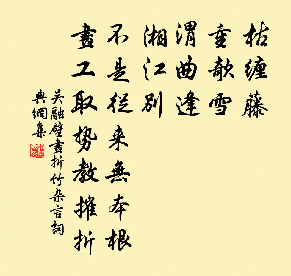 詩詞名句歷史字典書法欣賞書法字典國語詞典說文解字康熙字典古漢語字典標 題 作 者 詩 句 壁畫折竹雜言作者:吳融 朝代:唐代壁畫折竹雜言原文枯纏藤,重欹雪。渭曲逢,湘江別。不是從來無本根,畫工取勢教摧折。詩詞問答問:壁畫折竹雜言的作者是誰?答:吳融問:壁畫折竹雜言寫於哪個朝代?答:唐代問:壁畫折竹雜言是什麼體裁?答:雜言吳融壁畫折竹雜言書法欣賞壁畫折竹雜言書法作品注釋全唐詩:卷687-51詩詞推薦太常引 為萬奴總管壽王惲〔元代〕重於山嶽藹如蘭。喜一旦,得同官。裁*笑談間。道不似、當年將壇。一年好處,中秋節近,涼露洗金盤。丹桂月秋懷林逋〔宋代〕霏霏煙雨拂西窗,緗帙披殘臥縹缸。林木細分山去削,水波微動鶴丁樁。涼沈欲睡何妨縱,靜壯詩魔未易降。搔首送何同叔赴湖南漕彭龜年〔宋代〕疇昔書登賢書,夫書子持文衡書。每見輒忽別,問端不能更。一從齒周行,後先佐司成。未幾奉辟書,復接台中評漢宮春(芍藥)陳允平〔宋代〕開盡荼蘼,正桑雲麥浪,天氣如秋。南園露梢半坼,金粟絲頭。溫香傍酒,盡多嬌、不識春愁。鶯院悄,輕陰弄晚烏夜啼(八之一)陸游〔宋代〕金鴨余香尚暖,綠窗斜日偏明。蘭膏香染雲鬟膩,釵墜滑無聲。冷落鞦韆伴侶,闌珊打馬心情。繡屏驚斷瀟湘夢,題洪使君詩卷劉克莊〔宋代〕刻於芹泮士爭披,傳到茅廬我竊窺。突過韋郎森戟句,高如柳惲采苹詩。日惟坐嘯熏沉水,間亦搖毫品荔支。況有題汪季路太丞魏野草堂圖二首楊萬里〔宋代〕汾陰西祀告昇平,四海無波鏡樣清。乞與幽人好風月,萬山里許聽泉聲。送端叔游淮趙汝鐩〔宋代〕堂堂玉立須垂腹,談論逢人見肺肝。手弄七弦琴韻古,腰橫三尺劍光寒。但將計策尋知已,肯學閭閻為覓官。烏幕問天方逢辰〔宋代〕胭脂十二萬風塵,一樣胞胎父母身。天欲殺之胡至此,厥初何用降生民。題齊山翠微亭喻良能〔宋代〕山深雲氣多,撥雲尋逕入。但覺襟袖寒,不知濃翠濕。高士詠壺丘子吳筠〔唐代〕壺丘道為量,玄虛固難知。季鹹曜淺術,禦寇初深疑。至人忘禍福,感變靡定期。太沖杳無朕,元化誰能知。百年舒岳祥〔宋代〕流水故人盡,荒村落葉多。空餘老矍鑠,全是病維摩。齒落不知味,眼花應有魔。百年聊爾爾,千載欲如何。執劍呂洞賓贊釋慧開〔宋代〕露刃單提,行殺活令。斬食嗔痴,群魔乞命。夫是之謂,純陽真人。激濁揚清,摧邪顯正。端午上饒道中裘萬頃〔宋代〕一春留滯在京華,午日依前未到家。細葛香蘿素無望,黃塵烏帽亦堪嗟。爭舟野渡人如簇,立馬郵亭日欲斜。遙想山水圖唐寅〔明代〕淡霧滃山腰,清風集樹梢。聽泉人習靜,佇立面平橋。頤齋聯日有事於琛亭賦詩聊為解嘲胡仲弓〔宋代〕詩人有公事,日日走琛亭。紫翠和衣重,香塵滿面生。蚌還江月濕,龍起浪雲腥。薏苡亦何有,奚囊澈底清。題禁中黃石榴二首曹勛〔宋代〕榴花昔染猩猩血,檐卜叢中今斗新。何事司花與純素,不同妖艷污天真。武陵春(正月七日,武都雪霽立春)毛滂〔宋代〕春在前村梅雪裡,一夜到千門。玉佩瓊琚下冷雲。銀界見東君。桃花髻暖雙飛燕,金字巧宜春。寂寞溪橋柳弄晴。禱雨李石〔宋代〕吾家何必自耕耘,淮上新添戰馬群。聖水洑流天漢永,顛風扇雪地爐焚。但教東海無冤氣,便可西郊放密雲。浪遣和育王十二題晉年松李覯〔宋代〕典午既陵夷,群材共淪謝。唯有青青松,於今被王化。名句推薦野竹交淇水,秋瓜蔓帝邱。司馬光《送雲卿知衛州》 休言萬事轉頭空,未轉頭時皆夢。蘇軾《西江月·平山堂》 阿香秋夢起嬌啼,玉女傳幽素。吳文英《燭影搖紅·越上霖雨應禱》 父老得書知我在,小軒臨水為君開。蘇軾《送賈訥倅眉》 信言不美,美言不信。老子《老子·德經·第八十一章》 上窮碧落下黃泉,兩處茫茫皆不見。白居易《長恨歌》 運往無淹物,年逝覺已催。謝靈運《歲暮》 執古之道,以御今之有。老子《老子·道經·第十四章》 知我者,謂我心憂;不知我者,謂我何求。佚名《黍離》 細雨夢回雞塞遠,小樓吹徹玉笙寒。李璟《攤破浣溪沙·菡萏香銷翠葉殘》