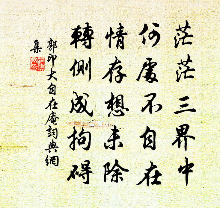 詩詞名句歷史字典書法欣賞書法字典國語詞典說文解字康熙字典古漢語字典標 題 作 者 詩 句 大自在庵作者:郭印 朝代:宋代大自在庵原文茫茫三界中,何處不自在。情存想未除,轉側成拘礙。詩詞問答問:大自在庵的作者是誰?答:郭印問:大自在庵寫於哪個朝代?答:宋代郭印大自在庵書法欣賞大自在庵書法作品詩詞推薦閒詠釋智圓〔宋代〕造化無餘豈有私,如何庶物自參差。群烏不涅身長黑,雙鷺無愁頂亦絲。岩桂翠濃深雪夜,井桐黃落暮秋時。虛空讀何斯舉黃州秋居雜詠次其韻陸游〔宋代〕全家寄舴艋,結茅非始謀,江市得煙蓑,不博千金裘。道散俗日薄,老聃出衰周。治身去健羨,如稼必去蟊。吾身杜詩晁說之〔宋代〕古人愁在吾愁里,庾信江淹可共論。孰似少陵能嘆息,一身牢落識乾坤。楊仲仁為梅返魂有詩因次其韻胡仲弓〔宋代〕謝娥羌管徒浪說,東君造化何容私。更得孤根有所託,終有結果調羹時。送曾阿宜往戍吳潛〔宋代〕幾年西戍暫歸田,又向澄江買去船。劍閣山巒雄蔽日,昆明池水闊浮天。故園此際同明月,蠻域明朝隔瘴煙。此去悼阿駒七首劉克莊〔宋代〕長兄開卷每隨聲,大母繙經亦諦聽。眉目分明無夭法,恐緣了了與惺惺。夏日閒書墨君堂壁二首文同〔宋代〕歸來帶山中住,帶便作山中帶人。冠帶亦自帶閒,累月不首身。散發層岩阿,濯足清澗濱。石蘚黏簡冊,松風墮衣問信紅梅二章舒岳祥〔宋代〕凍白千林須雪重,暖紅一點著春多。啞驢瘦策平皋去,如此風流奈老何。次韻蘇伯固主簿重九蘇軾〔宋代〕雲間朱袖拂雲和,知是長松掛發蘿。髻重不嫌 * 滿,手香新喜綠橙搓。墨翻衫袖吾方醉,紙落雲煙子患多。只有上巳日與客游張園韓元吉〔宋代〕簿書有餘閒,春日亦已永。況逢佳節休,朱墨得暫屏。名園跨江郊,危檻俯千頃。平蕪雨初勻,弱柳風自整。芳尋初到高郵晁說之〔宋代〕避難蒼黃處處過,扁舟不復怯風波。禹功淮海施偏少,漢業東南得最多。幾日兵強令虜退,今年米賤奈予何。孫公和用明梅十三絕胡寅〔宋代〕醉把天葩嚼蕊香,筆端翻水趁詩狂。結成卻薦和羹鼎,妙手先從錡釜湘。和王主簿陳宓〔宋代〕朅來十日佳眠食,為愛溪山似客清。我亦本無三宿戀,中年可奈故人情。平甫如通州寄之王安石〔宋代〕北山搖落水崢嶸,想見揚帆出廣陵。平世自無憂國事,求田應不忤陳登。自吳岳歸李復〔宋代〕鳴鳳岡邊路,秋風動夕嵐。閒雲依絕壁,獨鳥下空潭。疇昔經行慣,重來委曲諳。試尋遺墨在,投策訪僧龕。聖號雅二篇趙湘〔唐代〕皇道磨徹,載昭載晰。克彼有截,萬國是悅。皇矣聖朝,綿爾瓜瓞。是崇是潔,萬世貽厥。紅窗迥曹豳〔宋代〕春闈期近也,望帝鄉迢迢,猶在天際。懊恨這一雙腳底。一日廝趕上五六十里。爭氣。扶持我去,轉得官歸,恁時山中陳普〔宋代〕便是人間一洞天,墮樵煮茗書騰煙。深春筍蕨千鍾祿,落日漁樵三島仙。一脈甘泉生白石,數竿修竹對青氈。天關謝人惠竹蠅拂齊己〔唐代〕妙刮筠篁制,纖柔玉柄同。拂蠅聲滿室,指月影搖空。敢舍經行外,常將宴坐中。揮談一無取,千萬愧生公。即事汪炎昶〔宋代〕豪右方懷事,疲贏豈易禁。力田逢屢歉,禱雨得微陰。氣運寧無復,天噗匪獨今。居然懷抱惡,滿耳是呻吟。名句推薦明月皎皎照我床,星漢西流夜未央。曹丕《燕歌行二首·其一》 秋色到空閨,夜掃梧桐葉。夏完淳《卜運算元·秋色到空閨》 斜陽照墟落,窮巷牛羊歸。王維《渭川田家》 那堪好風景,獨上洛陽橋。李益《上洛橋》 天門中斷楚江開,碧水東流至此回。李白《望天門山》 中秋月。月到中秋偏皎潔。徐有貞《中秋月·中秋月》 洞庭一夜無窮雁,不待天明盡北飛。李益《春夜聞笛》 擬把傷離情緒,待曉寒重說。納蘭性德《好事近·簾外五更風》 舊相思、偏供閒晝。吳文英《夜遊宮·春語鶯迷翠柳》 夫兵權者,是三軍之司命,主將之威勢。諸葛亮《將苑·卷一·兵權》