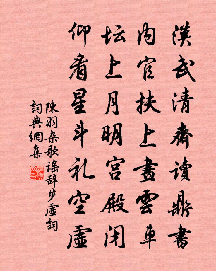 詩詞名句歷史字典書法欣賞書法字典國語詞典說文解字康熙字典古漢語字典標 題 作 者 詩 句 雜歌謠辭步虛詞作者:陳羽 朝代:唐代雜歌謠辭步虛詞原文漢武清齋讀鼎書,內官扶上畫雲車。壇上月明宮殿閉,仰看星斗禮空虛。詩詞問答問:雜歌謠辭步虛詞的作者是誰?答:陳羽問:雜歌謠辭步虛詞寫於哪個朝代?答:唐代問:雜歌謠辭步虛詞是什麼體裁?答:樂府陳羽雜歌謠辭步虛詞書法欣賞雜歌謠辭步虛詞書法作品注釋全唐詩:卷29_50詩詞推薦題大雲倉達觀台二首黃庭堅〔宋代〕瘦藤拄到風煙上,乞與遊人眼豁開。不知眼界闊多少,白鳥飛盡青天回。歲晚感懷陸游〔宋代〕利名爭奪兩皆非,生世寧殊露易曦。老冉冉來誰獨免,冢累累處會同歸。聽歌莫惜終三疊,縱獵何妨更一圍。醉臥笑卿卿詞施肩吾〔唐代〕笑向卿卿道,耽書夜夜多。出來看玉兔,又欲過銀河。清平樂 夜宿奉先,與宗人明道談天壇勝游,元好問〔金代〕中元日,藏金華丹經於天壇石室。中興亂後人得之,字畫如洛神賦,縑素亦不爛壞。予於山陽一相識家嘗見之丹書十日徐璣〔宋代〕十日清溪路,新春細雨天。綠波隨棹起,白鳥望舟眠。麥秀初如草,雲濃半是煙。明朝可遵陸,還憶此江邊。句吳仁璧〔唐代〕為惜苔錢妨換砌,因憐山色旋開尊。高閣煙霞禪客睡,滿城塵土世人忙。五龍金角向星斗,三洞玉音愁鬼神。蒲草再用喜雪韻陳傅良〔宋代〕瘴雨蠻煙此後稀,山童亦與借餘輝。爭看狂穉相呼喚,下吸飢鳥自匹妃。苦乏貂裘堪夜永,喜無蝝子著冬飢。興來宮詞楊皇后〔宋代〕元宵時雨賞宮梅,恭請光堯壽聖來。醉裹君王扶上替,鑾輿半仗點燈回。呈徐仲車張耒〔宋代〕朝日照高檐,夜霜猶在瓦。纖纖牆邊柳,春色已可把。殘年能幾何,奔駛刻湍瀉。雖無功名求,衰暮亦悲咤出門問移頓六韻乾隆〔清代〕逐水頻移頓,曾無廿里賒,建營今似昨,取勢正還斜。壘或多因舊,灶無須更加,賣蒸原有市,換馬要增茶。內外予久客思歸以秋光都似宦情薄山色不如歸意濃仇遠〔宋代〕人寄天地間,官爵寄所寄。所寄本儻來,得喪亦常事。何哉淺丈夫,以此芥胸次。達人視為輕,譬彼摴蒲戲。役滿領客賞梅吳芾〔宋代〕只擬花開把酒杯,南枝忽遞暗香來。徑須領客同清賞,莫待城頭吹落梅。與曾季衡冥會詩王麗真〔唐代〕五原分袂真吳越,燕拆鶯離芳草歇。年少煙花處處春,北邙空恨清秋月。莎草青青雁欲歸,玉腮珠淚灑臨岐。雲鬟素梅 三九王冕〔元代〕瘦夷一枝橫照水,疏花點點耐清寒。雪晴月白孤山下,幾度清香拄杖看。別三子陳師道〔宋代〕夫婦死同穴,父子貧賤離。天下寧有此?昔聞今見之!母前三子後,熟視不得追。嗟乎胡不仁,使我至於斯!有女題溪橋雪月圖陳造〔宋代〕雪野無人訪夜闌,冰壺絕景畫中看。橋邊覺欠梅枝在,姑射嫦娥各耐寒。贖雞白居易〔唐代〕清晨臨江望,水禽正喧繁。鳧雁與鷗鷺,游揚戲朝暾。適有鬻雞者,挈之來遠村。飛鳴彼何樂,窘束此何冤。喔喔雲際峽中劉學箕〔宋代〕野渡煙迷谷,寒潭水漲沙。入雲千萬岫,出塢兩三家。潤古泉仍石,山空菊自花。柳塘冰欲結,相對祗棲鴉。同主簿過翠眉亭虞儔〔宋代〕墨綬低回嘆陸沉,好山渾作翠眉顰。我聊爾耳寧違俗,仕有時乎亦為貧。老去催科非所學,向來凋瘵愧斯民。整襟念奴嬌元好問〔金代〕一年好處,是西風、鄉出東籬寒菊。蝶舞蜂狂誰便道,今夕清香不足。令尹風流,年年春事,小雨一犁新綠。園扉名句推薦還將兩行淚,遙寄海西頭。孟浩然《宿桐廬江寄廣陵舊遊》 客子光陰詩卷里,杏花訊息雨聲中。陳與義《懷天經智老因訪之》 高山安可仰,徒此揖清芬李白《贈孟浩然》 夜雪初霽,薺麥彌望。姜夔《揚州慢·淮左名都》 知屋漏者在宇下,知政失者在草野。王充《論衡·卷二十八·書解篇》 村喜禾花實,峰看嶺岫重。趙汝愚《雨後送李將軍還祠偕同寅飲一杯亭》 可譽而不譽,非仁也。墨子《墨子·46章 耕柱》 桃李春風一杯酒,江湖夜雨十年燈。黃庭堅《寄黃幾復》 目妄視則淫,耳妄聽則惑,口妄言則亂。劉安及其門客《淮南子·主術訓》 曉看天色暮看雲,行也思君,坐也思君。唐寅《一剪梅·雨打梨花深閉門》