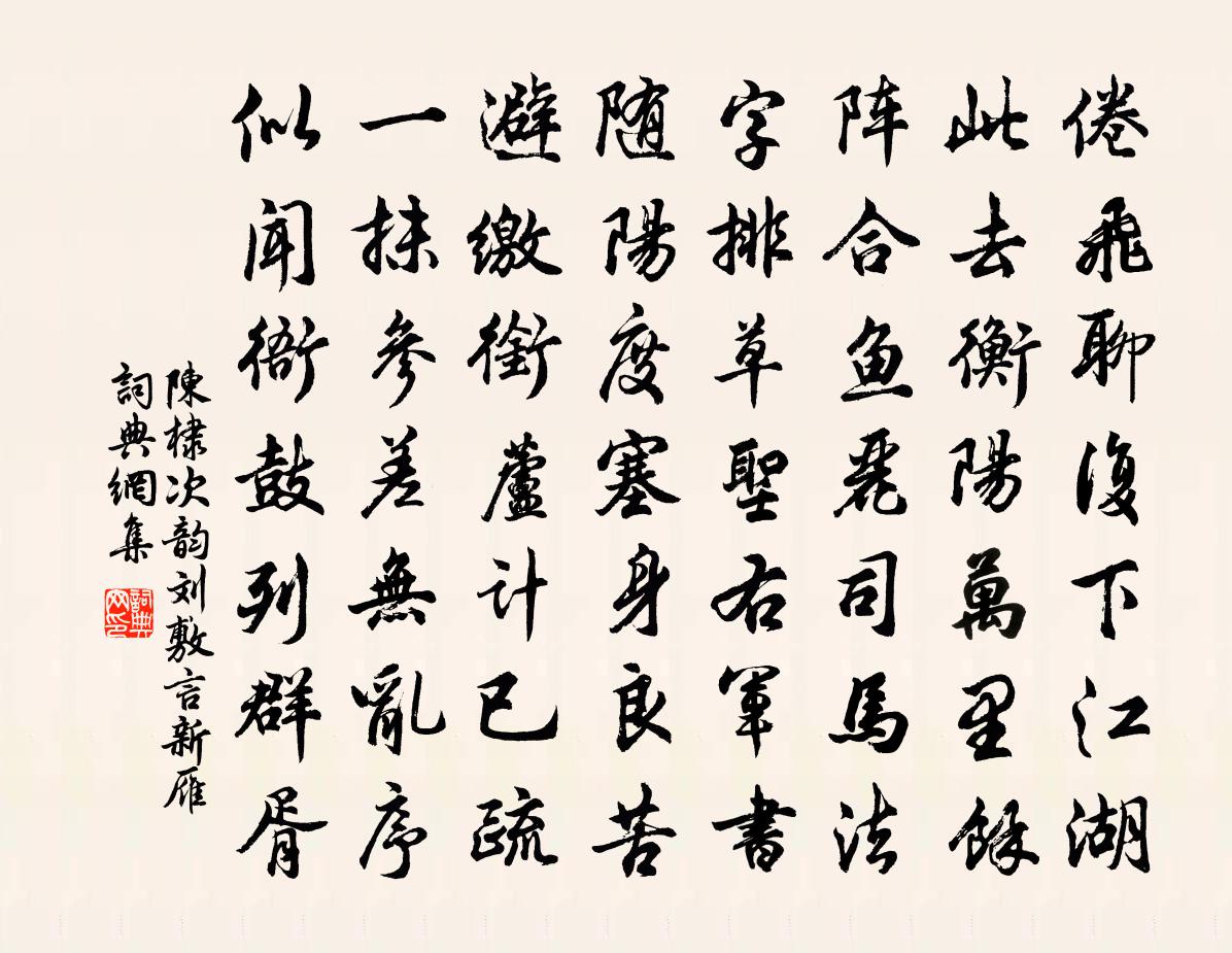 詩詞名句歷史字典書法欣賞書法字典國語詞典說文解字康熙字典古漢語字典標 題 作 者 詩 句 次韻劉敷言新雁作者:陳棣 朝代:宋代次韻劉敷言新雁原文倦飛聊復下江湖,此去衡陽萬里余。陣合魚麗司馬法,字排草聖右軍書。隨陽度塞身良苦,避繳銜蘆計已疏。一抹參差無亂序,似聞衙鼓列群胥。詩詞問答問:次韻劉敷言新雁的作者是誰?答:陳棣問:次韻劉敷言新雁寫於哪個朝代?答:宋代陳棣次韻劉敷言新雁書法欣賞次韻劉敷言新雁書法作品詩詞推薦木蘭花慢 壽劉邢公蒲道源〔元代〕八旬今又八,說尚齒,更誰尊。況賜號司徒,跋封大國,榮及生存。白麻制詞新寵,算一家、四世被皇恩。七十兒定花阻風五首李曾伯〔宋代〕準擬新煙定到家,可憐漂泊對風沙。見他紅雨飛籬落,憶殺小園桃杏花。高宗皇帝輓詞四首程大昌〔宋代〕智超黃屋表,不以位為怡。罷省齋居事,安持壽殿卮。尊榮天子父,巍煥聖王師。盛德幾無古,惟堯始濟茲。送元遂上人歸吳中許棠〔唐代〕落髮在王畿,承恩著紫衣。印心誰受請,講疏自攜歸。泛浦龍驚錫,禪雲虎繞扉。吳中知久別,庵樹想成圍。新秋即事王禹偁〔宋代〕露莎煙竹冷淒淒,秋吹無端入客衣。監里鬢毛衰颯盡,日邊京國信音稀。虱蟬歷歷和枝響,雨燕差差掠地飛。系滯又次韻二首陳著〔宋代〕賦詩誰復待沈香,澒洞乾坤走險忙。寂寂春光傷感處,瘦來不是沈東陽。慈恩寺東樓曹松〔唐代〕寺樓涼出竹,非與曲江賒。野火流穿苑,秦山疊入巴。風梢離眾葉,岸角積虛沙。此地鐘聲近,令人思未涯。頌古二十一首釋鼎需〔宋代〕鳥窠佛法無多子,只在襤襂一布毛。一氣吹來何處去,至今天下有譊訛。丫頭岩方岳〔宋代〕君不見新寺磯,女兒浦,小姑嫁與彭郎去。天開地辟本何心,以邪見我成疑誤。風煙高並雙丫石,舊已知名今始識春夜陸游〔宋代〕客向燈前老,愁從枕上生。雨聲添好睡,花氣散餘酲。舊事談誰聽,新詩鏈不成。惟當速歸老,鄰父待同耕。次韻蘇必強見寄李新〔宋代〕不積暗室鬼揶揄,曾入魚鳧伴蠹書。分背雁音清漢遠,動簾風竹故人疏。小桃煙老三年樹,白馬原空百兩車。消去破字令佚名〔宋代〕縹緲三山島。十萬歲、方分昏曉。春風開遍碧桃花,為東君一笑。祥飆暫引香塵到。祝高齡、後天難老。瑞煙散碧採桑子(冬至日,與許乾譽、章幾道飯積善。晚歸雪作,因留小飲作)葉夢得〔宋代〕山蹊小路歸來晚,暮雪繽紛。尊酒殷勤。邂逅相從只有君。全家住處無人到,元在重雲。此景誰分。萬玉參差更作次韻子云歸興韓元吉〔宋代〕湖海週遊未卜居,好山時一夢衡廬。苦無事業堪調鼎,薄有生涯可負鋤。玩世阮公方蠟屐,歸田陶令亦巾車。屋頭佳人杜甫〔唐代〕絕代有佳人,幽居在空谷。自雲良家子,零落依草木。關中昔喪敗,兄弟遭殺戮。官高何足論,不得收骨肉。世情中秋月高登〔宋代〕繡江再見中秋月,歲去月圓人尚缺。相望千里共嬋娟,苦恨亭亭照離別。今夕一尊誰與同,孟光舉案對梁鴻。眾雛酬束丈貺詩兼弱敘所懷王令〔宋代〕白日立中路,犬去不形相。夜以盜自來,何敢怨犬傷。主人忽加念,謝恕犬無良。盜子愧伏前,有言願加詳。見賜夕月十首佚名〔宋代〕歌奏雲瘵,式禮莫愆。以我齊明,聲其告蠲。神保聿歸,降康自天。蘿圖永固,億萬斯年。瓜洲夜泊高蟾〔唐代〕偶為芳草無情客,況是青山有事身。一夕瓜洲渡頭宿,天風吹盡廣陵塵。浣溪沙(兒輩欲九日詞而尚遠,用“滿城風雨近得陽”填成浣溪沙)李處全〔宋代〕宋玉應當久斷腸。滿城風雨近重陽。年年戲馬憶吾鄉。催促東籬金蕊放,佳人更繡紫萸囊。白衣才到共飛觴。名句推薦天與火,同人;君子以類族辨物。佚名《易傳·象傳上·同人》 荷葉五寸荷花嬌,貼波不礙畫船搖;石濤《荷花》 兩岸人家微雨後,收紅豆,樹底纖纖抬素手。歐陽炯《南鄉子·路入南中》 馬作的盧飛快,弓如霹靂弦驚。辛棄疾《破陣子·為陳同甫賦壯詞以寄之》 不惜千金買寶刀,貂裘換酒也堪豪。秋瑾《對酒·不惜千金買寶刀》 報答春光知有處,應須美酒送生涯。杜甫《江畔獨步尋花七絕句》 願得此身長報國,何鬚生入玉門關。戴叔倫《塞上曲二首·其二》 將軍發白馬,旌節度黃河。李白《發白馬》 寒月悲笳,萬里西風瀚海沙。納蘭性德《採桑子·塞上詠雪花》 人家見生男女好,不知男女催人老。王建《短歌行》